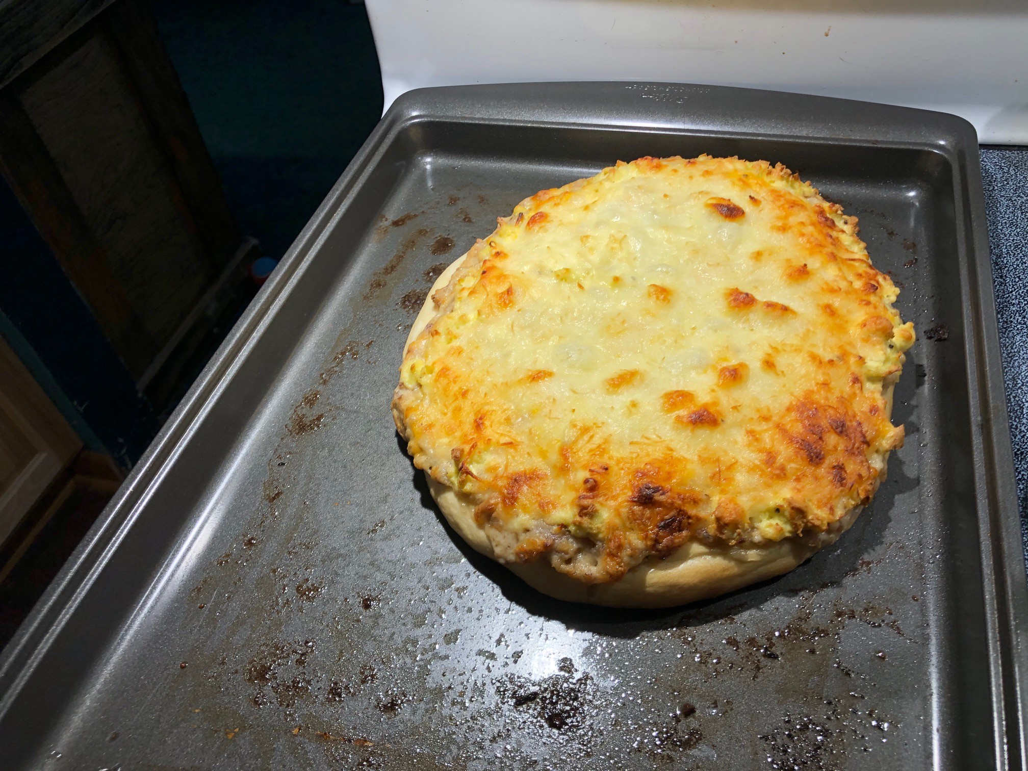 Mine was olive oil, sauce, garlic powder, salt, italian seasoning, a little of my secret spice mix, pepperoni, chopped home pickled jalapeno, then shredded cheese (romano, asiago, parmesan, mozzarella, provalone). Marvelous. This is getting really, REALLY close to what I remember Jake's Pizza to be in Fairmont. Just a few more tweaks and I should have it.