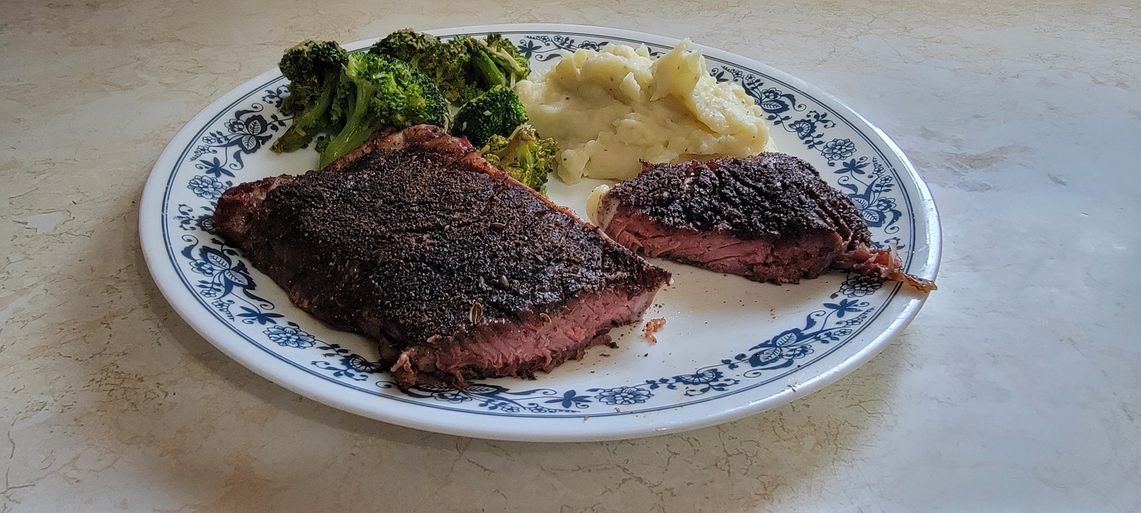 Blackened Saskatchewan rub on the steak. Broccoli with olive oil, parmesan cheese, salt and a few spices. Mashed potatoes.