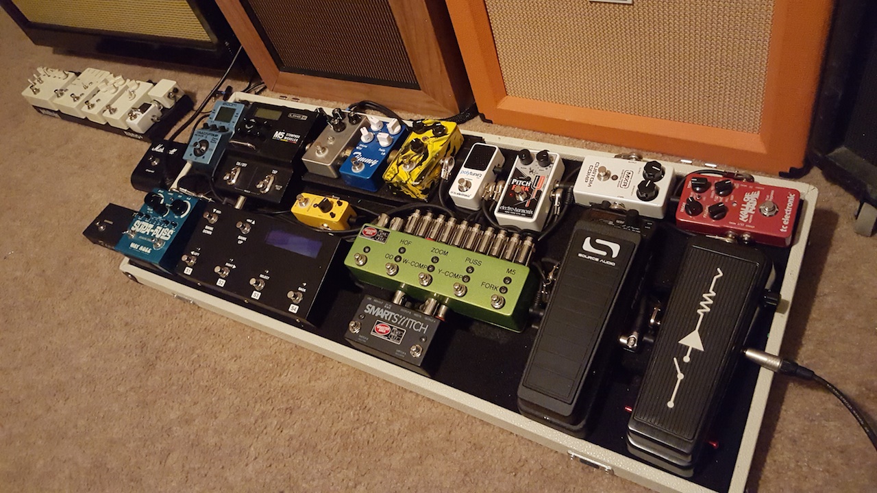 I'm laying out my board. Here's a pic. Because of the size of my switcher (Musicomlab 62M), I can't drop the cables under the board. So what short, straight 1/4" TS connectors are you guys using? I'm considering moving the 62M forward and a bit off the edge of the PT so that I can get the cables under the board. Not sure though.