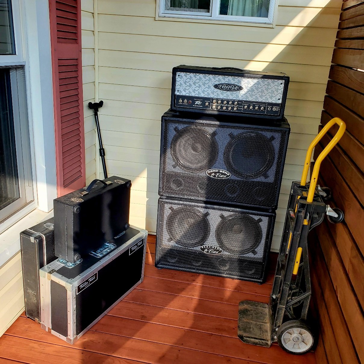 Hand truck really is the most important piece of gear a guitarist owns. I own a few.Staged on the porch ready for transport to cover band house. This stuff will stay there.