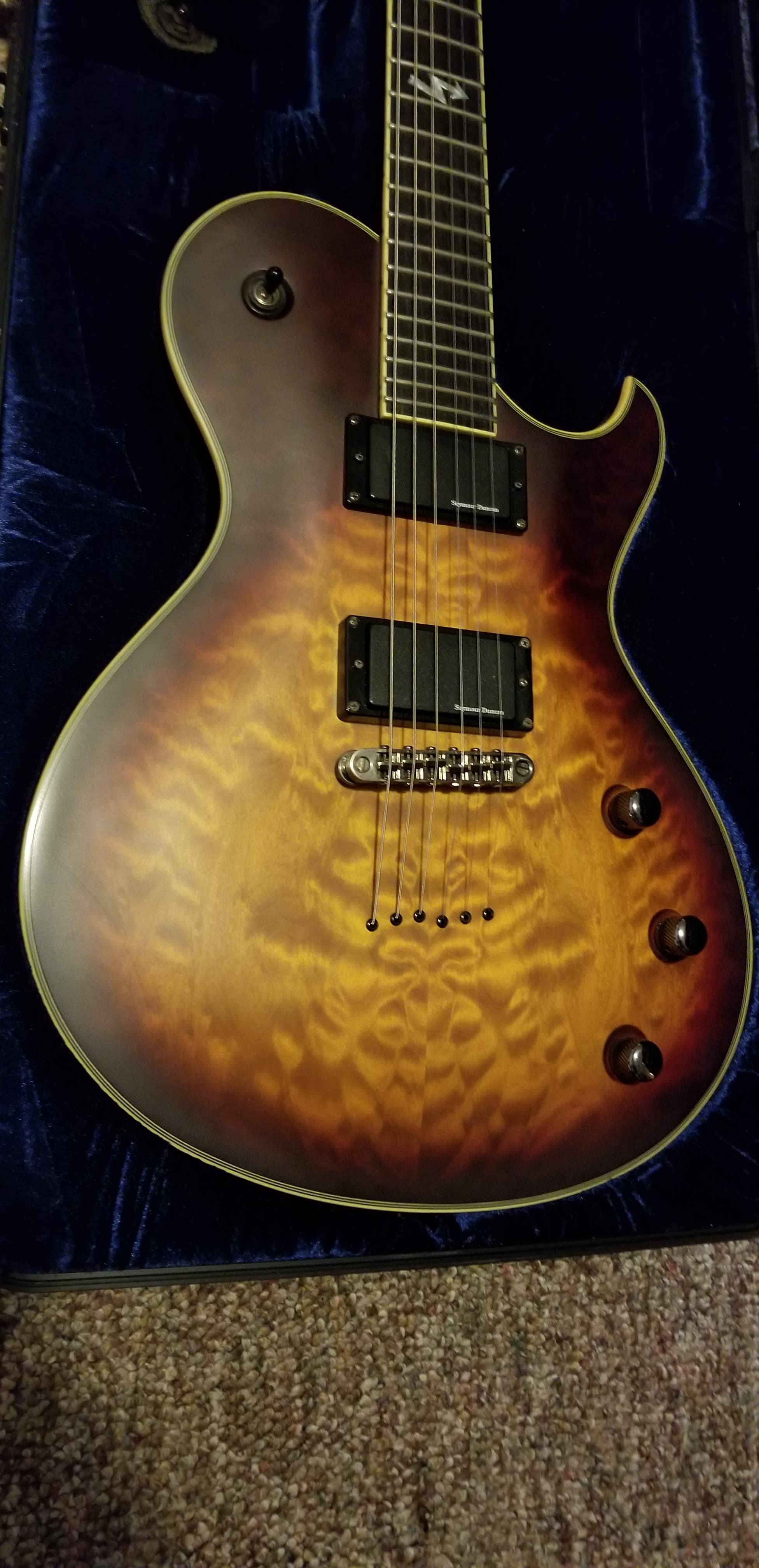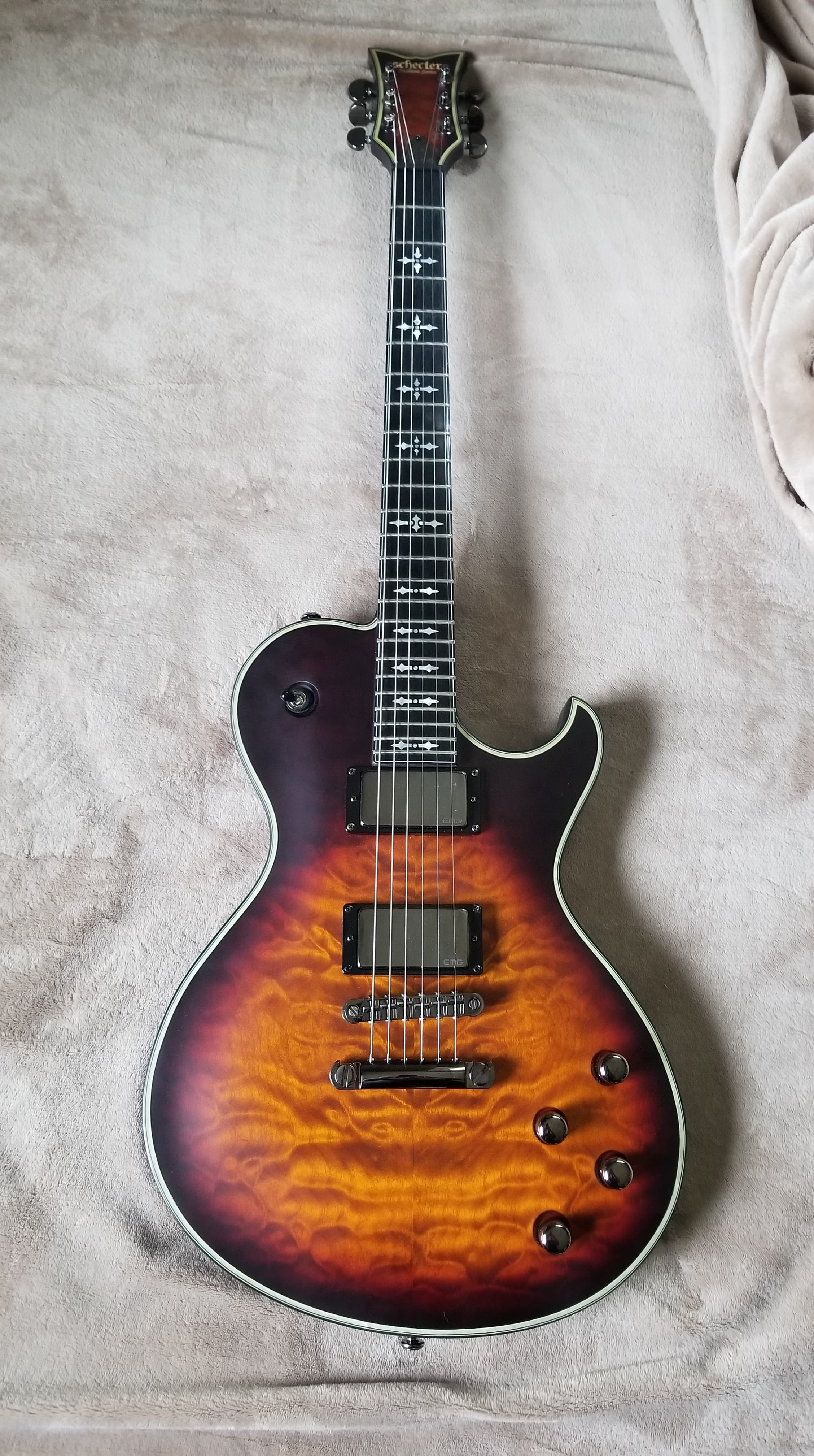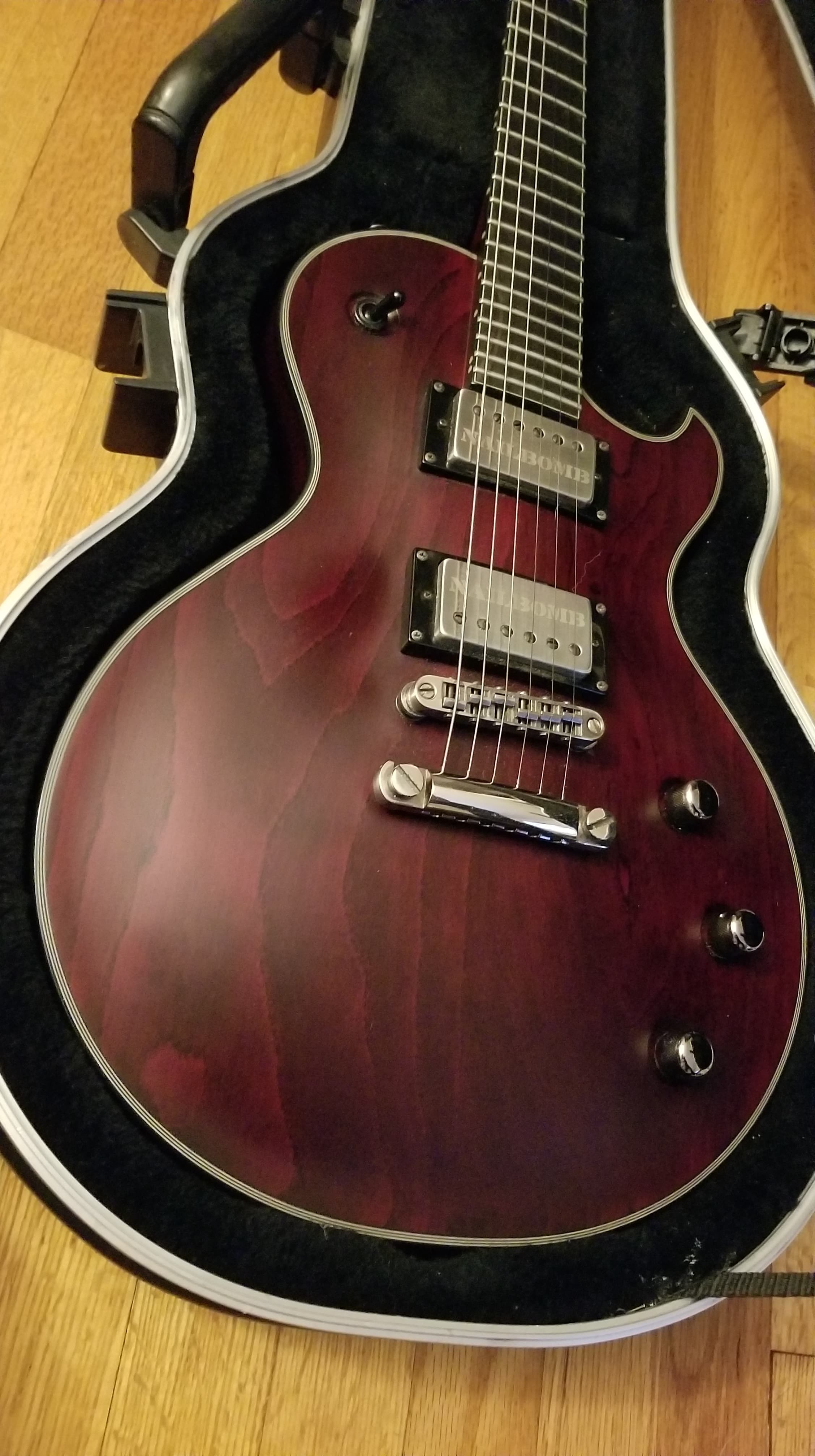 I stumbled across this on Reverb yesterday, at a great price. Solo-6 Custom, made at WMI Korea. With the features, I couldn't pass it up! Locking tuners, Graph Tech nut, Seymour Duncan Custom Custom/'59 with coil tap, Tonepros bridge, and tailpiece, ebony board... Not to mention, the hardshell case, (Schecter cases are nice as hell). That's a mouthful, for not alot of cash! It's somewhat oddly shaped, but I'll get over it!