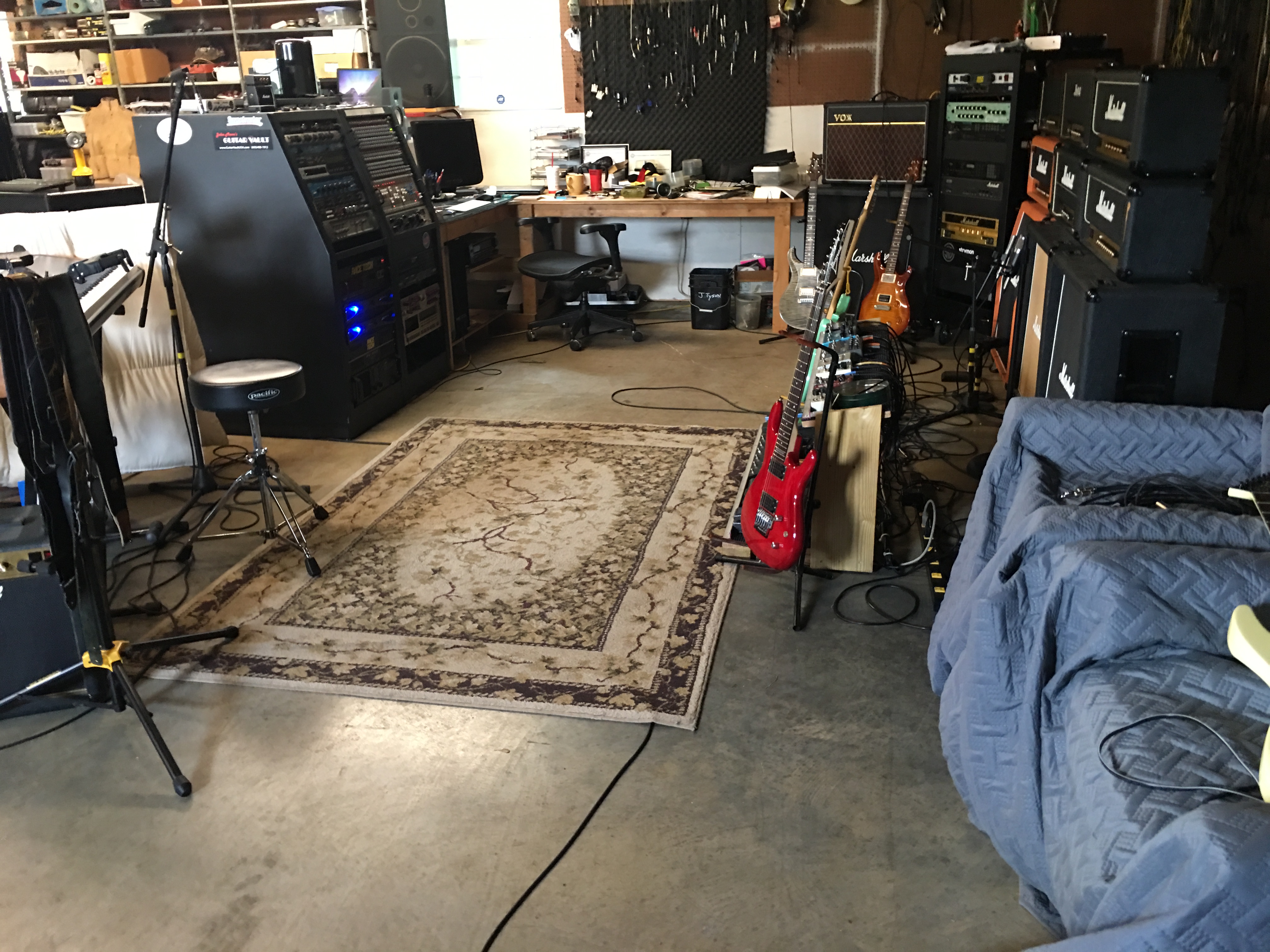 For all our material, I do the bones at home with my 5150 LBX and SM57, bass, and programmed drums on my ancient Pro Tools LE and Mbox 1. Drums, bass, and rhythm guitars/acoustic (yes with a 57).