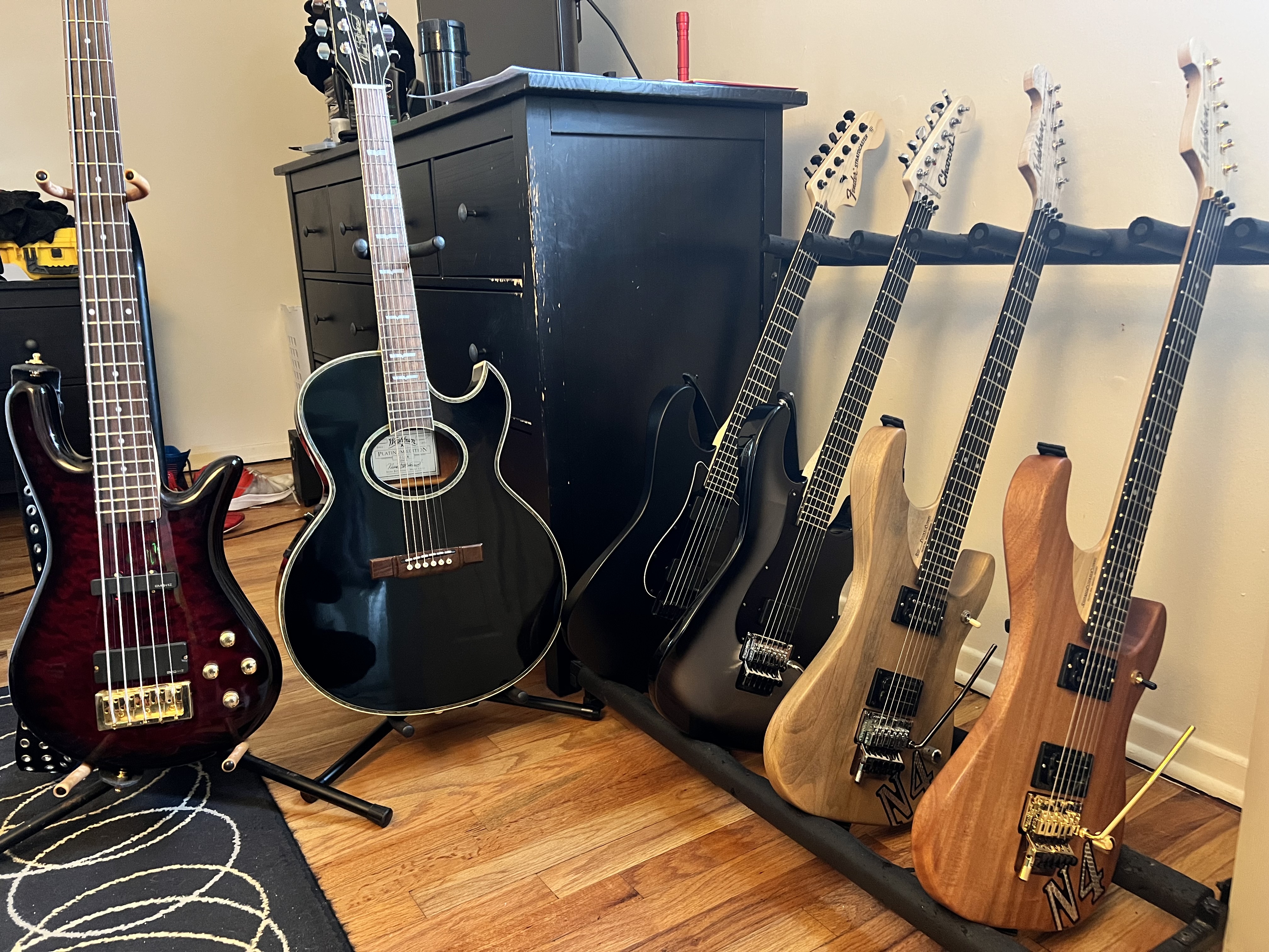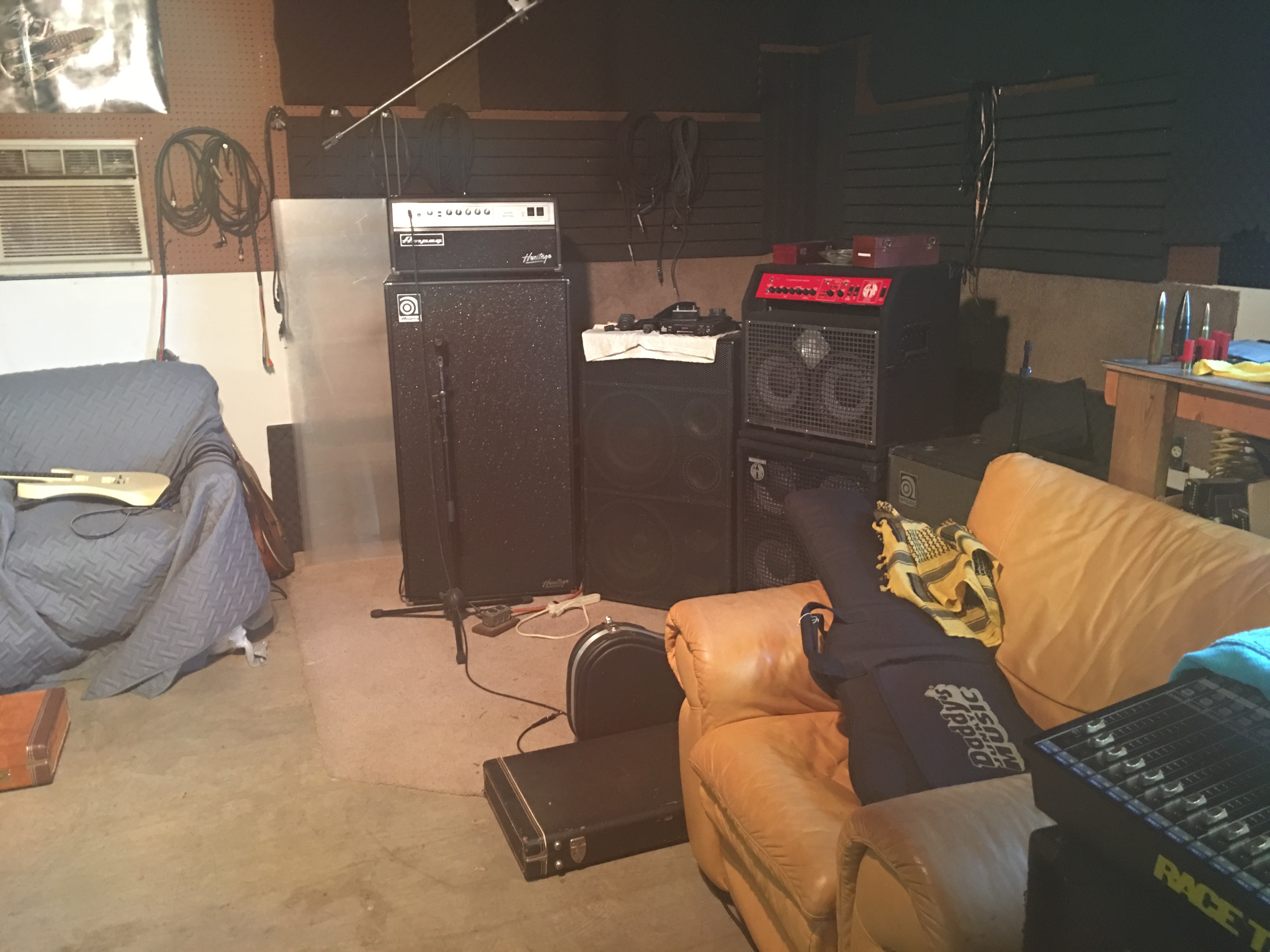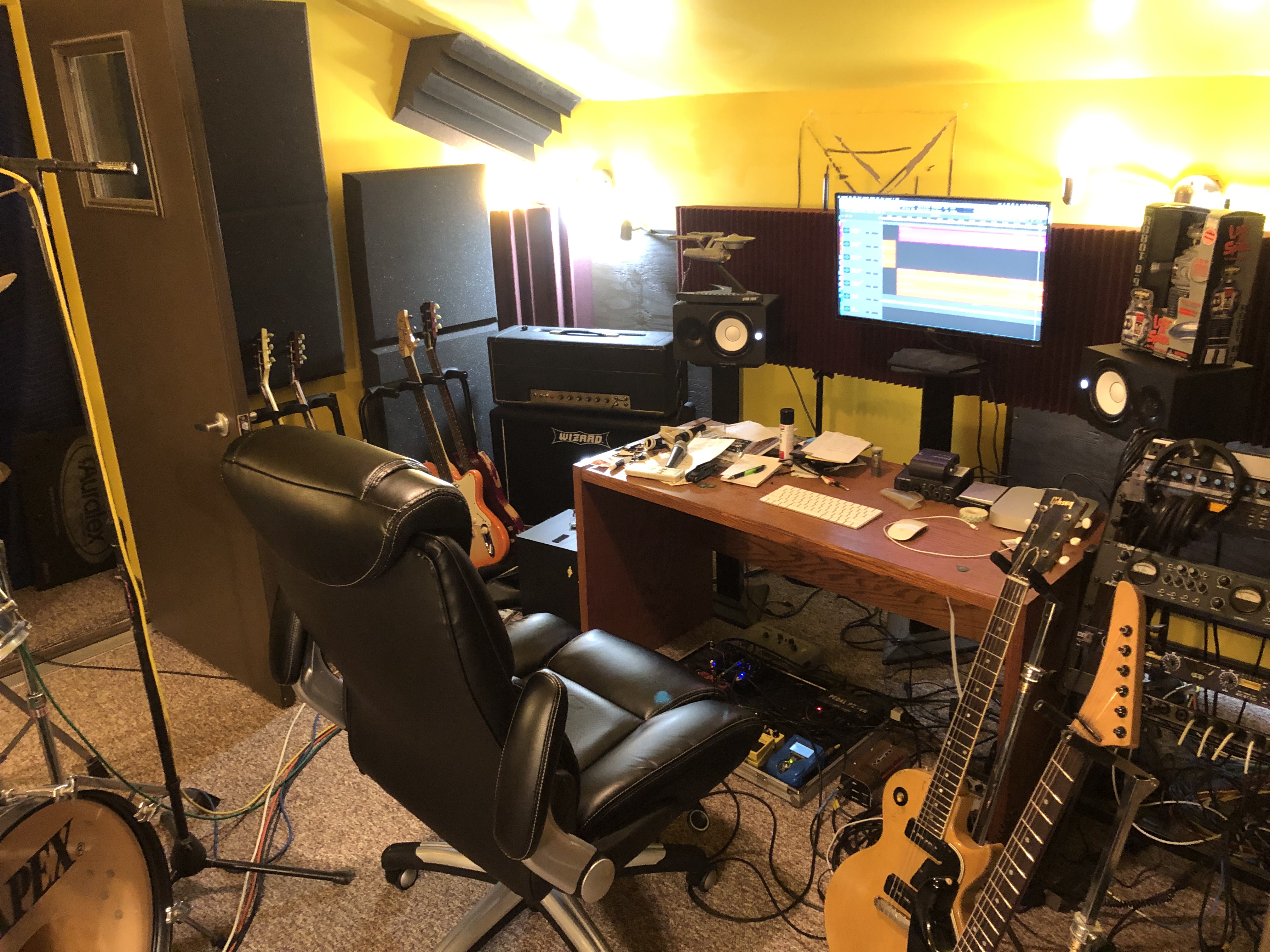 Had a spare bedroom with a big closet. Turned the closet into a space for cabinets/ amps. Recording setup is pretty basic. Mac mini, Apogee Element 88 and Yamaha HS5’s. Running Logic Pro X.