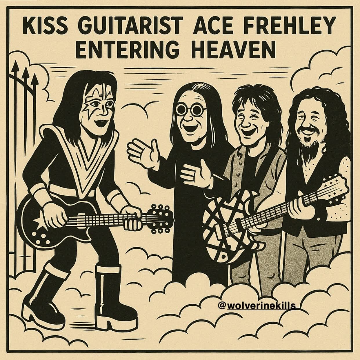Looks like 'Wolverinekills' lets AI handle the art-work. I mean, I can get past the incorrect guitars (a star on a black Les Paul...wrong Kiss-member...), if you're not in the know, but why does Ozzy have 2 right hands (or does Ed just have 1 black sleeve on a grey suit?) and WTF is up with Dime's right hand?!