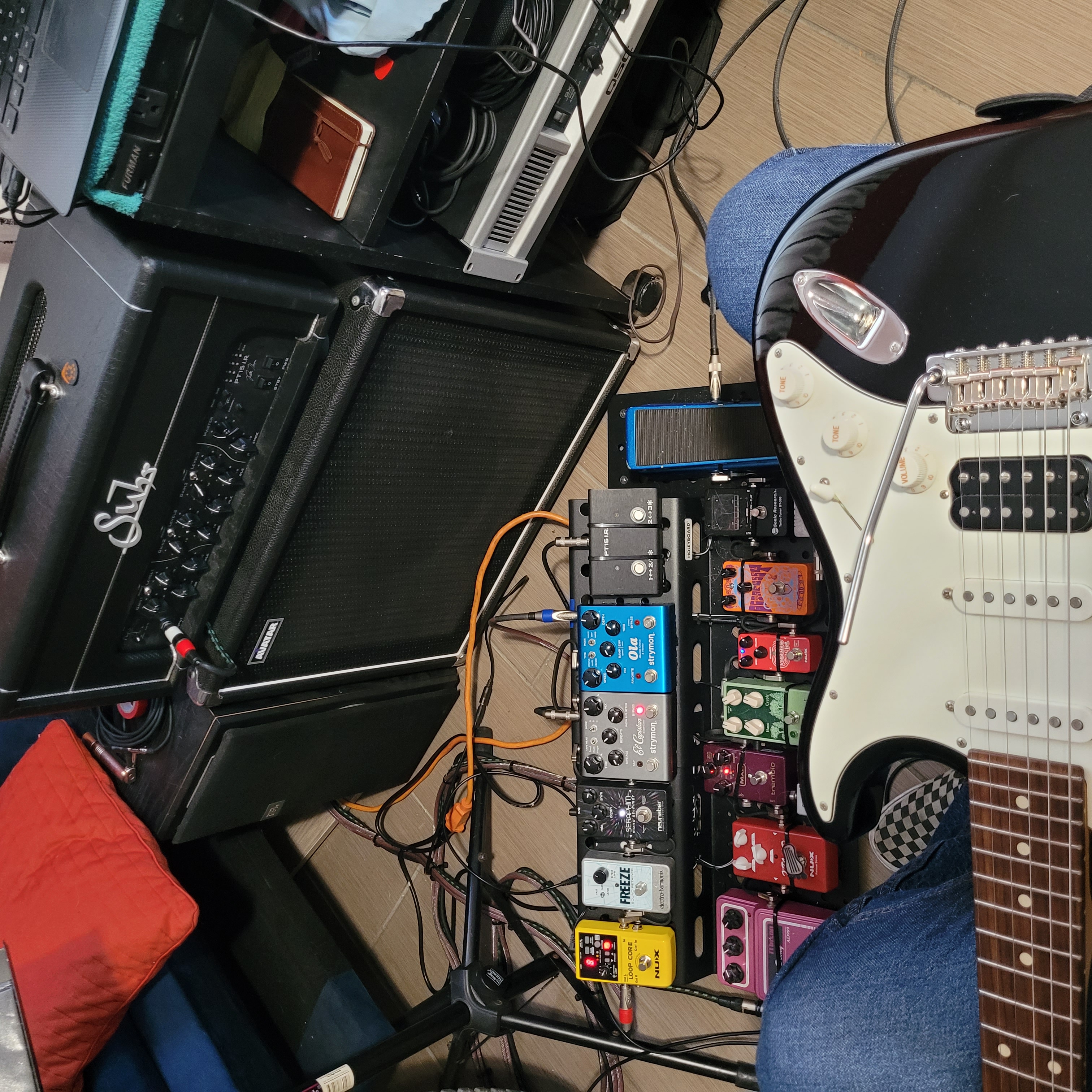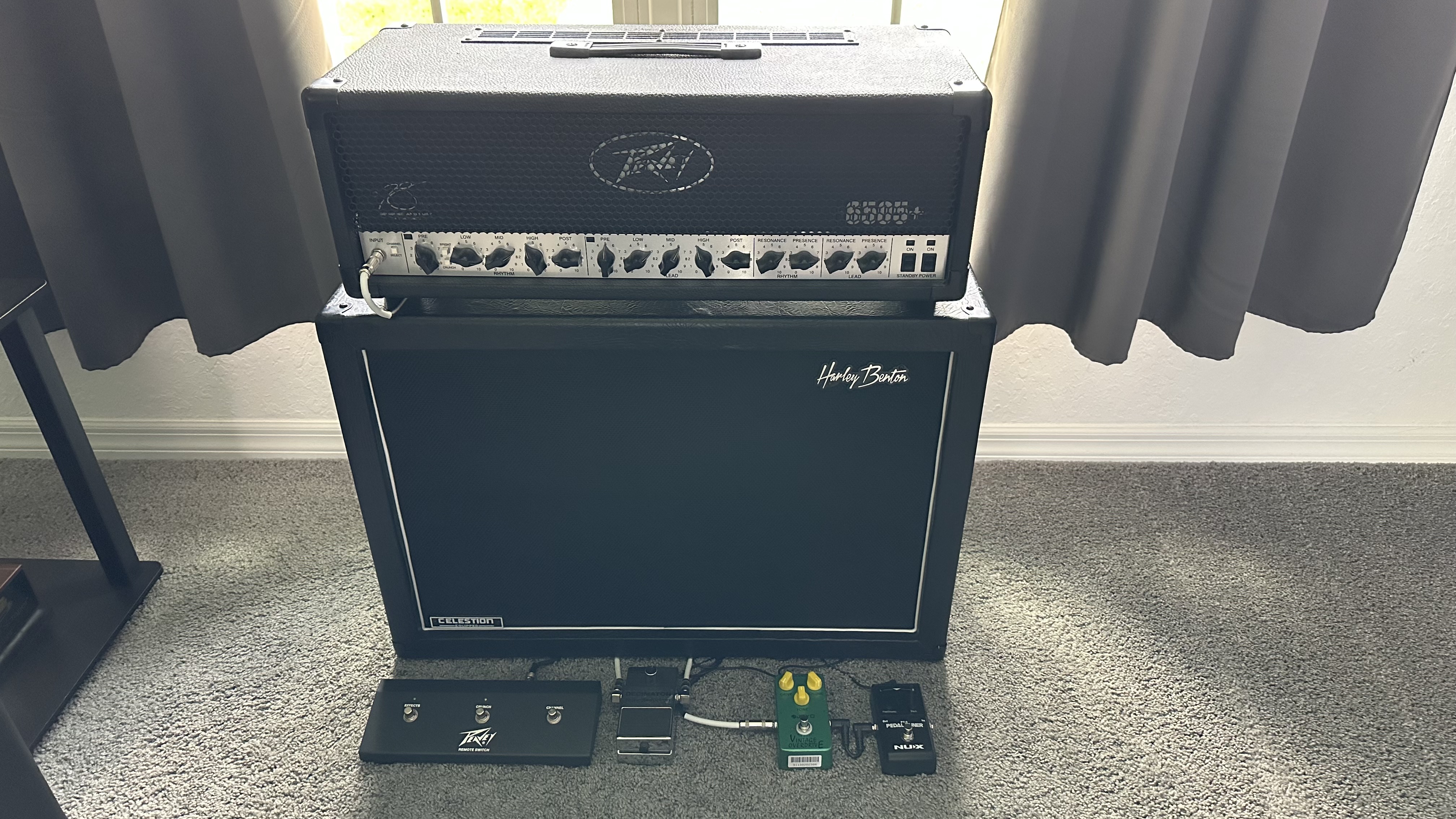 USA made Peavey 6505+, Harley Benton 2x12 loaded with V30s (don't sleep on these things it sounds fantastic), ISP Decimator, JOYO Overdrive (808 clone) and NUX Tuner