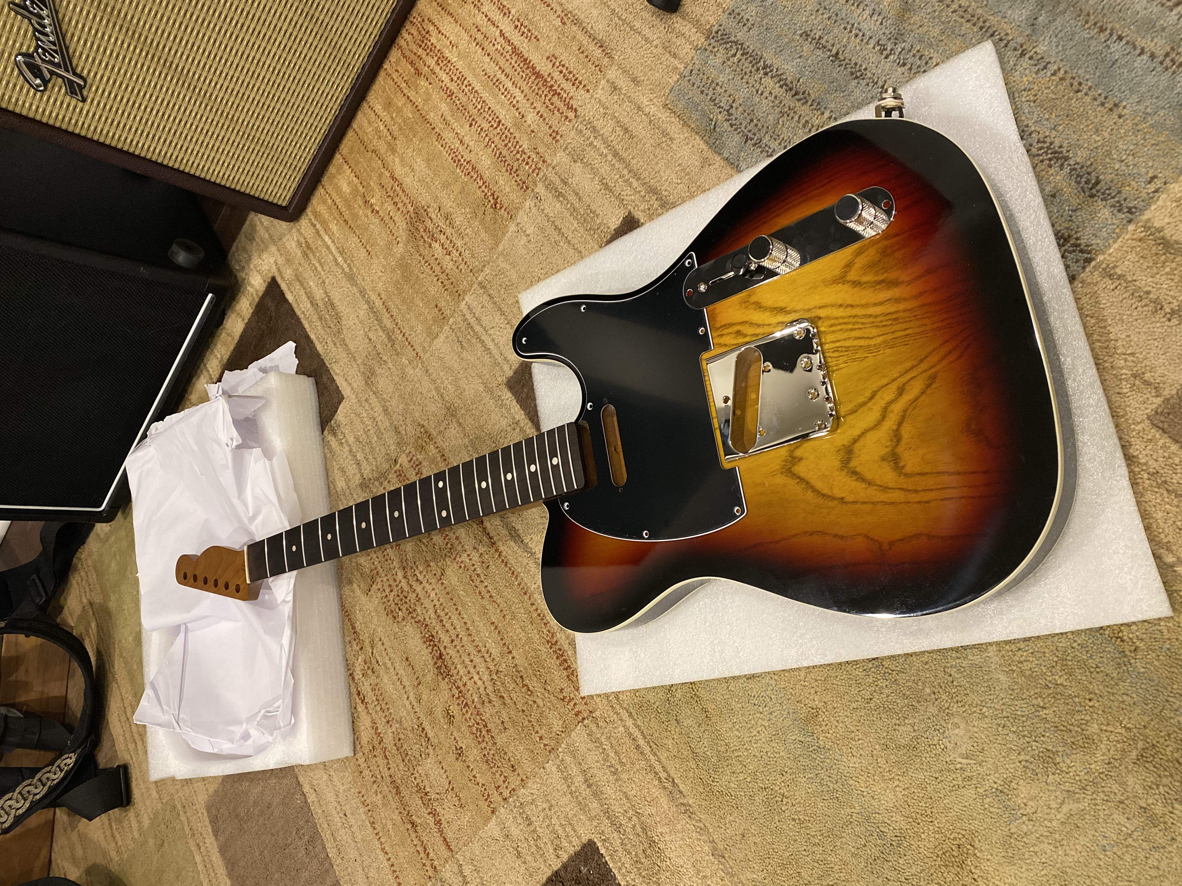 Body is swamp ash over chambered alder - super light! Double bound and finished in a thin nitro 3 burst. Almost too thin as there’s some visible sinking into the grain but I’m not complaining. I took a chance on it and wasn’t expecting too much as it was very inexpensive, but I’m pleasantly surprised. Neck pocket needs a tiny bit of shaping and it will be a nice snug fit.