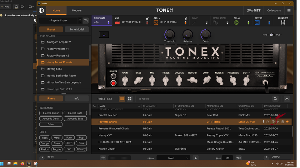 Made a capture using my amp and cabinet. Cabinet is dual mic’d on one speaker. Used a 57 and VR1. Made the capture using the CAPTURE box with mics plugged into my Apogee interface. Tried to run Tonex in Logic again with no luck. Tried Amplitube and it would open but could not figure out how to import the capture from Tonex to it. Eneded up loading the capture into the Tonex One and plugged it into the interface. Seems dumb to have to do that, or I cannot figure it out.