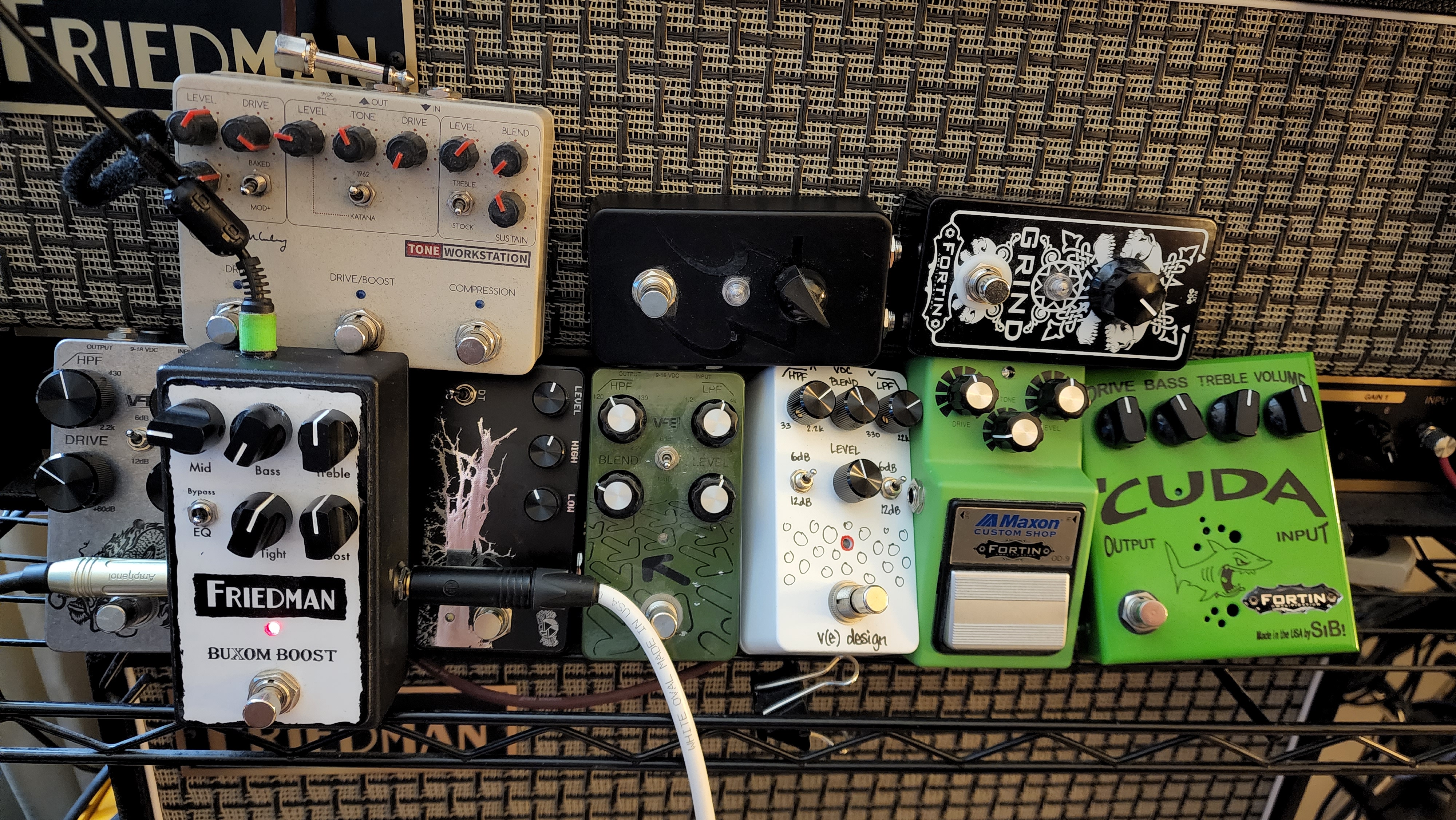 So I was throwing all the boost I could find lying around against my triple rec tonight. So playing direct in to a Suhr RL into an interface with IR's I was digging the Friedman boost, the Fortin modded CUDA and the VFe Standout v2 the most. I was kinda surprised about the Standout v2 cause usually I like v1 more. The Fortin modded Maxon OD9 was also really good and made it sound really aggressive AF.