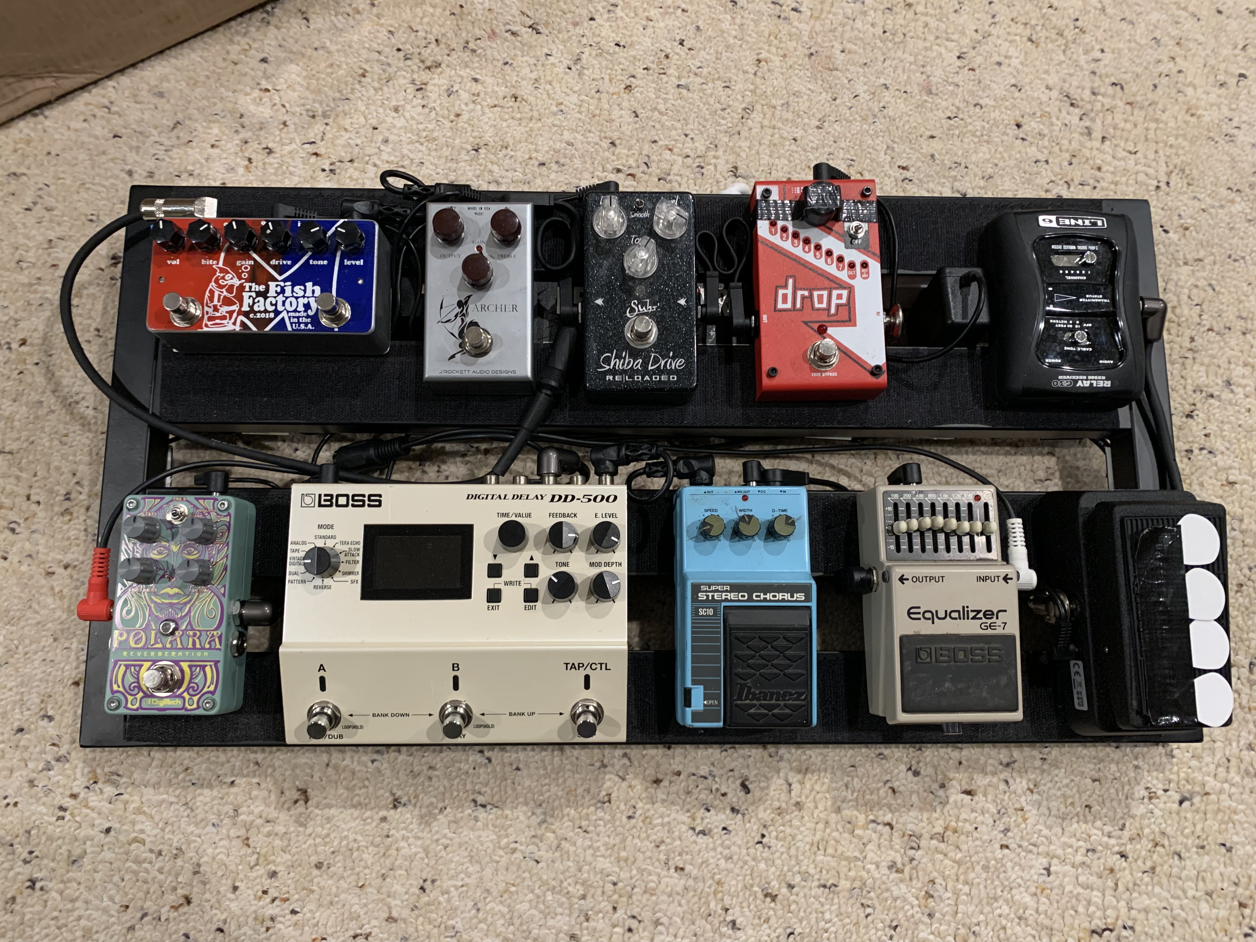 I guess my question is why did you decide to put all of the pedals in order of the signal chain? I feel like people lay out pedalboards based on the signal flow and not the work flow, and get used to the layout, rather that getting the layout to work for you. For example, I don't switch my EQ off and on much, but I do use my boosts often. Why would the EQ need to be on the bottom, where it is easy to access, and the boosts up top? What if the Chorus and EQ were up top and the boosts on the bottom?