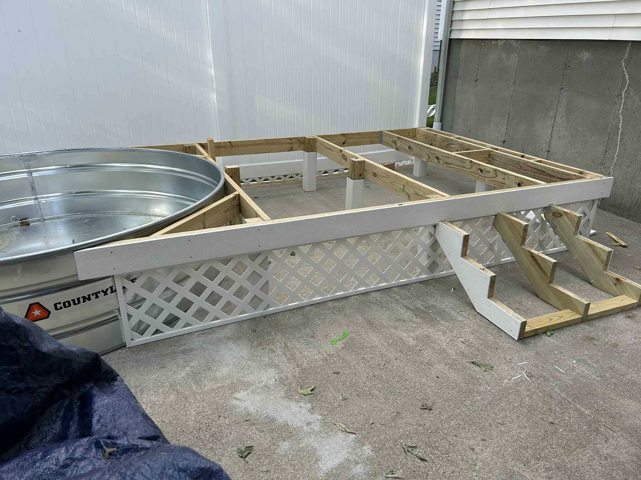 I'm sure Floyd eye is gonna give me a verbal berating for not using beams under the joists, but the span is not that big and it's just for my wife, so she can sit in a pool. She always wanted a pool, but our yard is too sloped and I'm not staying in MA. I'm not looking forward to trying to figure out the sand pump. More joists to go in, and more supports, stairs leveled, but I wanted to get the frign lattice done first, as it has a frame and is a pain in the ass. It's not really up to code, but for a floating deck, it will be fine. I have cedar to go on top. Fucking rains every Saturday which is the only day I have to work on this. I hate carpentry. Too many fucking tools required to do this shit.