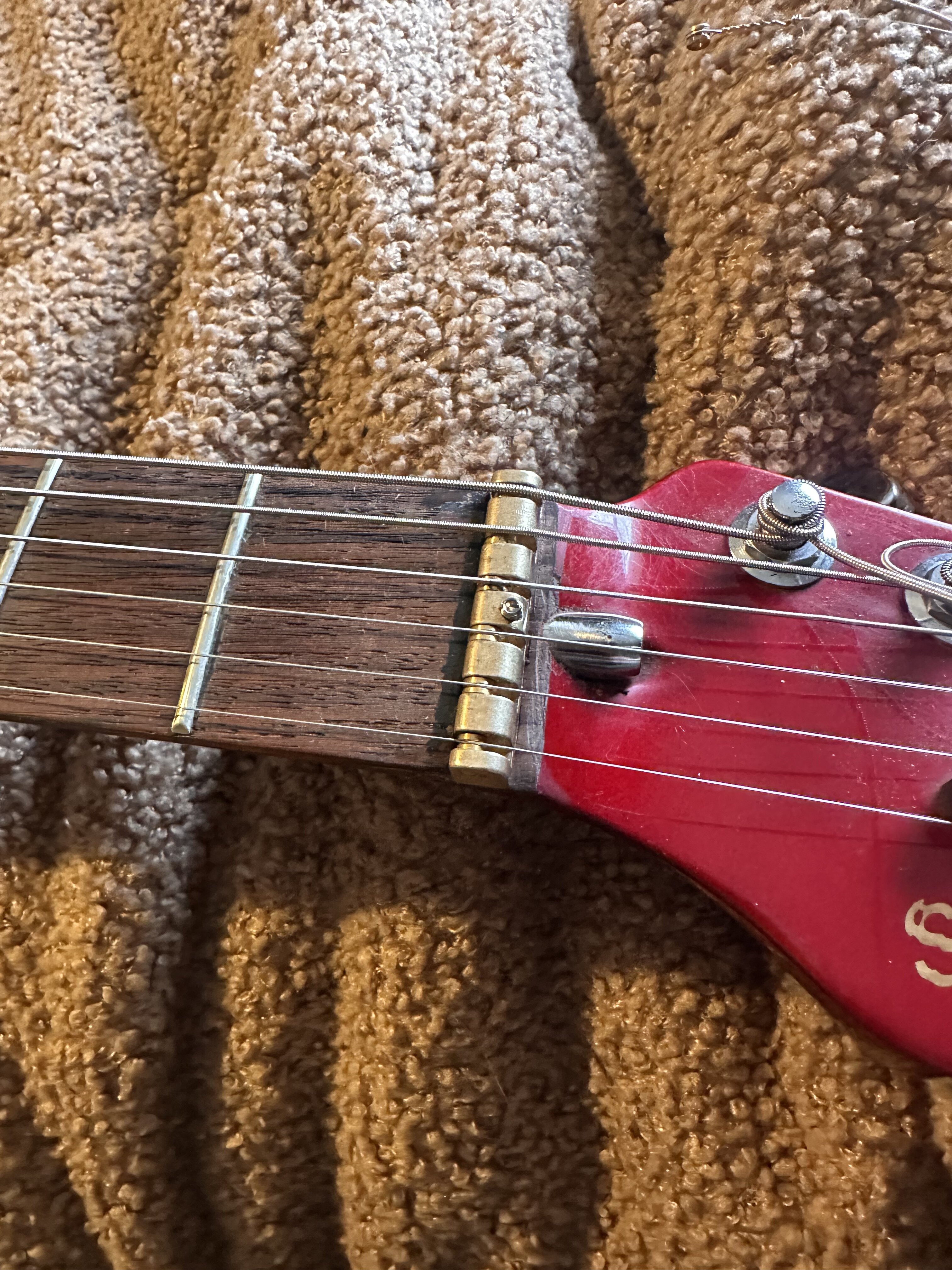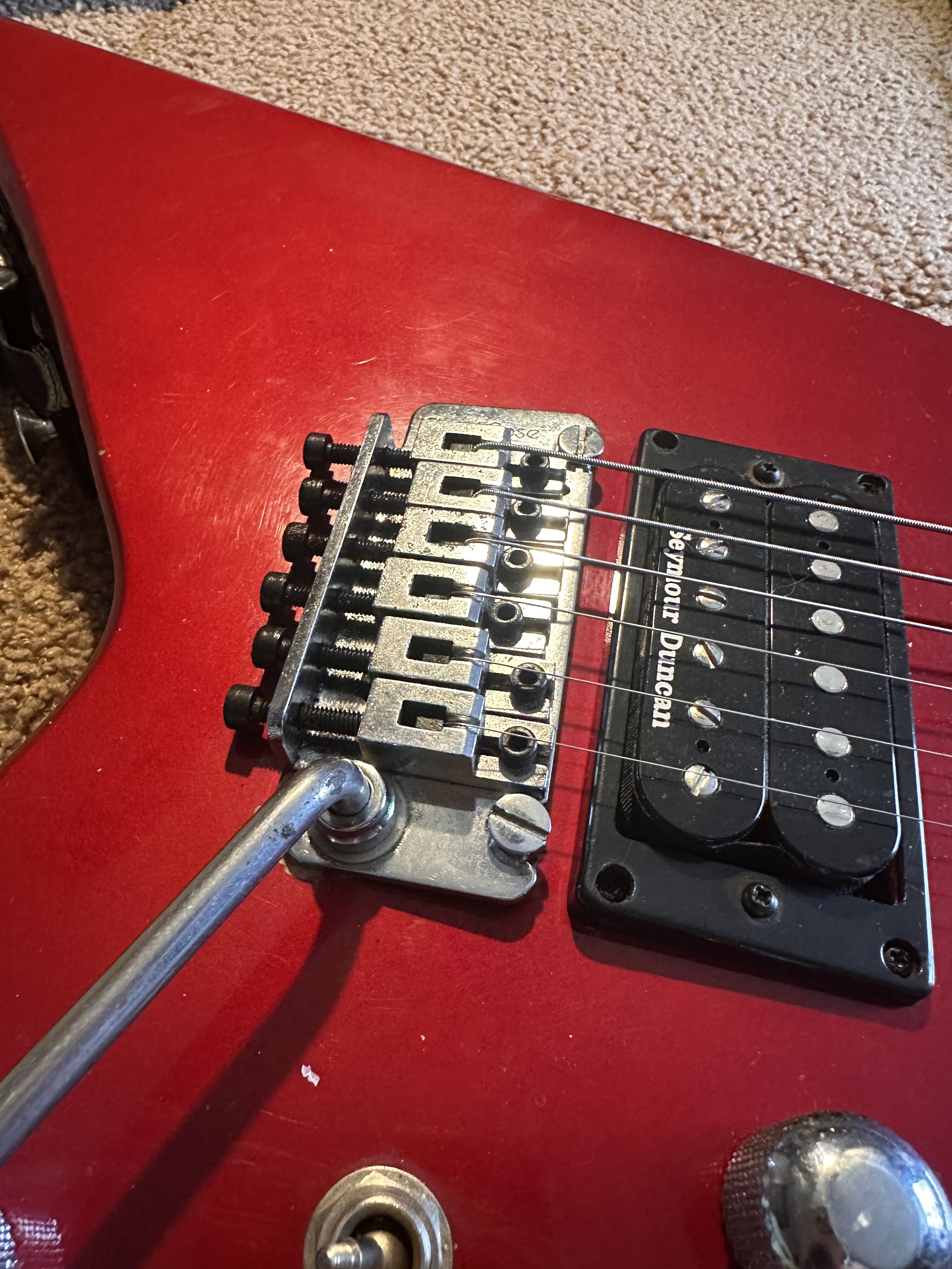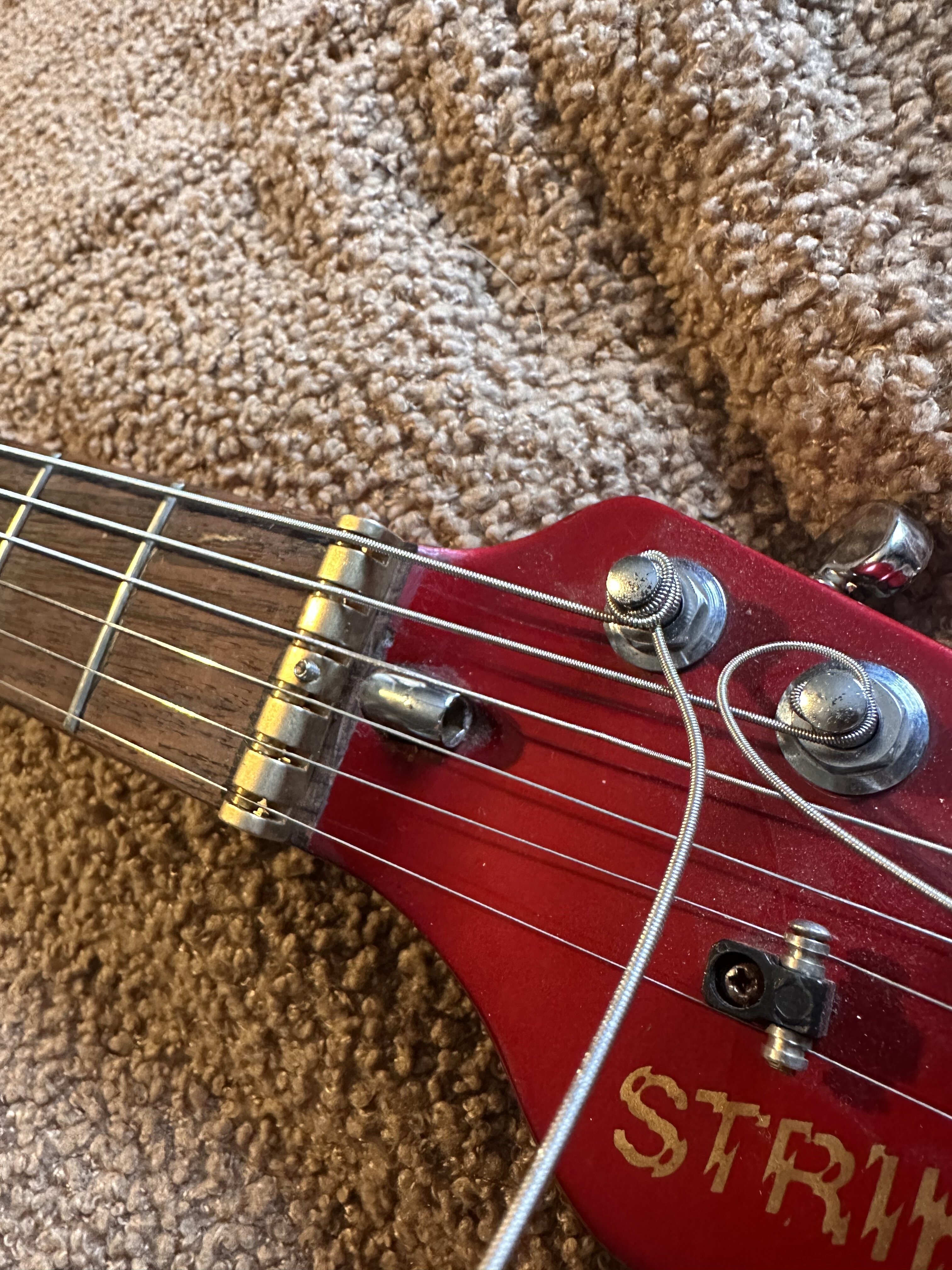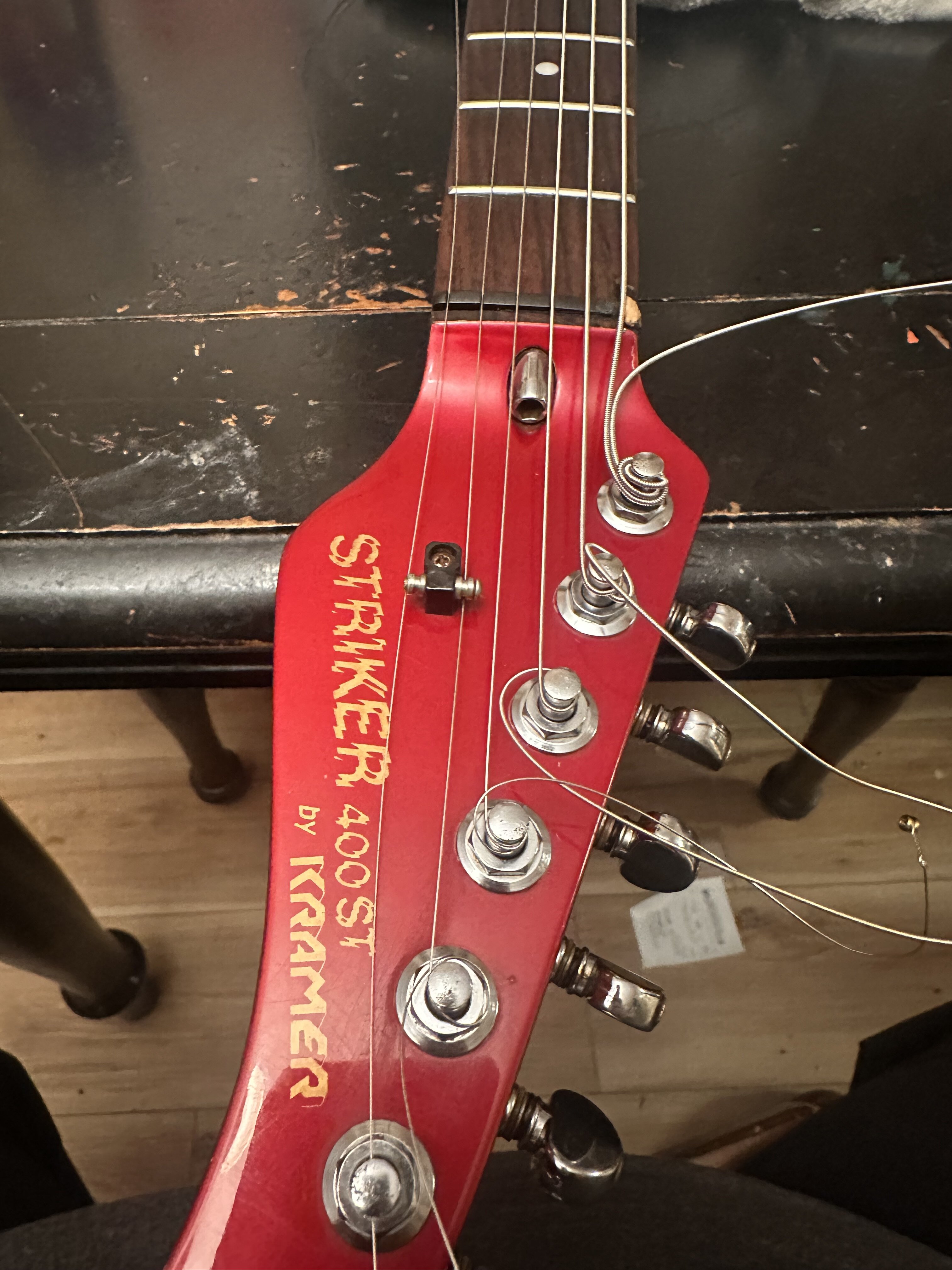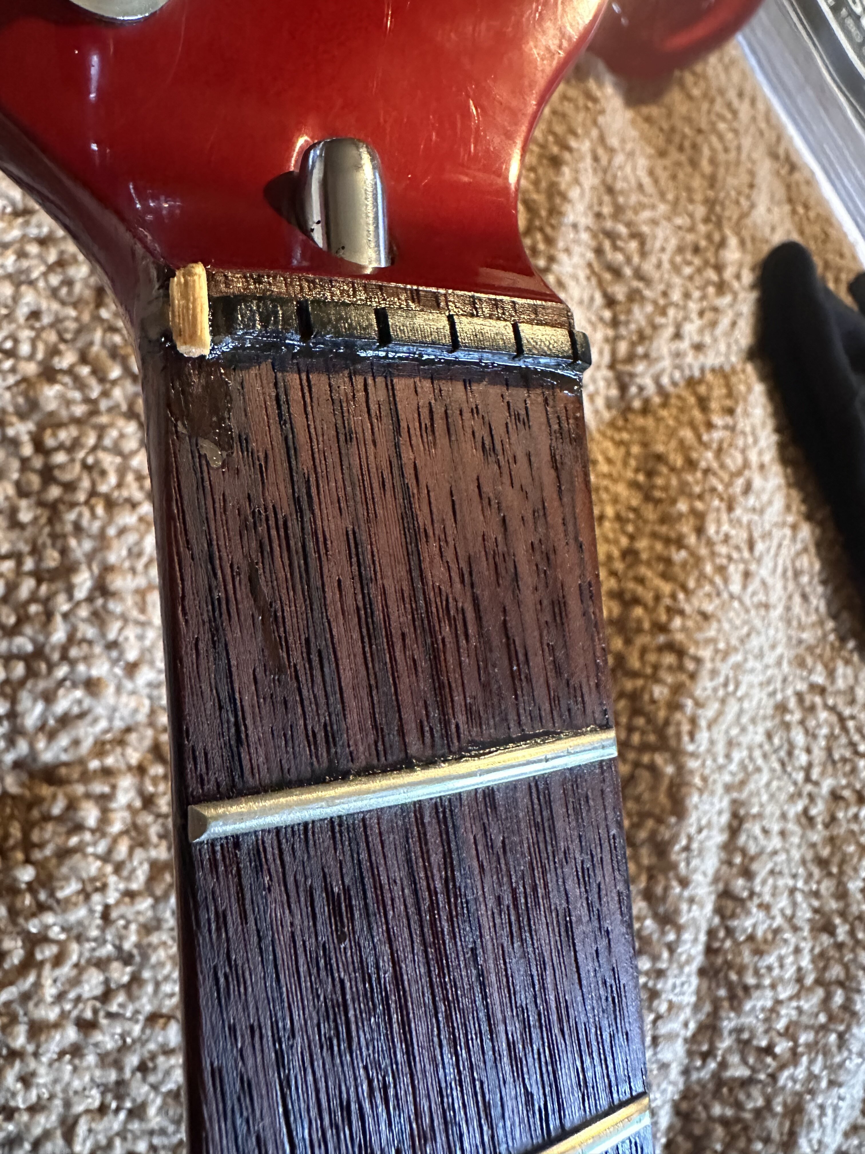 Mid 80’s Kramer 400st v. Floyd rose standard bridge. Standard nut. Looked kinda like it could have had a locking nut at one time. Just an odd looking cut. Someone apparently did some nut work and it was all fucked up and not square at all. Hopefully pictures will show what I mean. After removing the old nut I straightened everything with my fret files. Worked great. Decided to go with a brass roller nut. Traced the radius on it and then used my bench top sander to start sizing it. Thought I had it and installed it. Still a little too high. Still counting it as a win and not really that complicated to do. Helps to have a little knowledge of equipment and guitars I suppose. My equipment is outside on my back deck so I will fix it when it warms up. Anyway here’s some pics…..these are the new nut….
