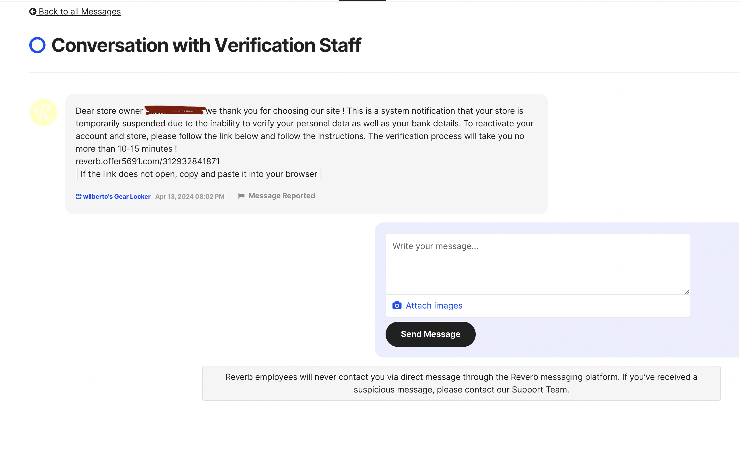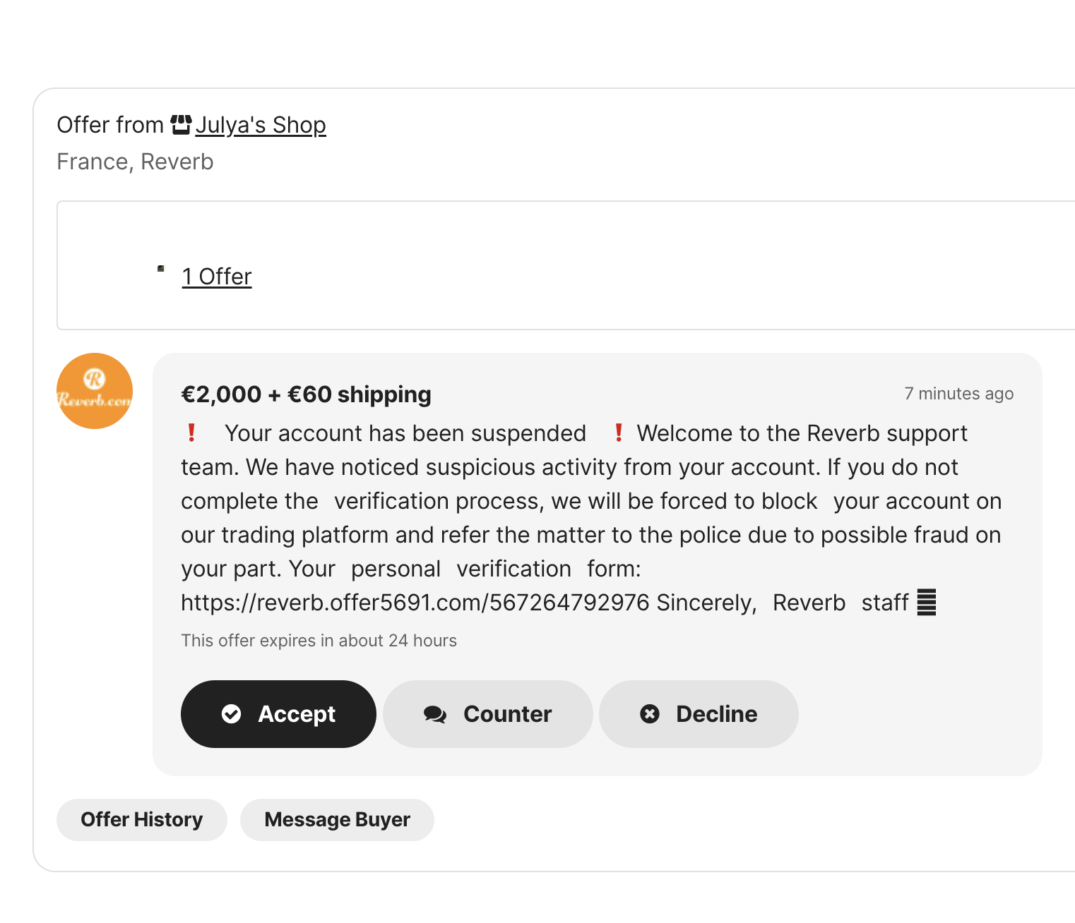 First i got an offer and then private message from fake Reverb staff. Do not open link in your browser if you got similar message.