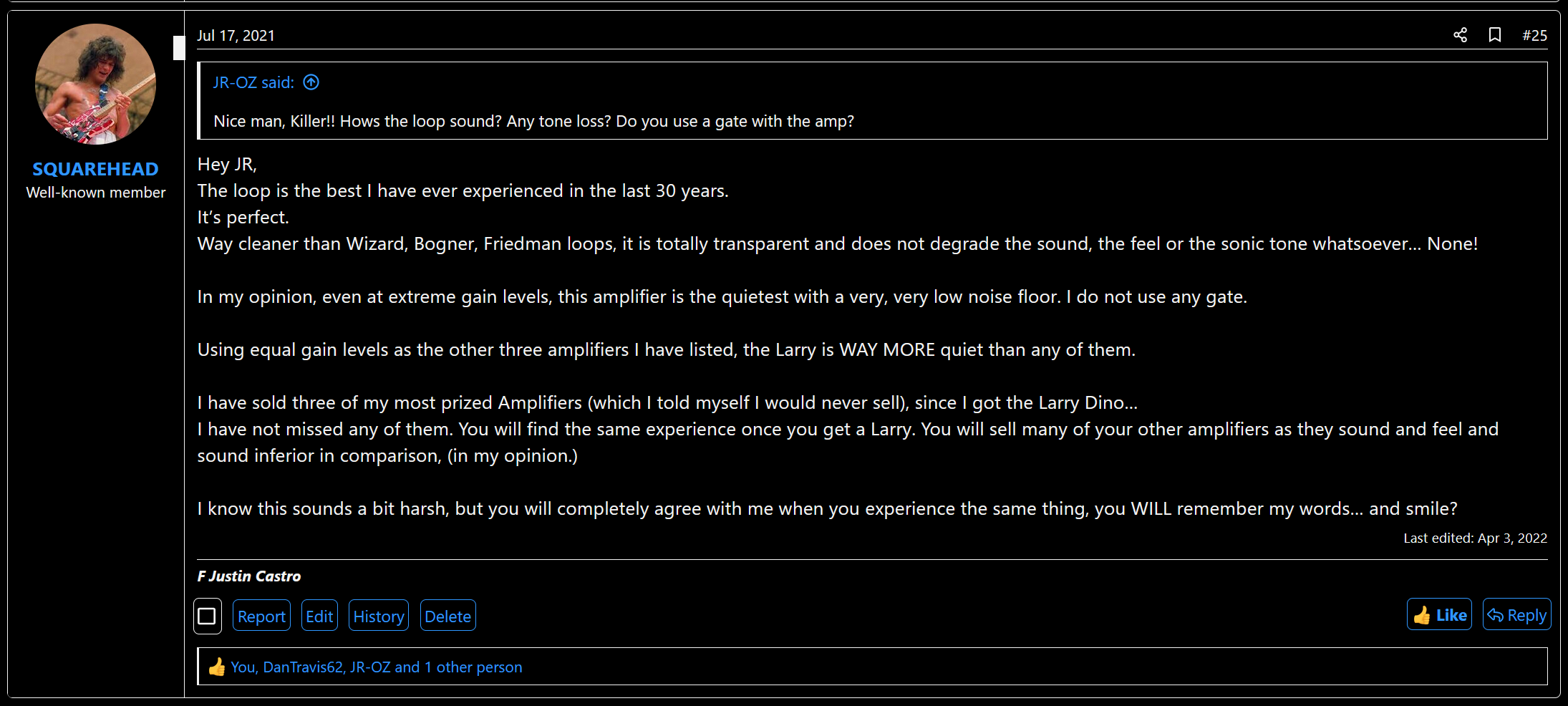 Out of curiousity, what is the reasoning behind a parallel loop in your opinion? I do not run any oedals in loop besides gateThis is exactly the reason why anyone who dares to use a pedal in front of a Larry amp has to pay a US$5,000 fine- and why all Larry amps have an FX loop that can only (!) be operated in parallel, not in serial*