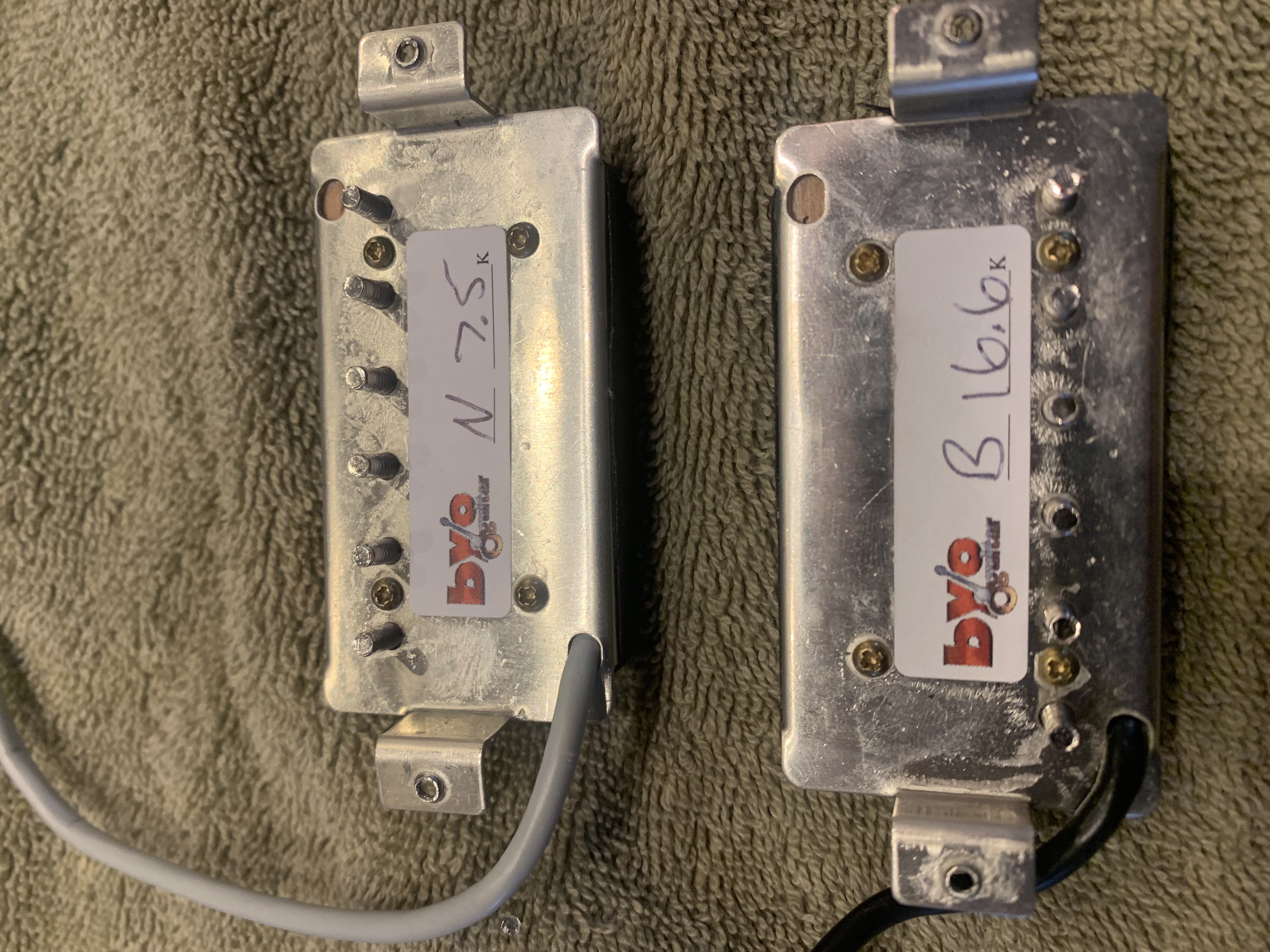 JB/Jazz copy pickups. Sound just like originals that I have also owned. Bridge 16.6k neck 7.5k, 4 conductor wiring full leads, wax potted. Les Paul spacing. Selling because Im going back to lower output PAF pickups. Save some bucks over name brands.