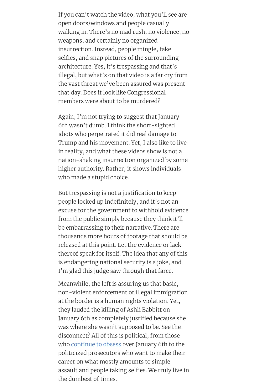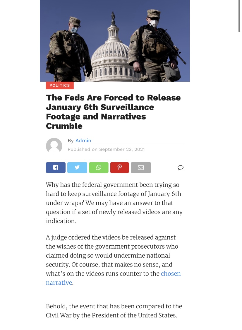 The fact that some people actually watch and believe the ‘official’ pictures and video still boggles my mind… Every time I see it, I laugh, …you just have to laugh???It's amazing how much spin doctoring the media did for the sixth, when juxtaposed with the literal burning city blocks, secession, and dead bodies from the antifa?️?️ot riots that went on for a year or more.