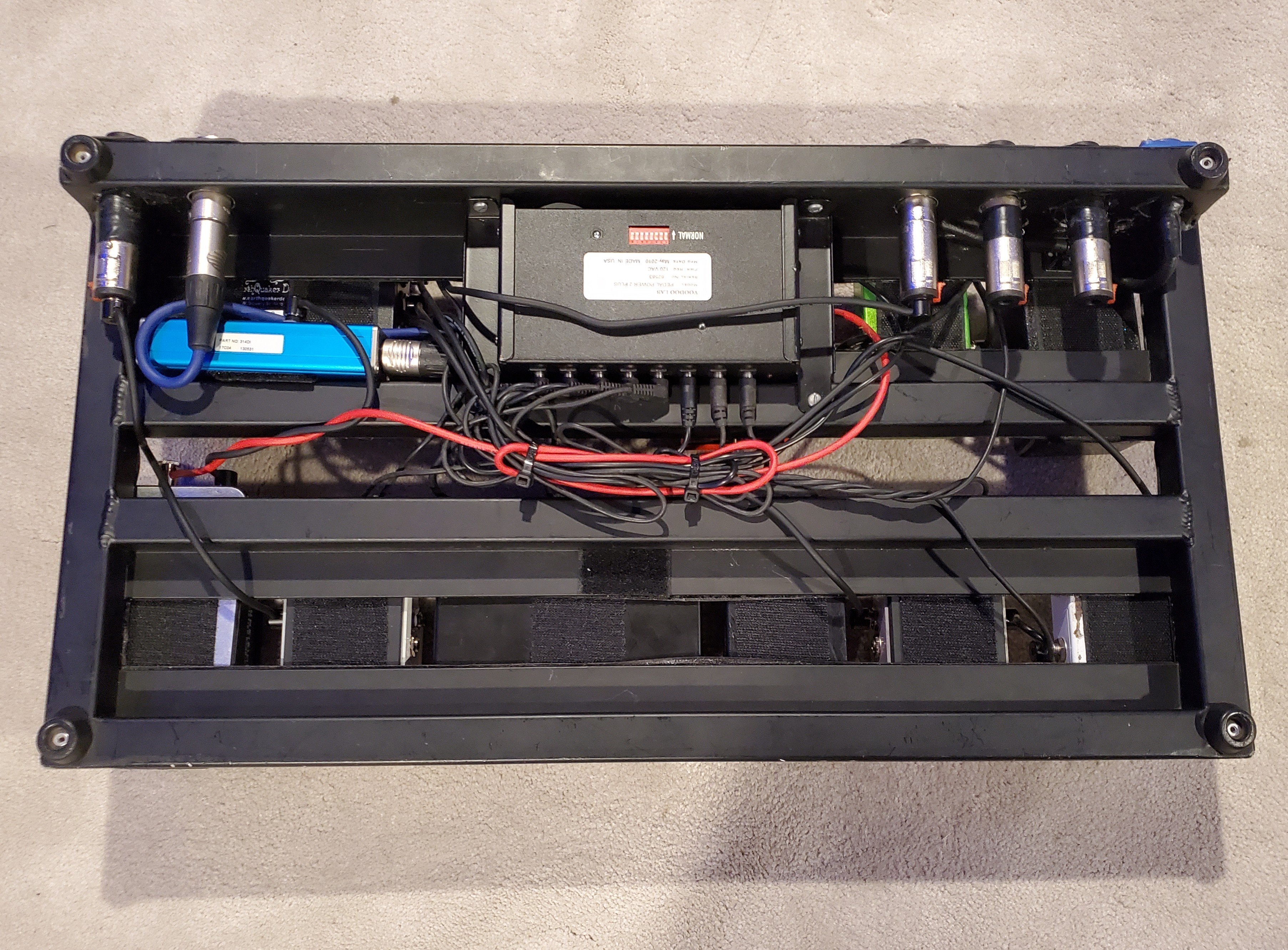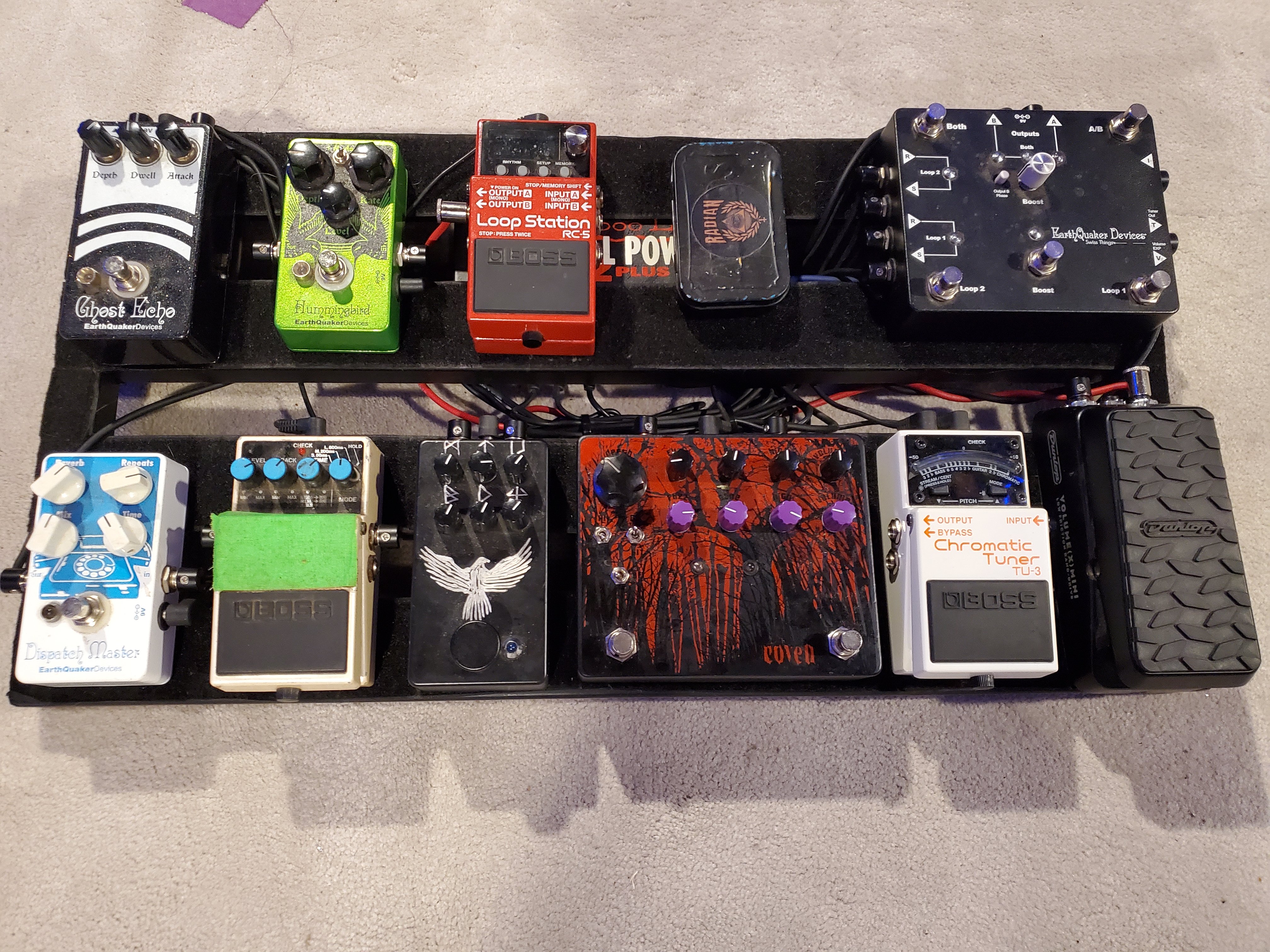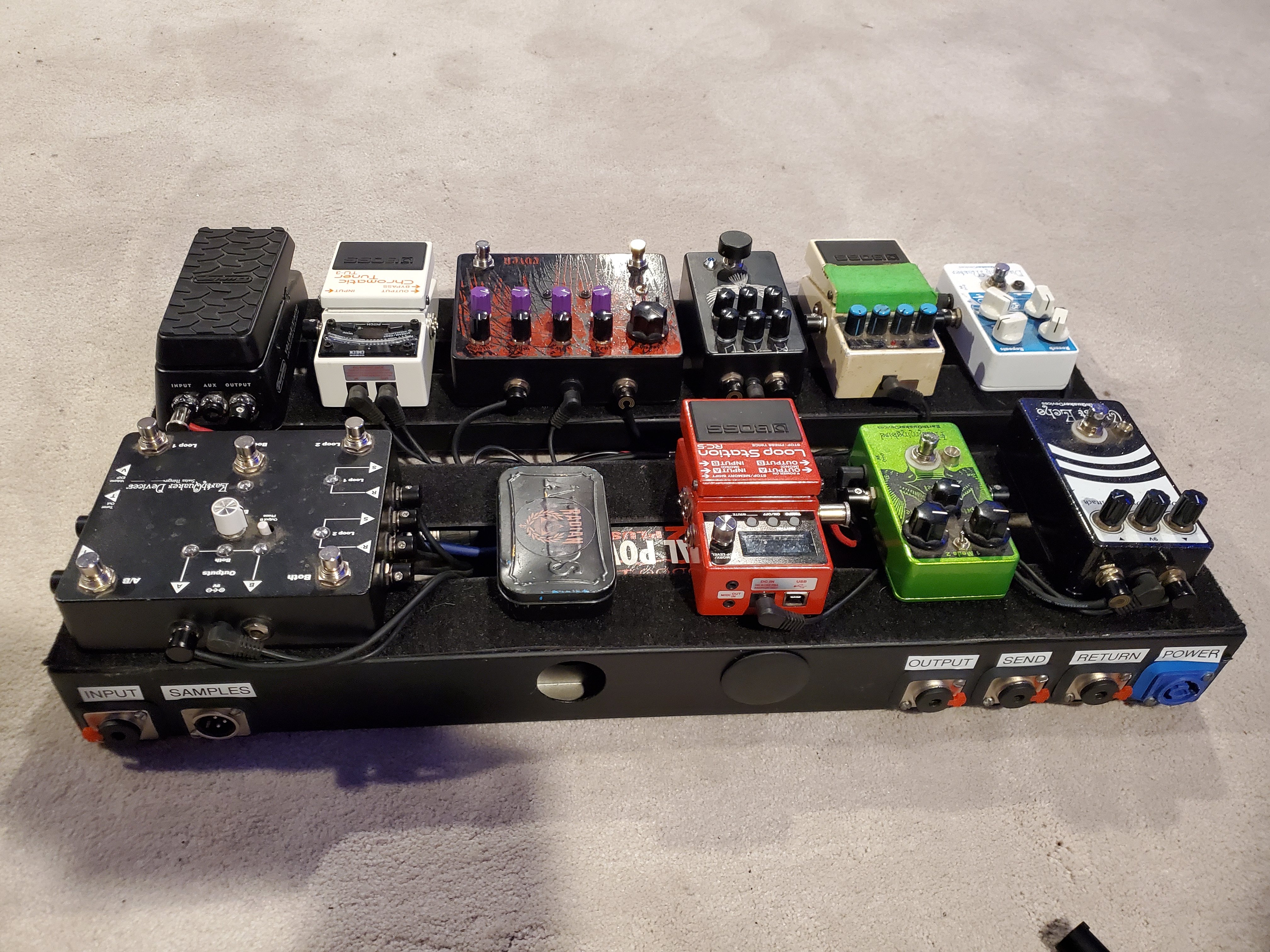 I sold my old pedalboard to a friend, Mike Burns of the band Radian today. I helped him get it all set up and layed out. Came out pretty good. He's still using his pedal platform amp right now, so it's all in front, but eventually he's going to put his delays and reverb in the loop and run 4CM. Here's how it turned out.