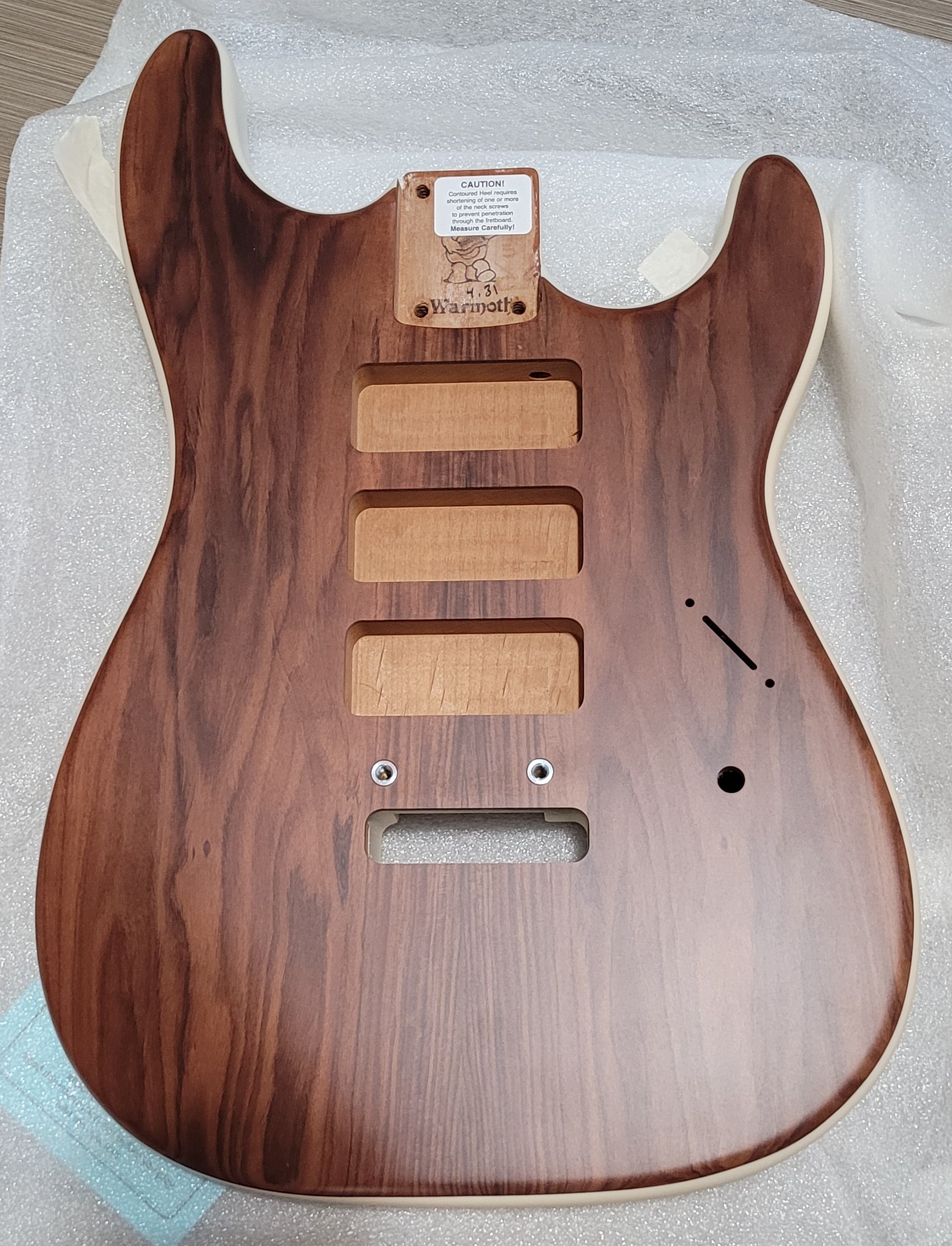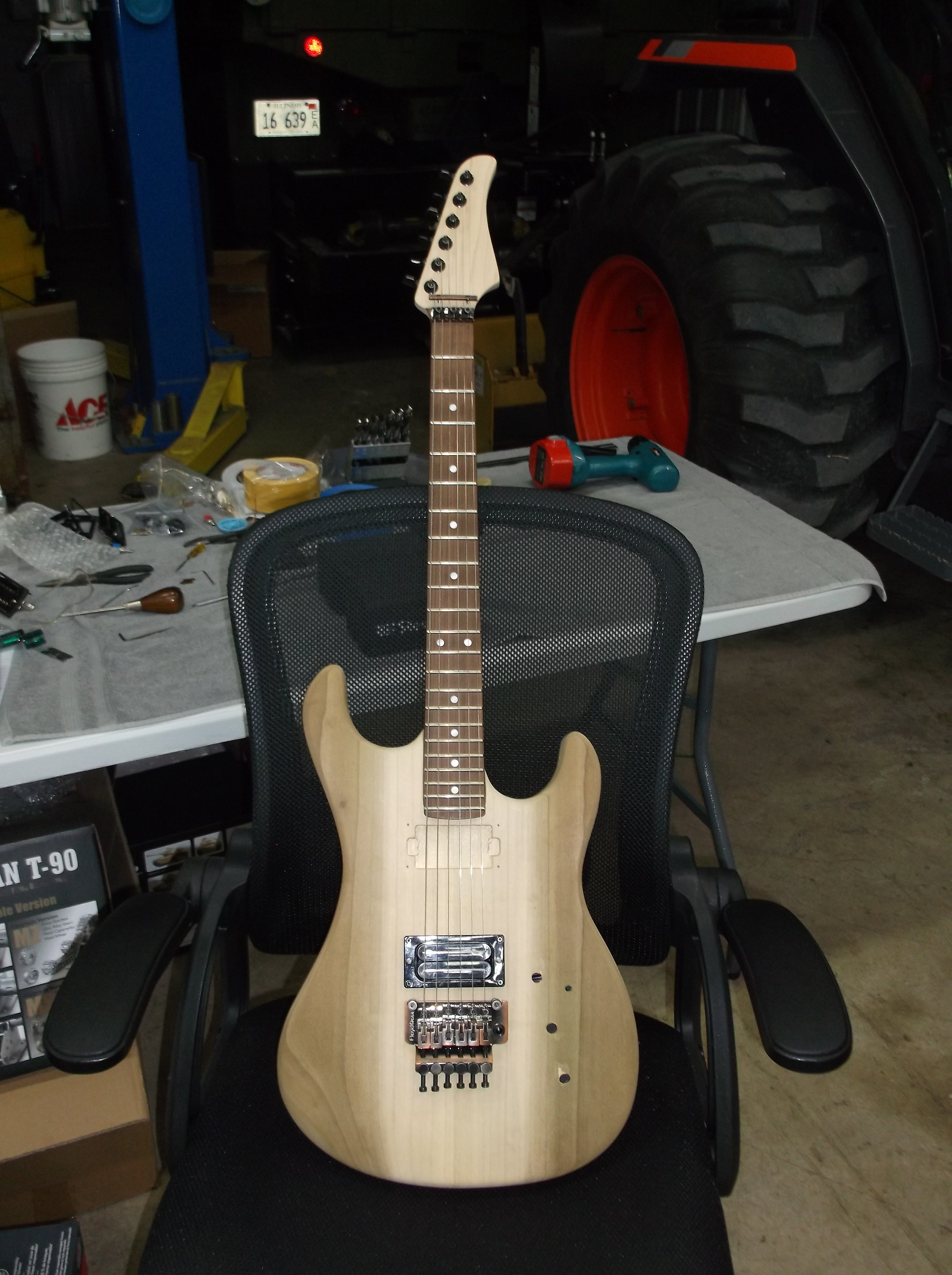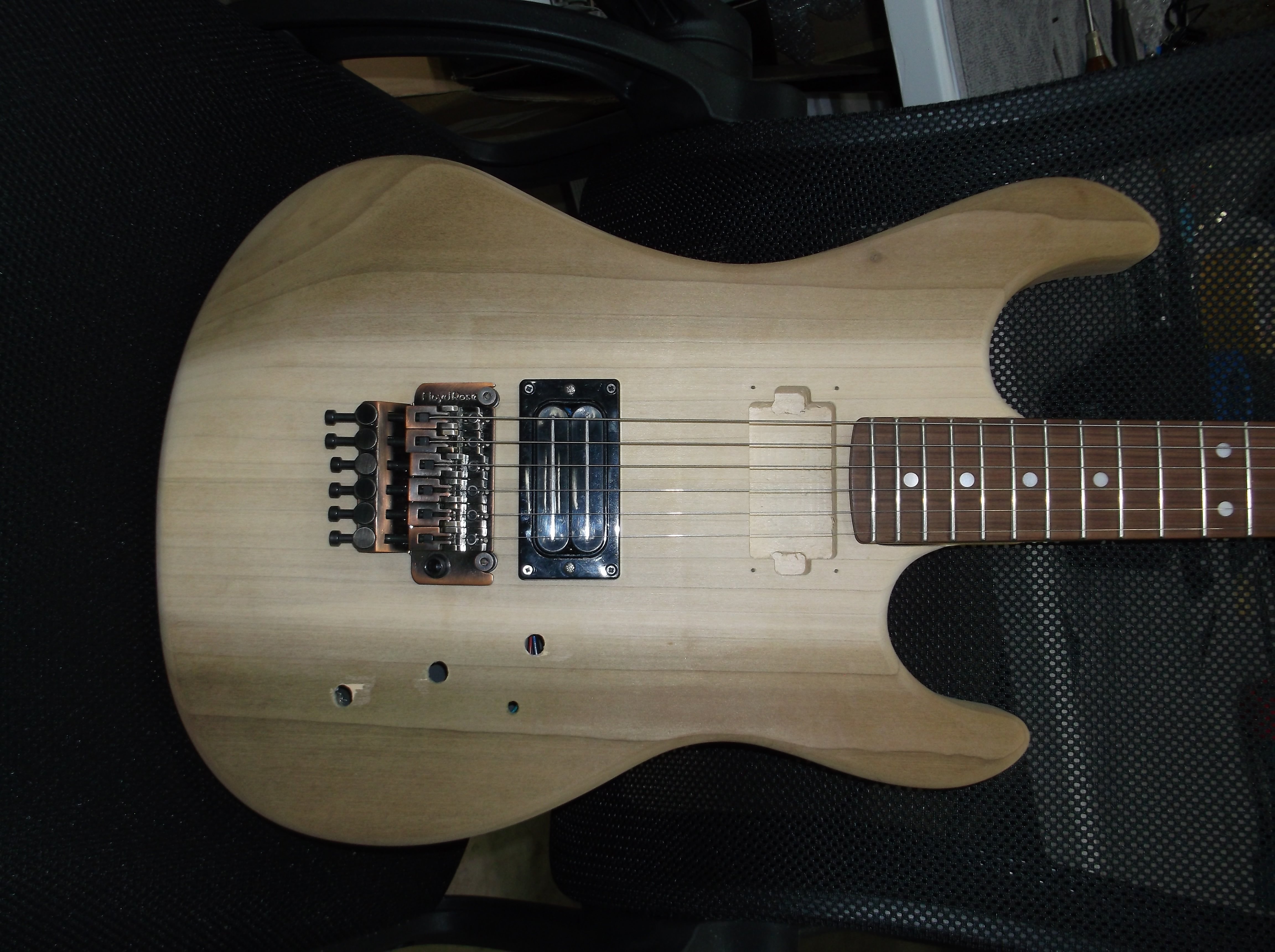 Cool build!Another long time dormant project I am finally finishing. My Kramer Imperial 1983 build Nuno/Dime guitar, body wood is Poplar, Body is a KNE Neck is a Musikraft Maple with Pao Ferro fingerboard, 6100 Jumbo frets. All the drilling and fitting is done, pressed in the floyd bushings, installed the 42mm brass block on the floyd. It's going to have two volumes, one tone like Dime's Deans. I have a Duncan 59N for the neck and a Bill and Becky L500XL or a Wes Hauch Jupiter for the bridge whichever pickup sounds best. I still have to clearance the rear pickup cavity in the ear sections since I moved the pickup back some from the original rout and it looks like I may need to install a tiny shim in the neck cavity, but thankfully the neck is straight after sitting so long. I just strung it up to do a quick setup to see how things fit and if the body was dead or resonated......luckily the body resonates well. I'm still not happy with the how the KNE body fit the Musikraft neck but I just did some sanding to make it work. Next up is sealing the body and then priming and painting then clear coating with polyurethane satin clear. Color is going to be mettalic Copper.