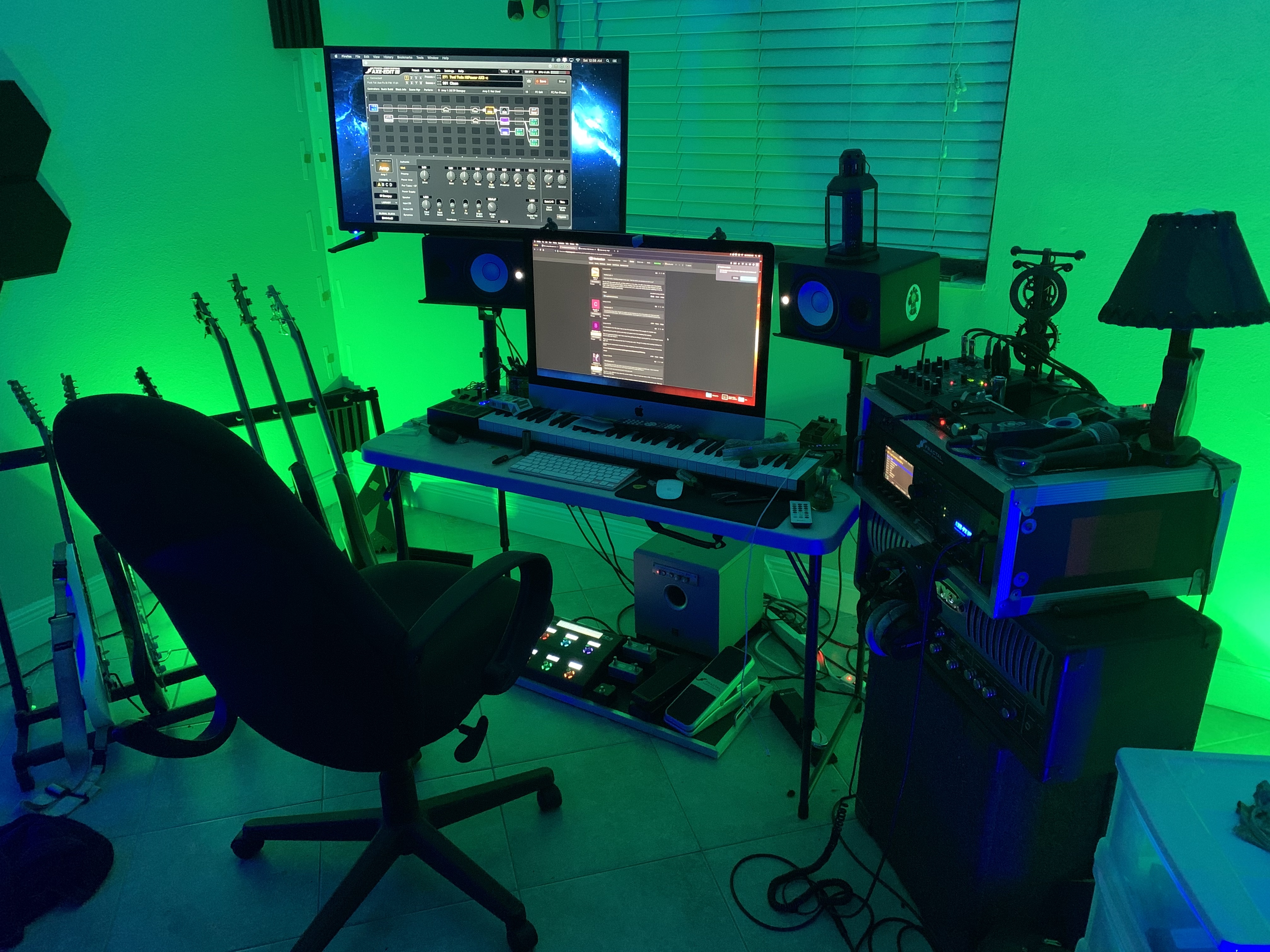 I've got my rack with the JV-1080, 2 Soundcards, analogue PPMs, AxeFX 2, wireless etc etc. Next to that is my mini rig, which is a JMP-1 and Palmer Power Amp. Out of shot is my GK250ML sitting on a home made 4x12 in teal! Guitars are a 72 strat, 5 string stingray, Jackson soloist, cheap 7 string. E-kit runs off MIDI cables going into my soundcard which controls Superior/GGD.