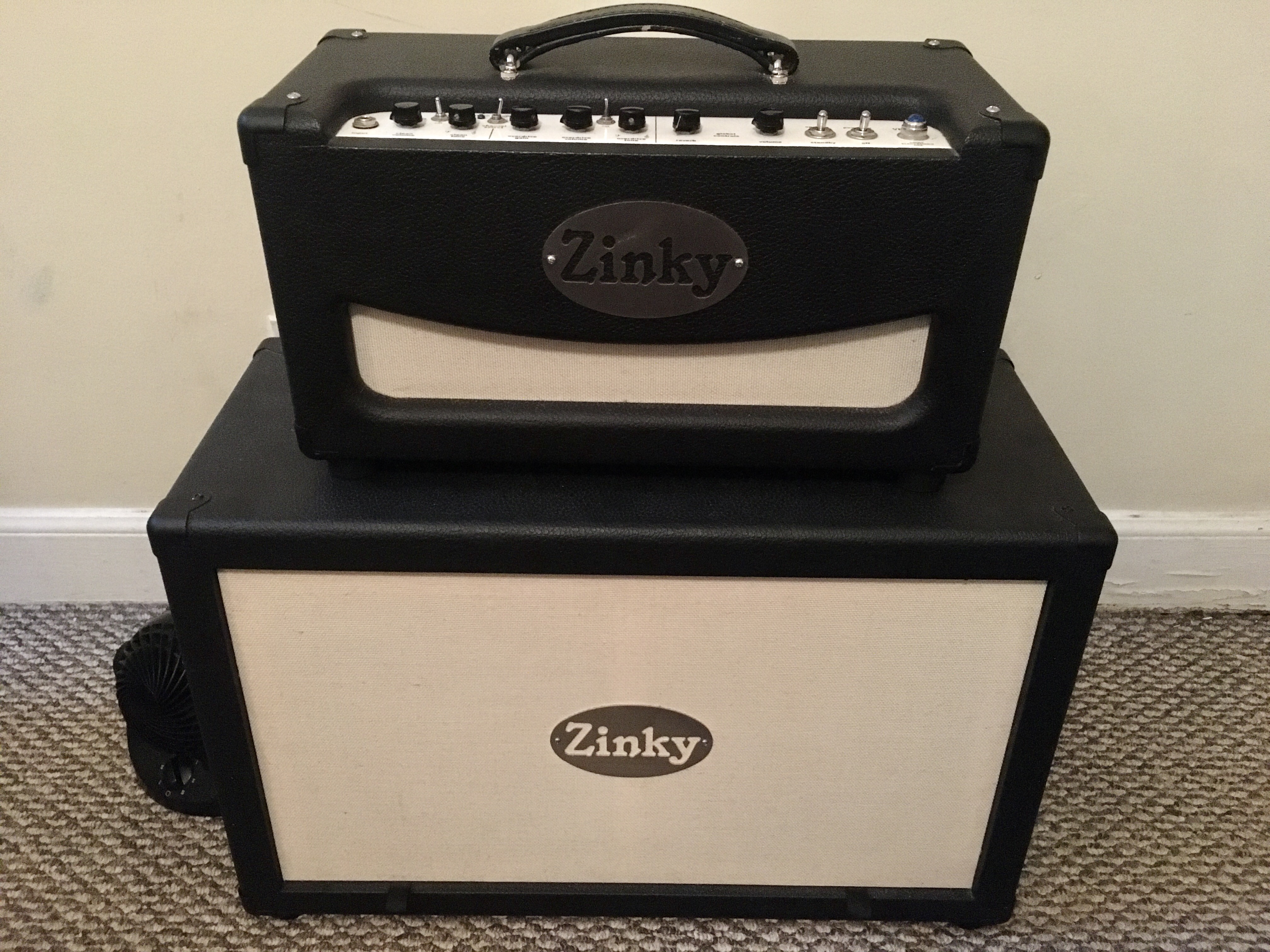 Sold the 16 ohm Zinky Eminence in the Zinky branded V-Boutique V-Cube for some old 8 ohms that are well broken in. Put the 10 gauge Marshall Sound Runner on 'em too. Bottom cab came with some early 90's UK 16 ohm V30's but I sold 'em 'cause I can hear what Steve Fryette hears. Currently got Mesa T4416's, and boy does that cab sound legit with a 57 on it. Both are stuffed, too small for even standard tuning bass with their dimensions.