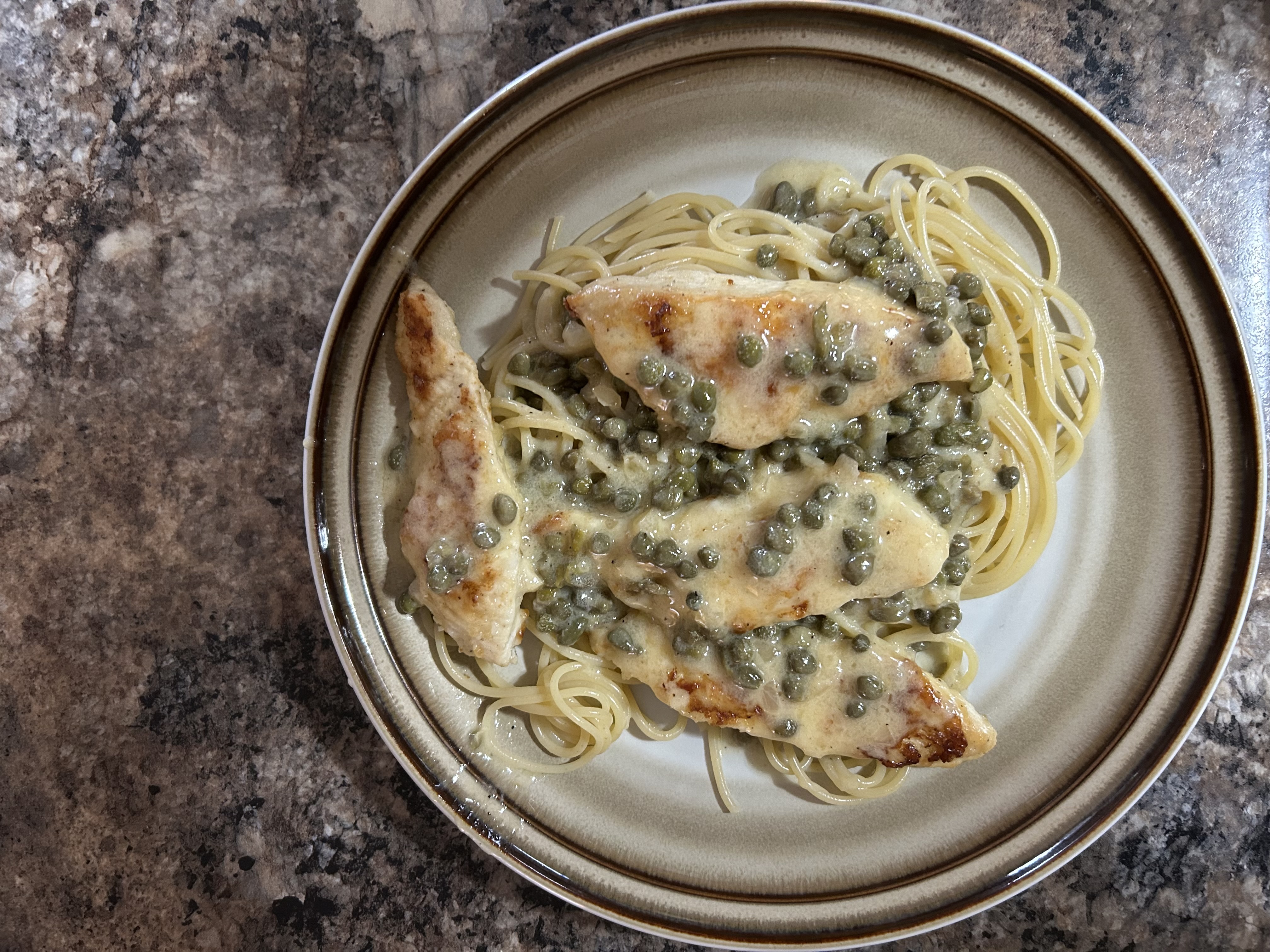 Today’s culinary adventure is a variation of Chicken Piccata with seared chicken cutlets, thin spaghetti, a lemon, garlic, cream and caper sauce with garlic breadsticks…