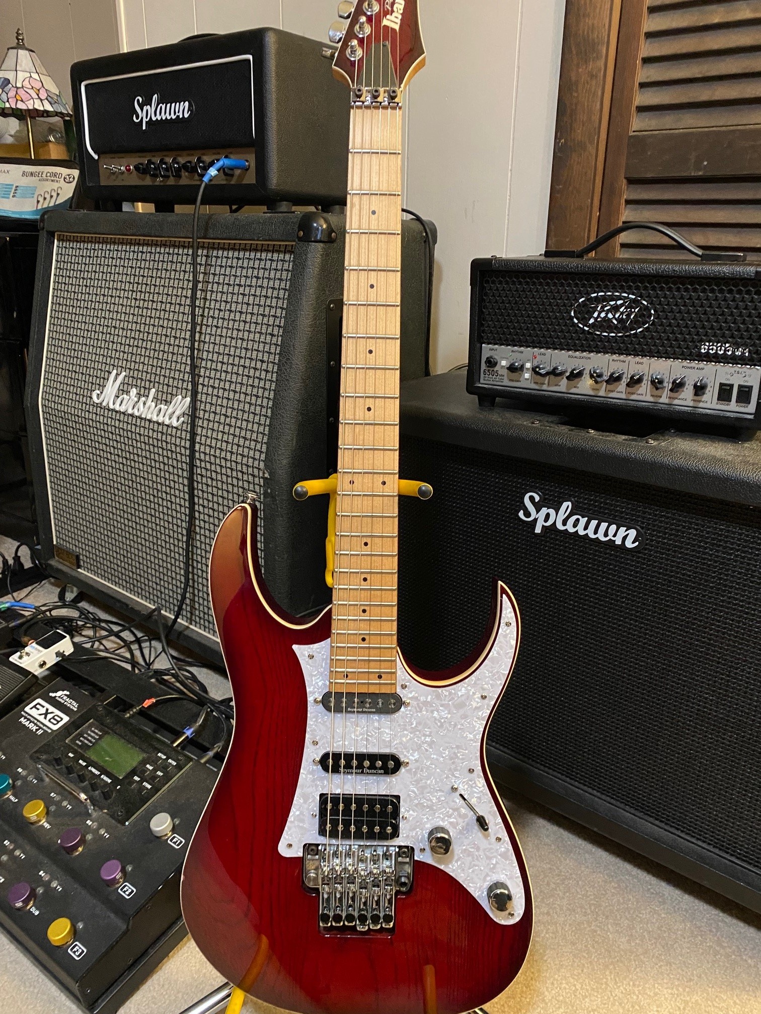 So a few months ago I snared a rare RG2560MZEX in Crimson Red with a maple board. I've never seem another one in Red with maple so maybe a limited Japan only run. Someone had swapped the pickguard to a H/S/H so I ordered a new pick guard from Perle guitars cut as a H/S/S.