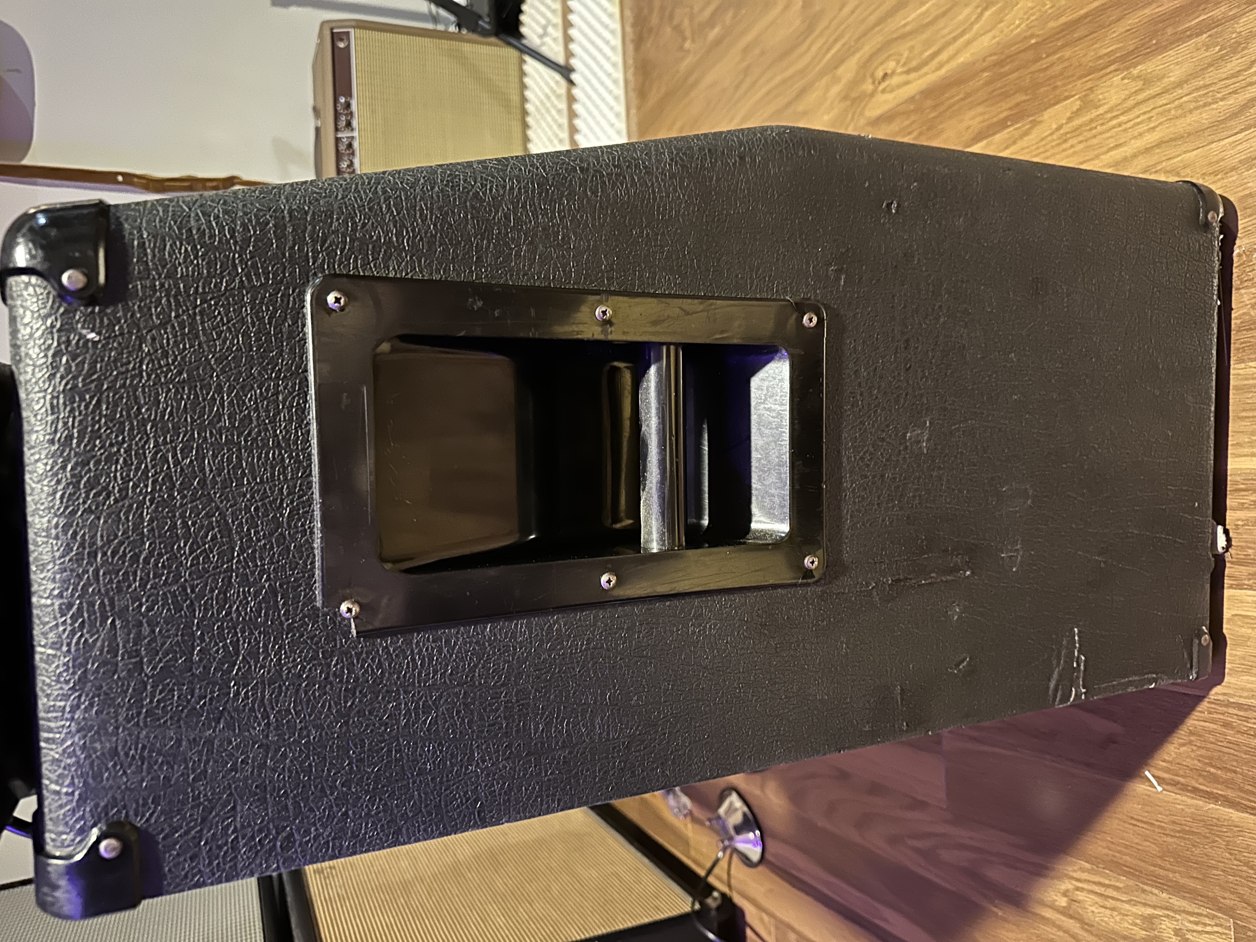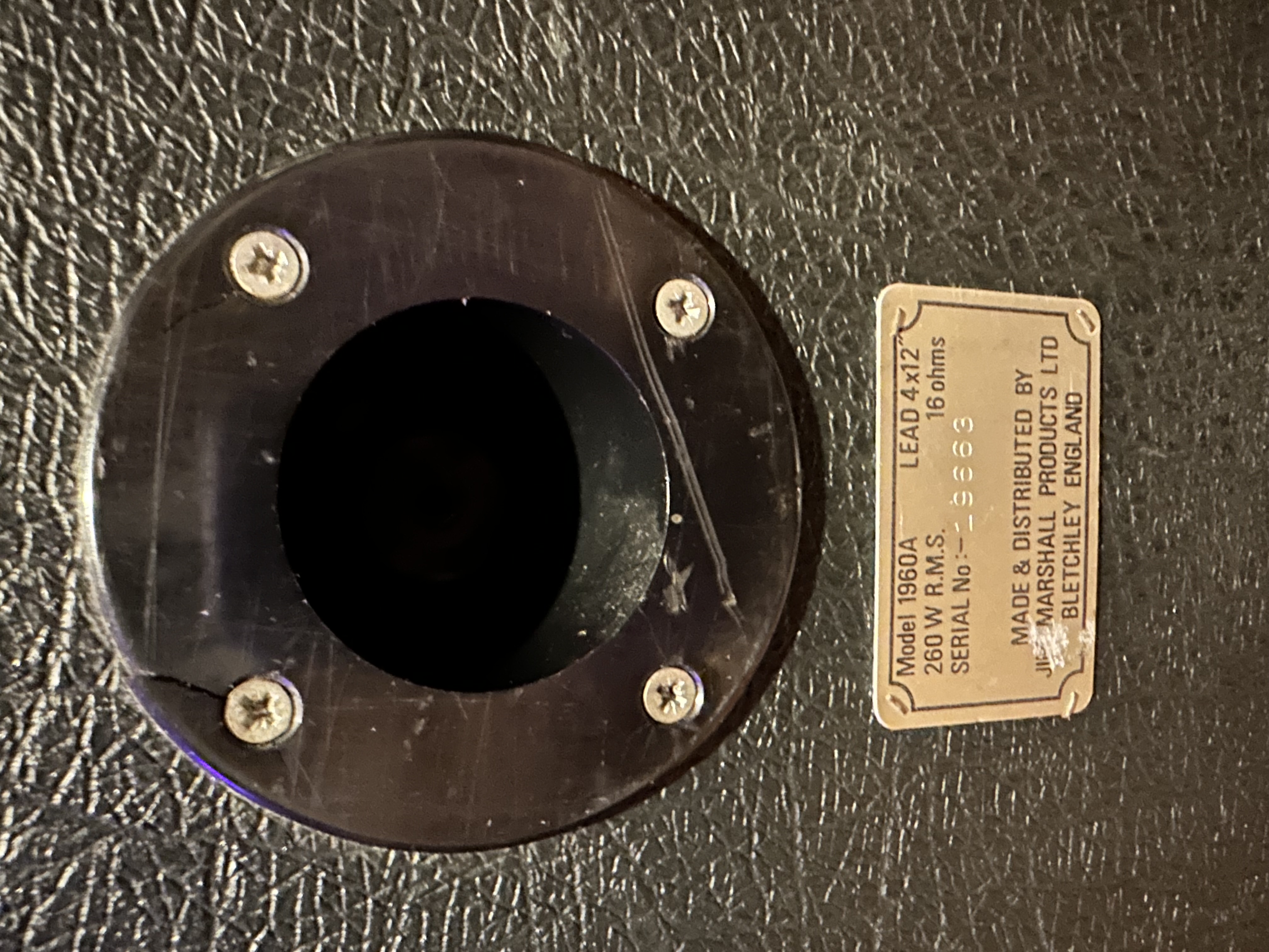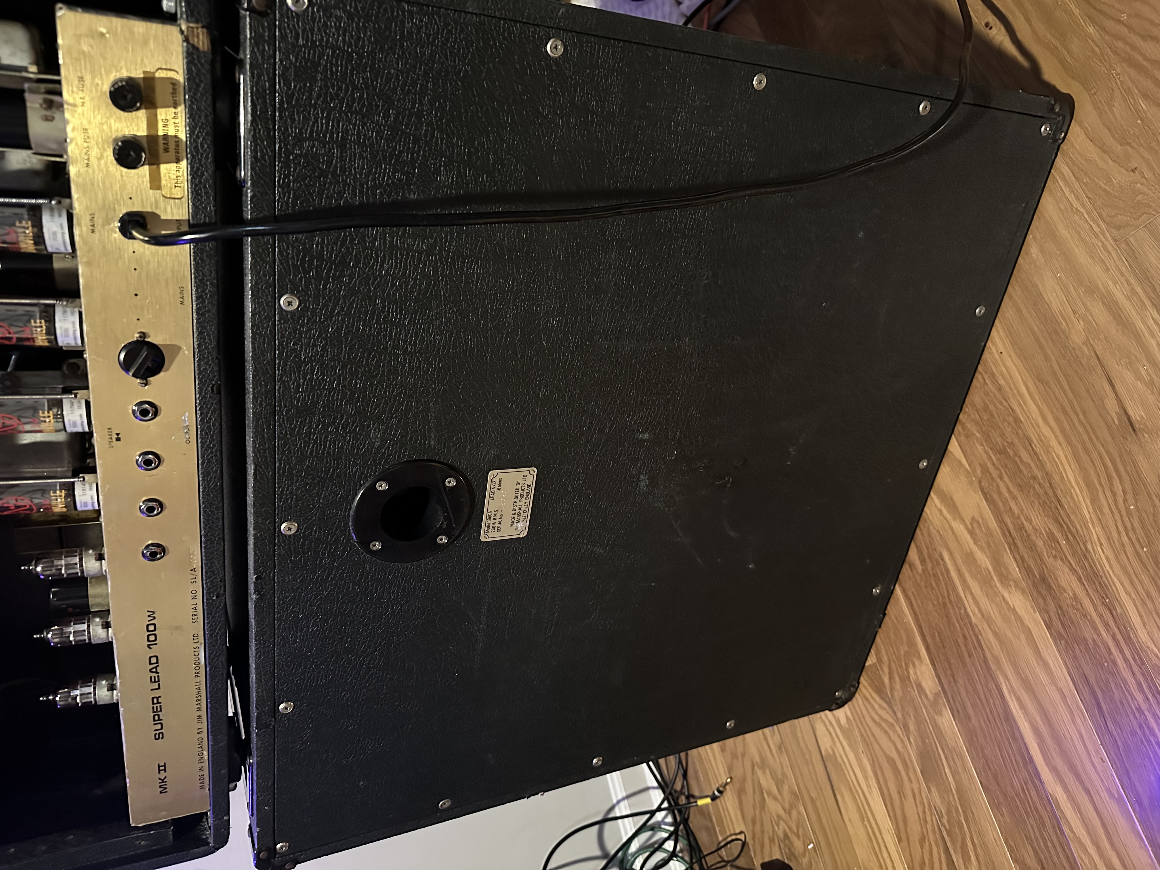Marshall JCM800 1960A 4x12 cabinet from 1984. Original vented G12T-75 speakers, the tag on the back says 260W max but that is a leftover tag from the G12-65 speakers that preceded these. This cab is 300W max. Very common for cabs of this era. These G12T-75 sound different than the newer non-vented models. Way more mids and no brittle highs. The side handles have screws instead of rivets to prevent rattle. Always stored inside my home (not garage ever) since I’ve had it.