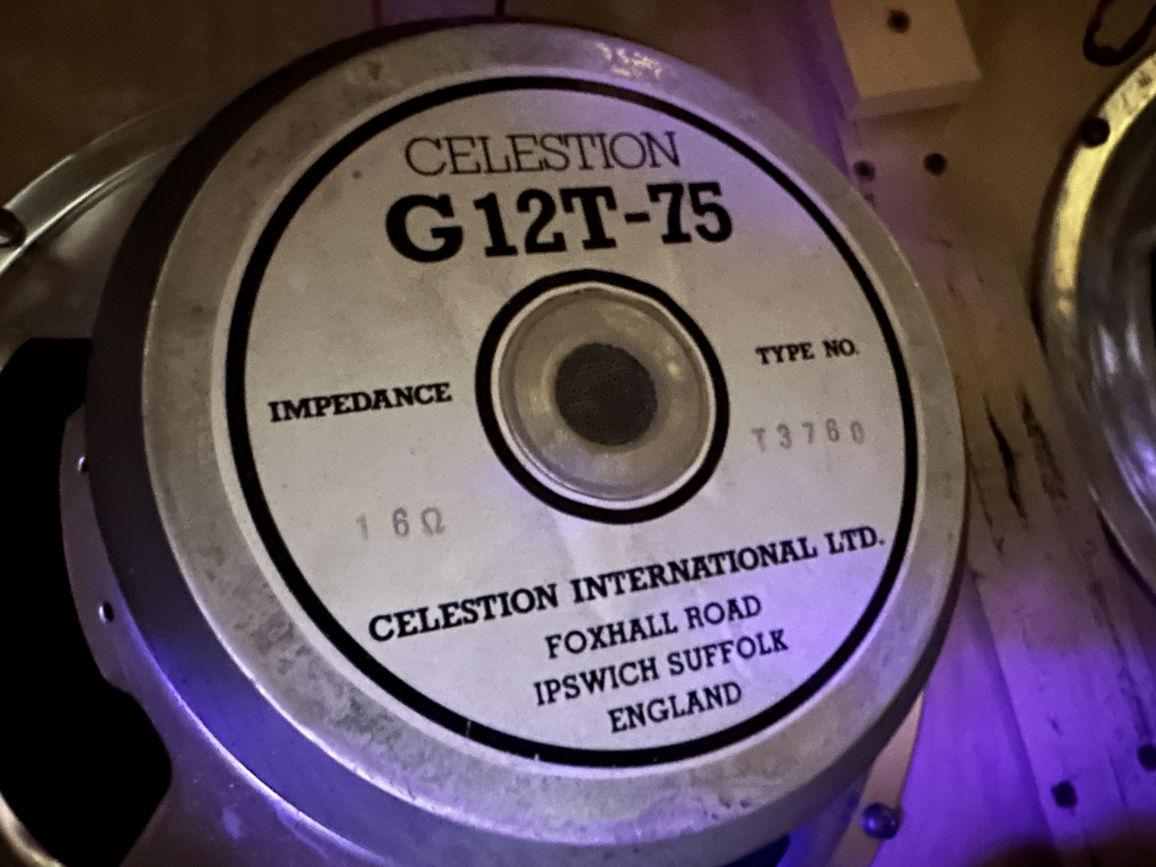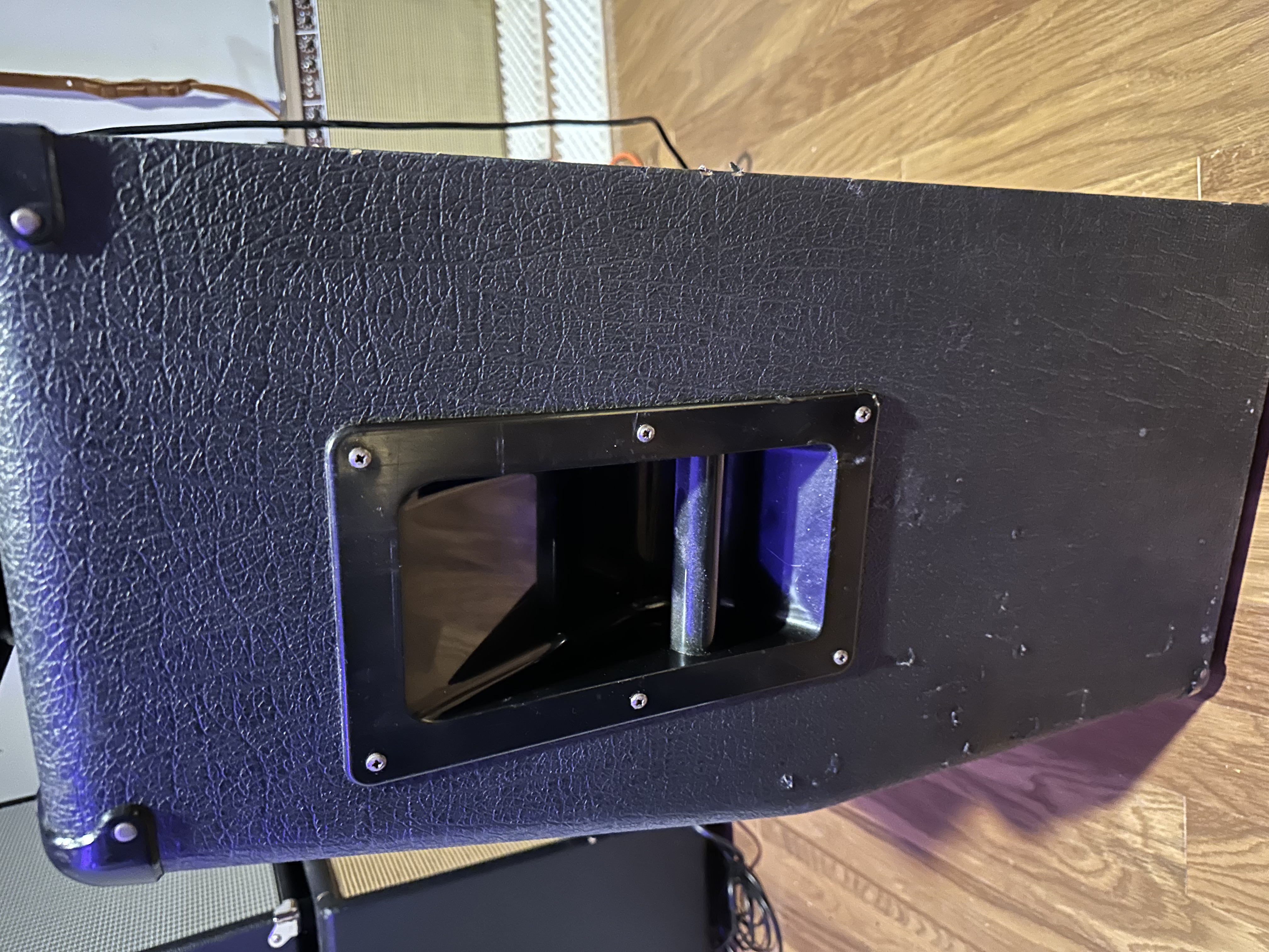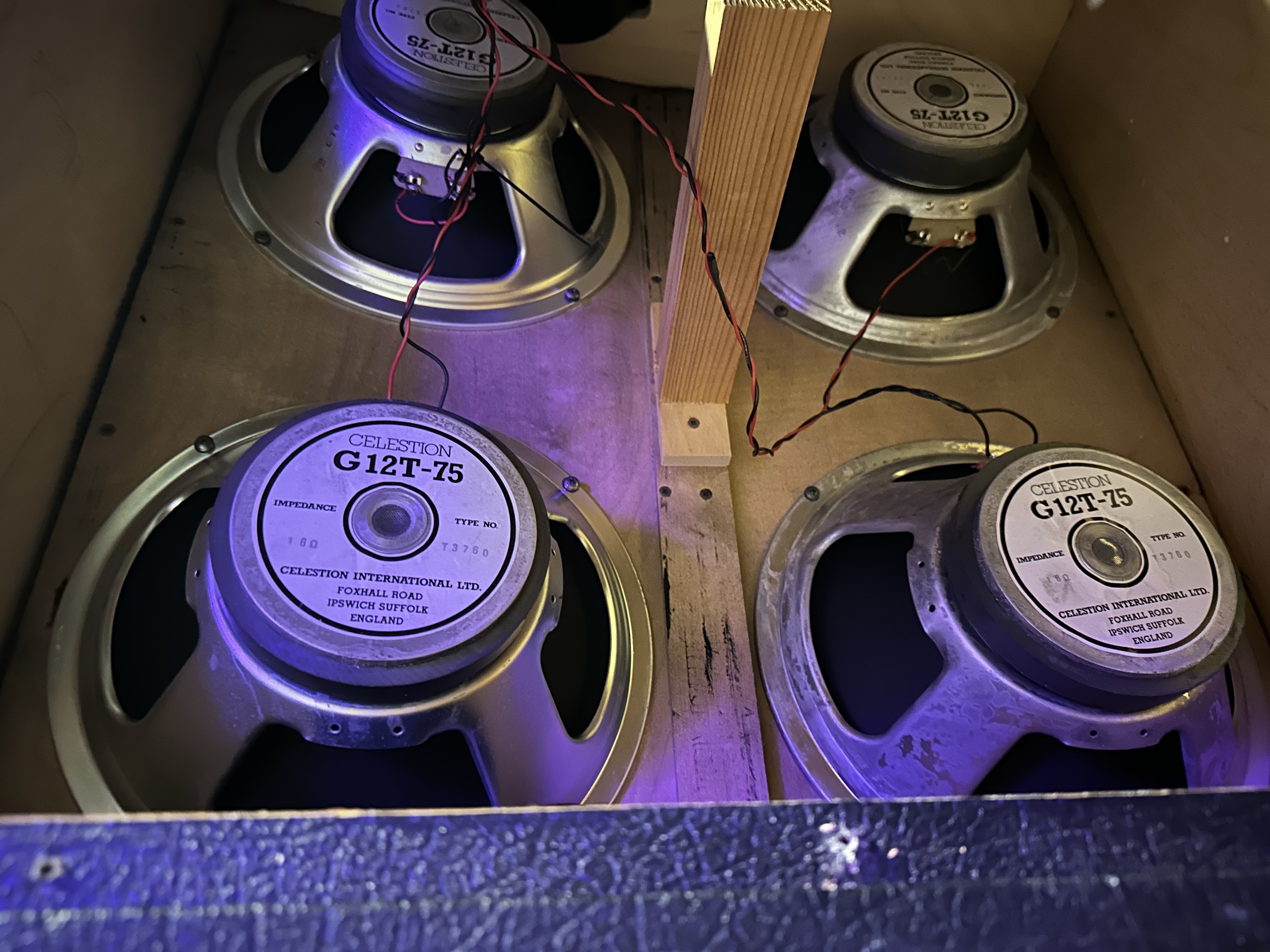 Marshall JCM800 1960A 4x12 cabinet from 1984. Original vented G12T-75 speakers, the tag on the back says 260W max but that is a leftover tag from the G12-65 speakers that preceded these. This cab is 300W max. Very common for cabs of this era. These G12T-75 sound different than the newer non-vented models. Way more mids and no brittle highs. The side handles have screws instead of rivets to prevent rattle. Always stored inside my home (not garage ever) since I’ve had it.