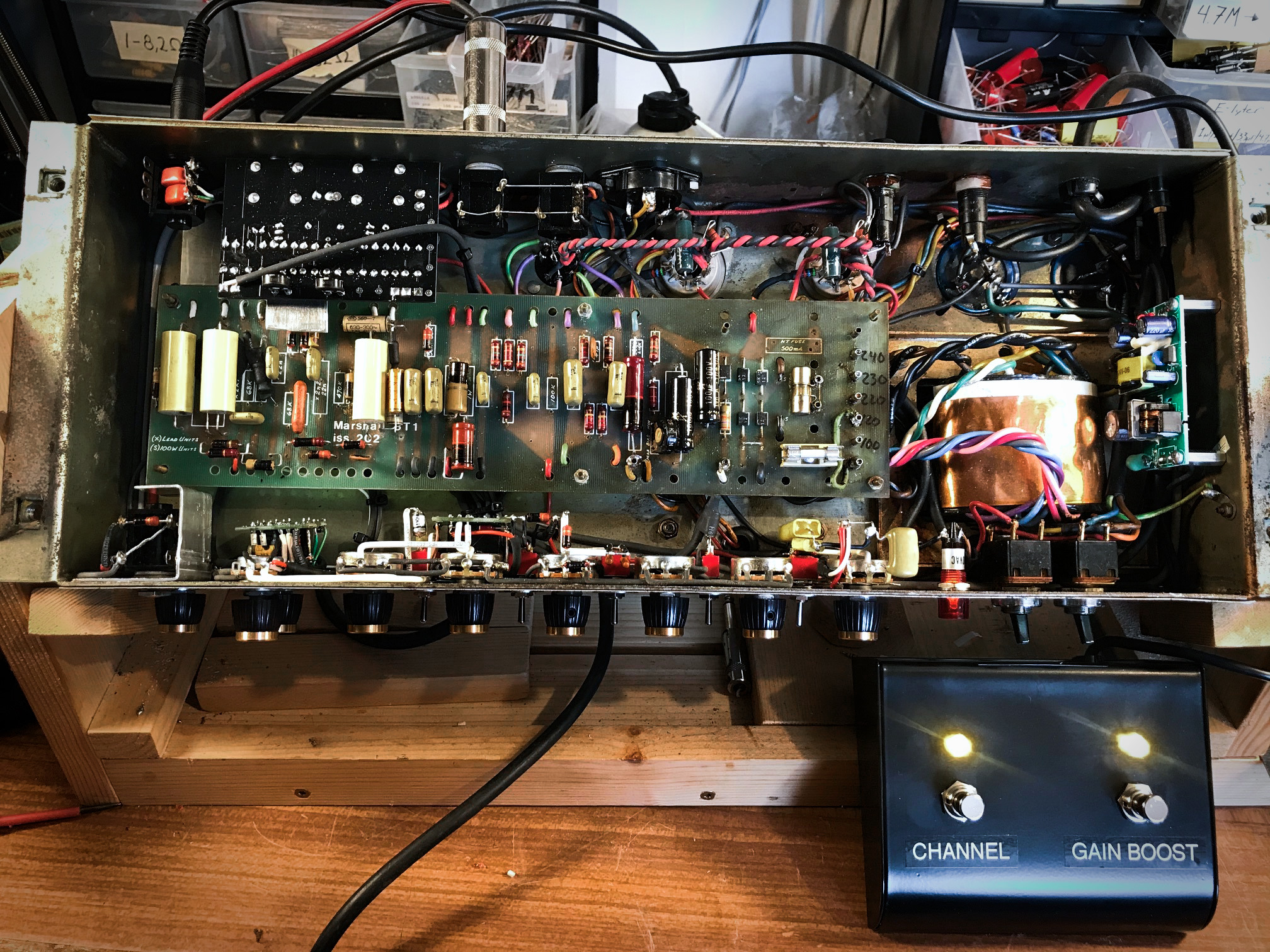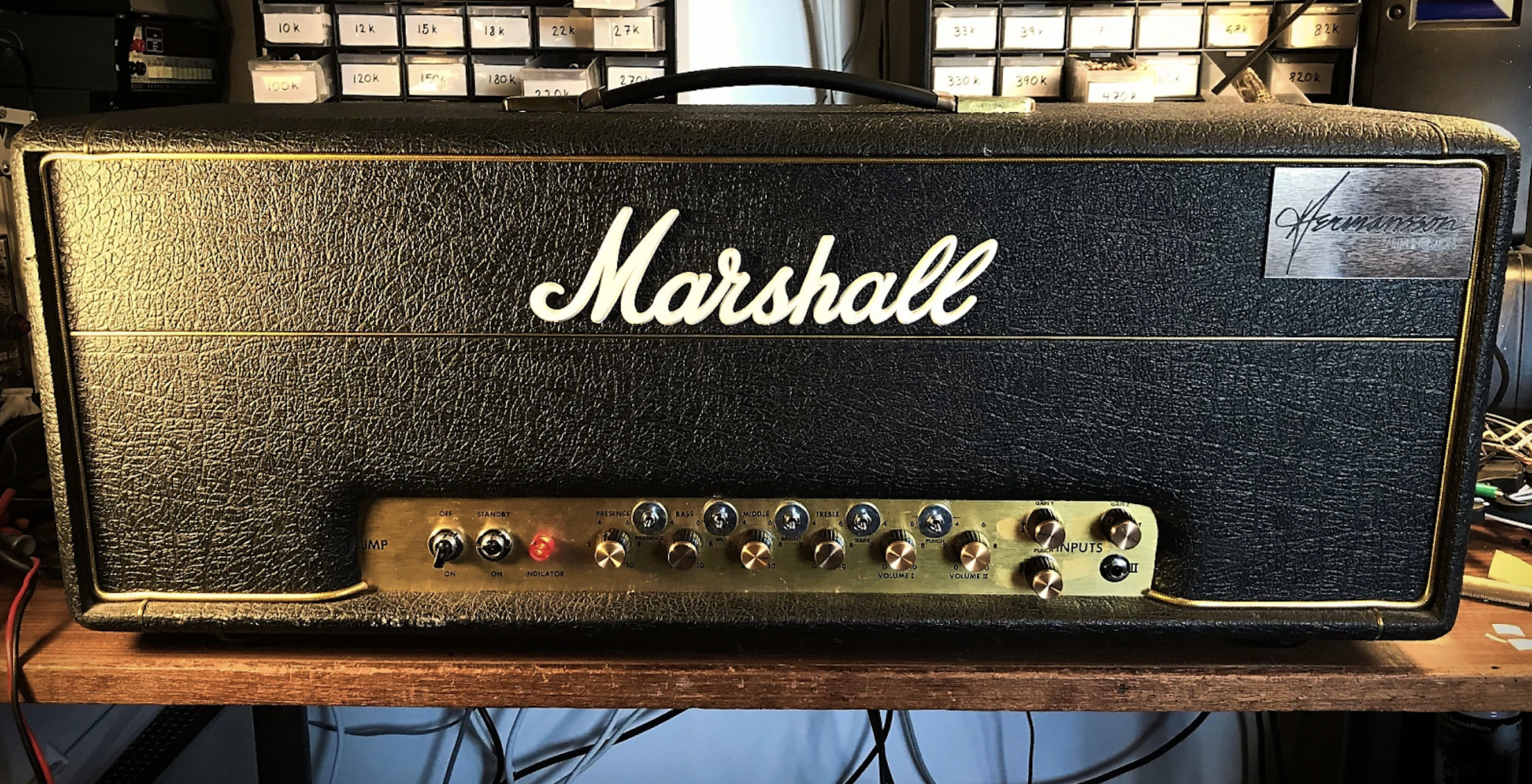 This amp started life as a 1976 Marshall Model 1986 but was modded by Hermansson Amplification in Sweden with his 3-Stage mod. Description from his site: "I've installed the Hermansson 3 gain stages circuit, dual footswitchable gains and volumes, footswitchable gain boost, punch control, punch range switch, presence range switch, dark switch, mid switch and bright switch and an effects loop." The amp has original transformers and comes with the footswitch. Henric's stuff rarely comes up for sale, especially a Marshall (they take far longer for him to complete versus the Rectos). Grab this rare opportunity today!