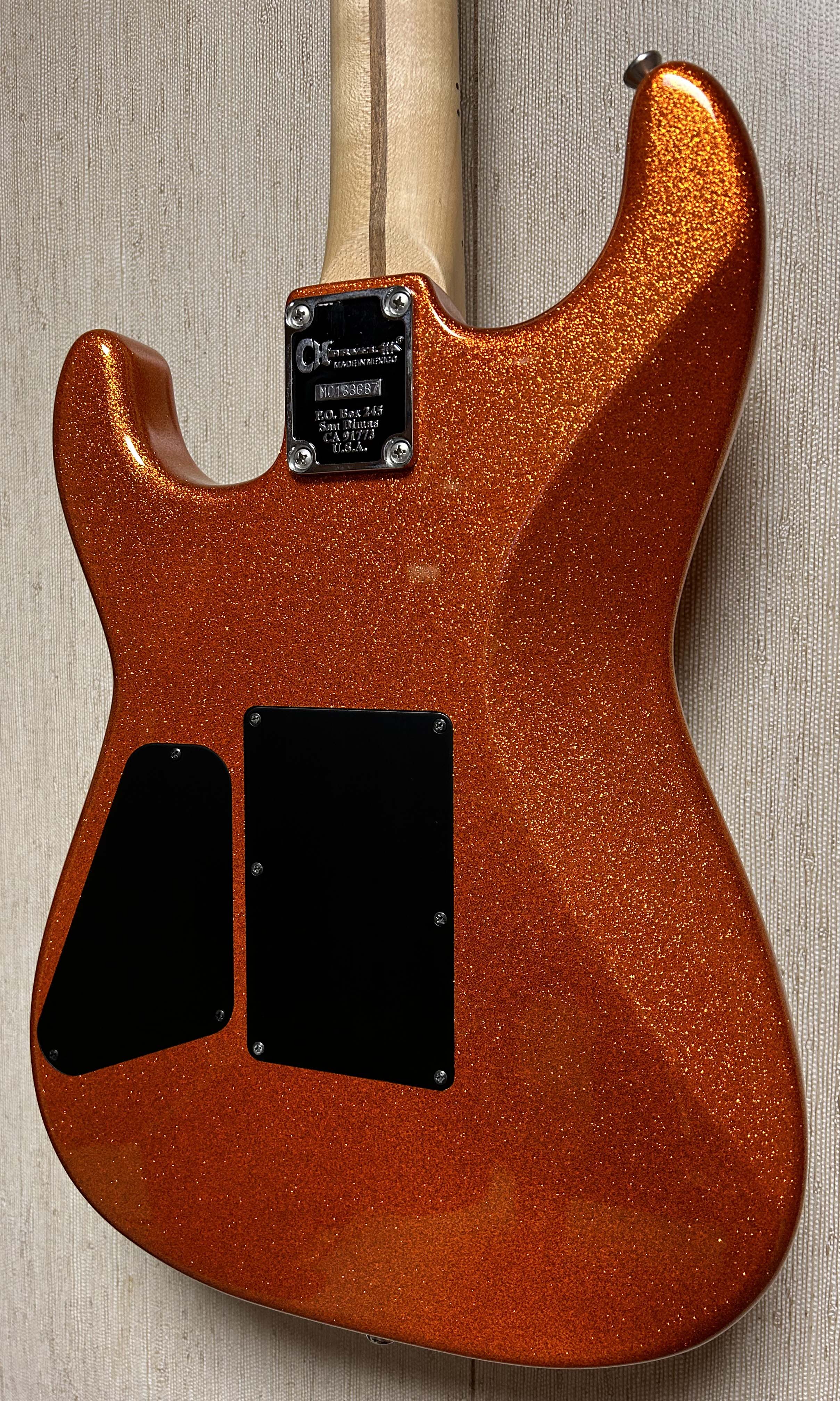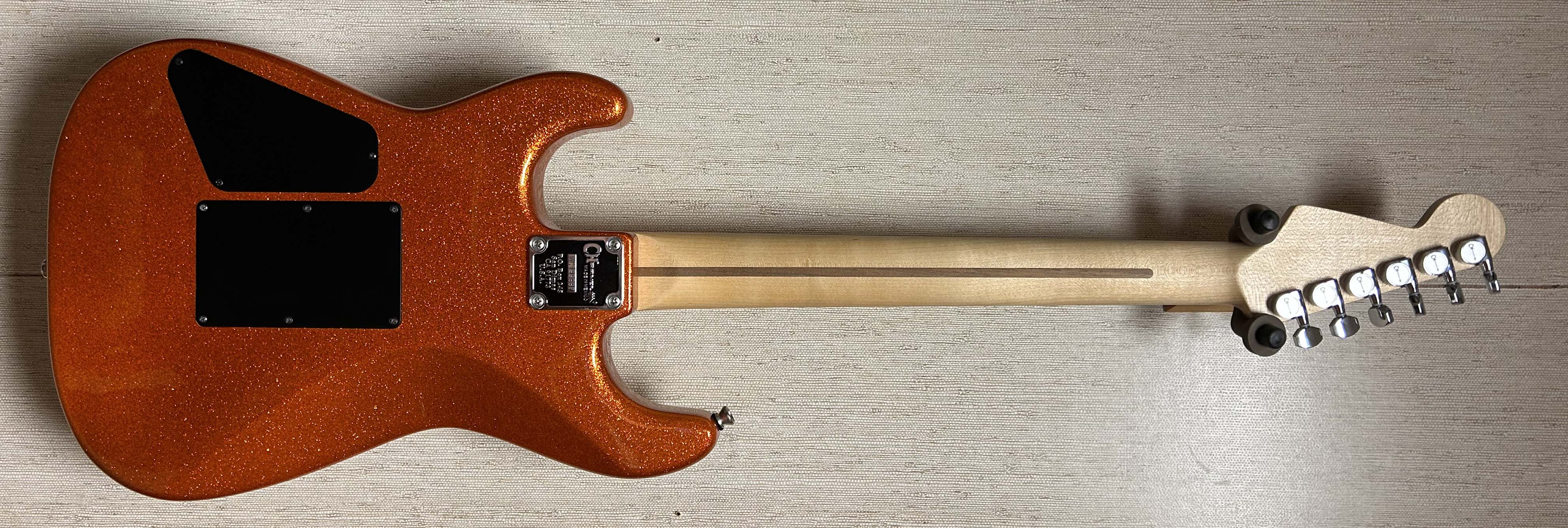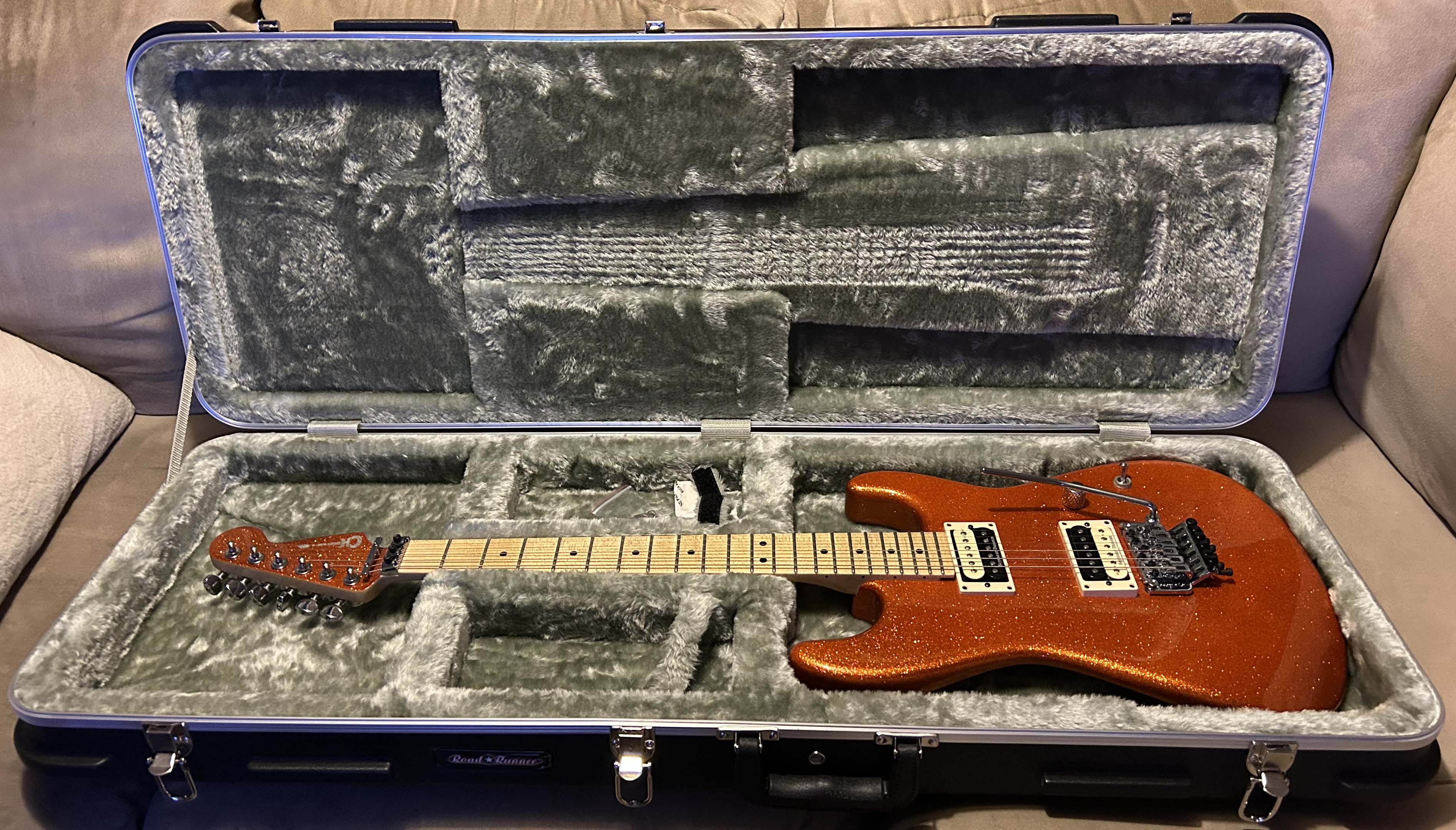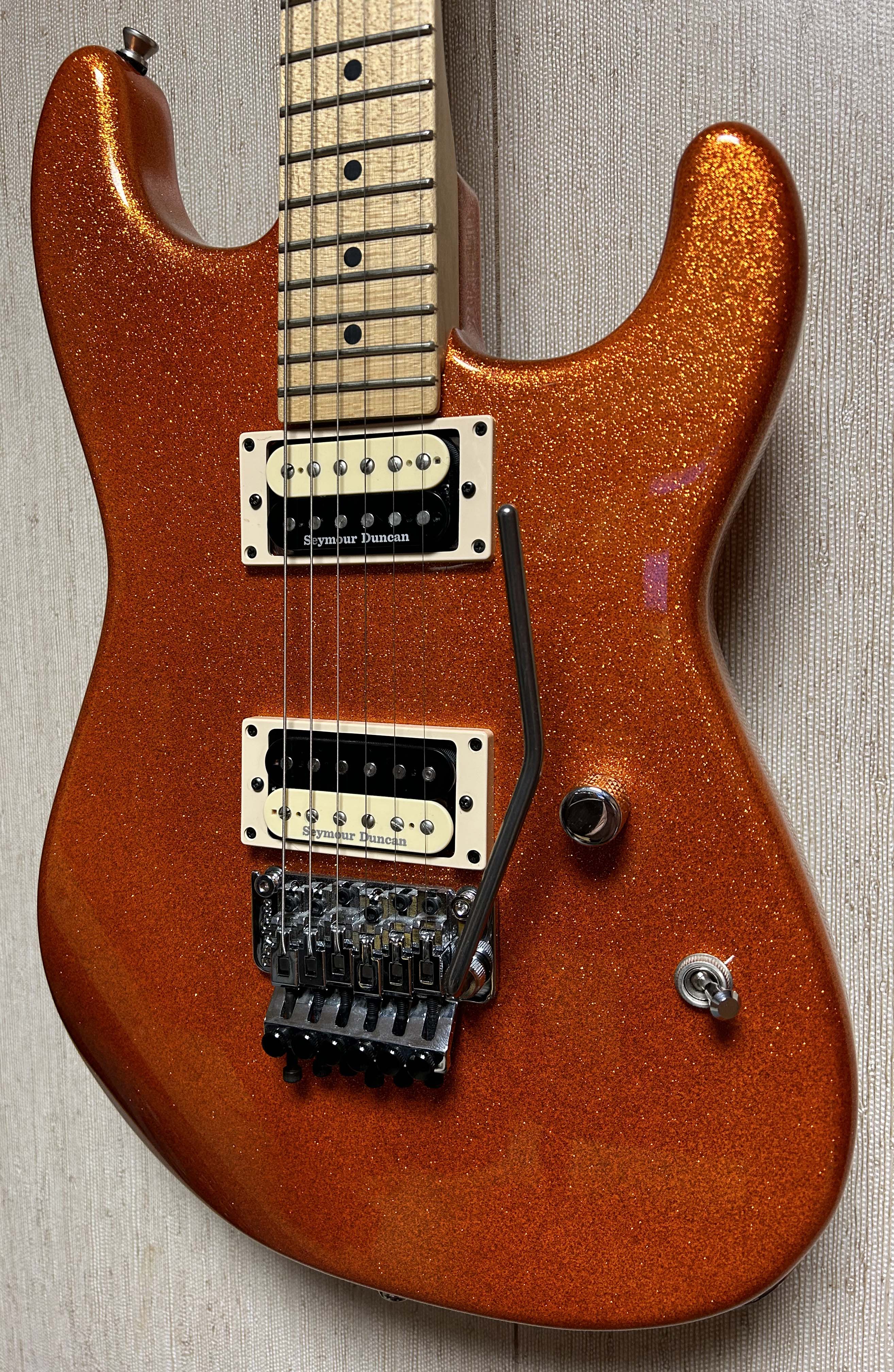 This is an excellent+ condition, 2014 Charvel Super Stock SD1 guitar in the limited edition Sunset Orange Metal Flake finish. Only 125 made worldwide. Gorgeous and sparkly, a real head turner. This guitar has been played very little and is in absolute collector condition with no detractions at all. If you're a condition freak like me I assure that you won't be disappointed. Comes with after market Road Runner hard shell case, trem bar, and allen key. I don't believe they came with any case candy but if they did I don't have it. Know it may seem like a lot for MIM Charvel but if you read more about the model it's a popular and difficult to find issue. $SOLD + actual shipping.