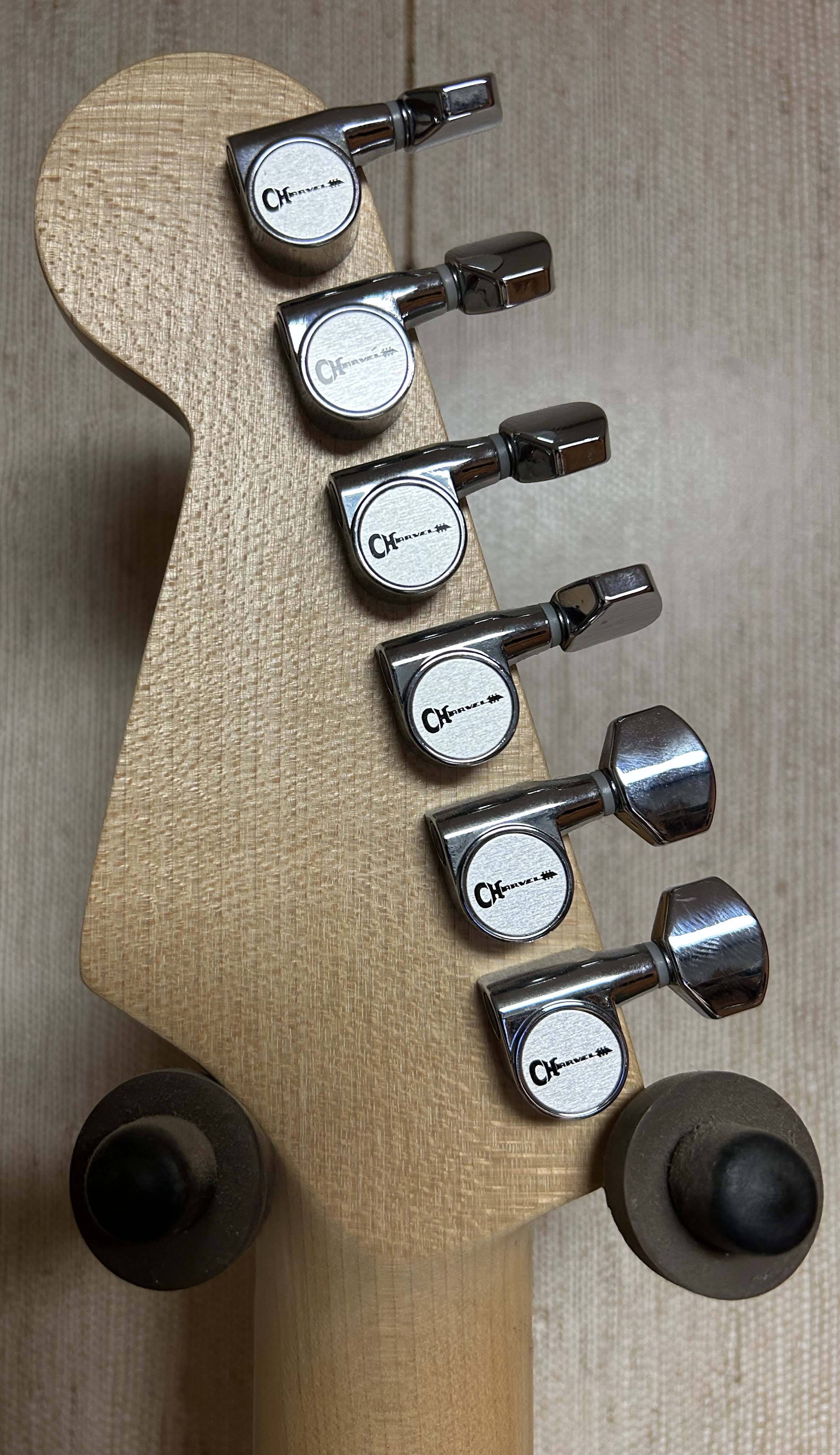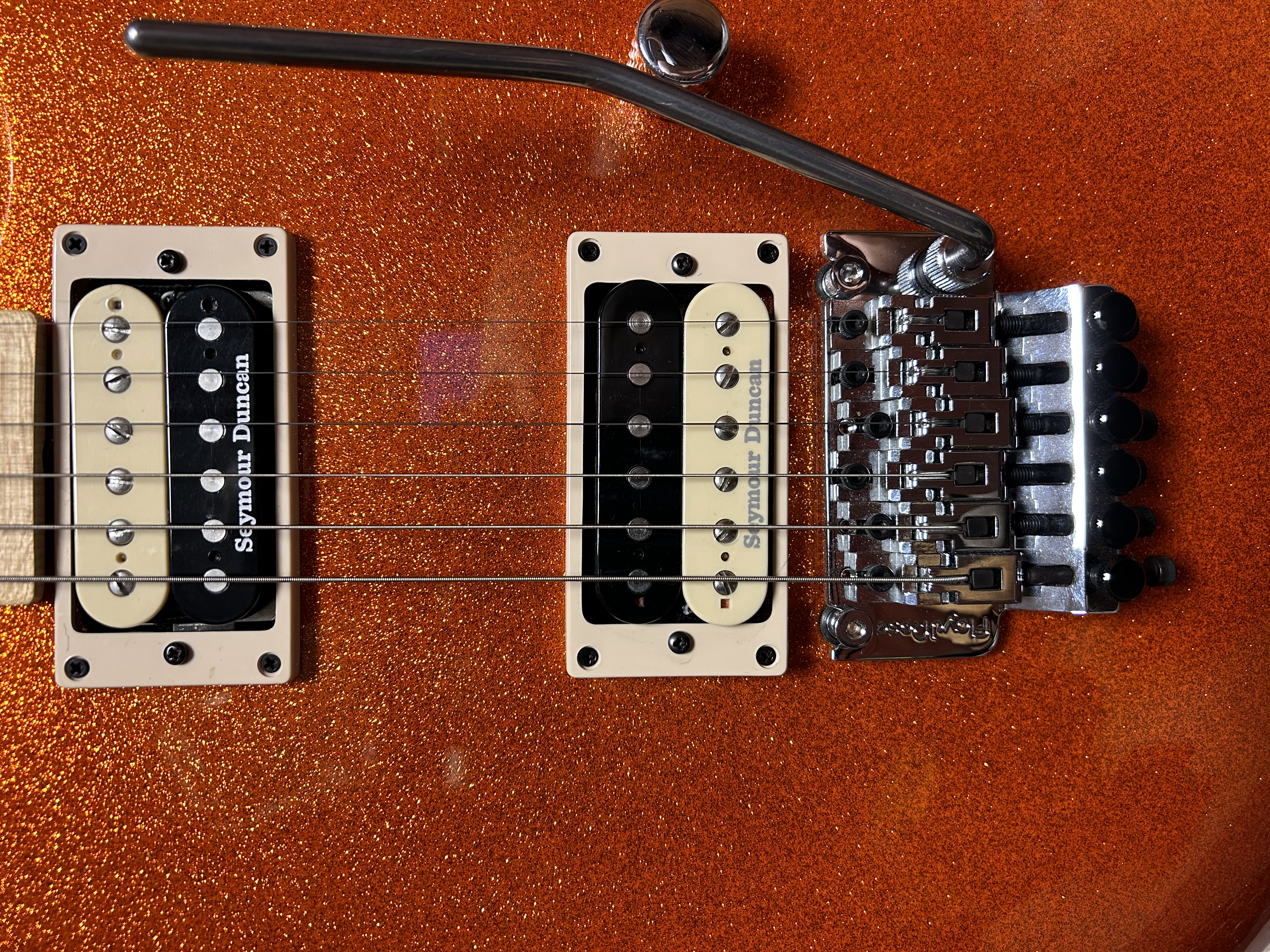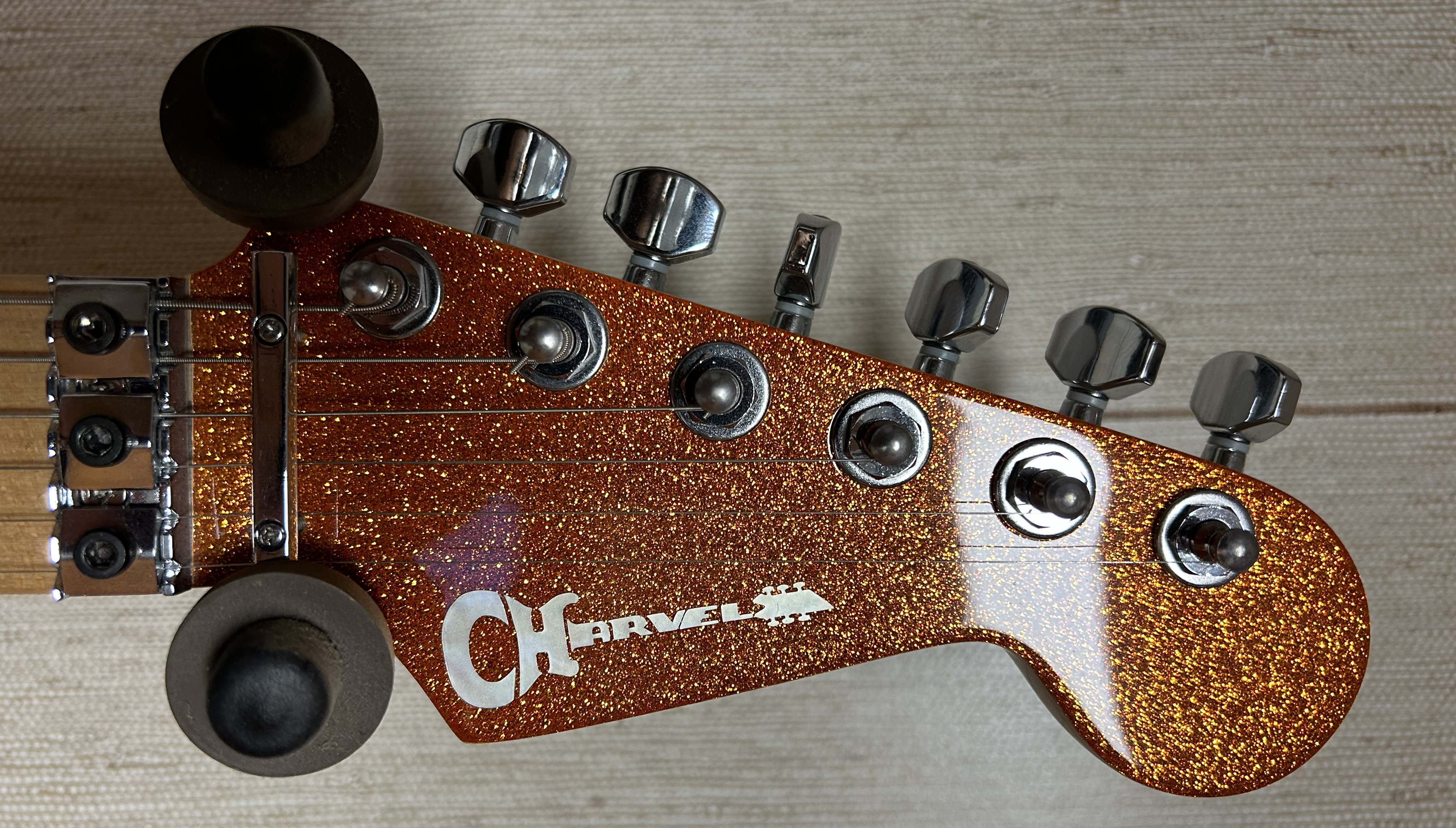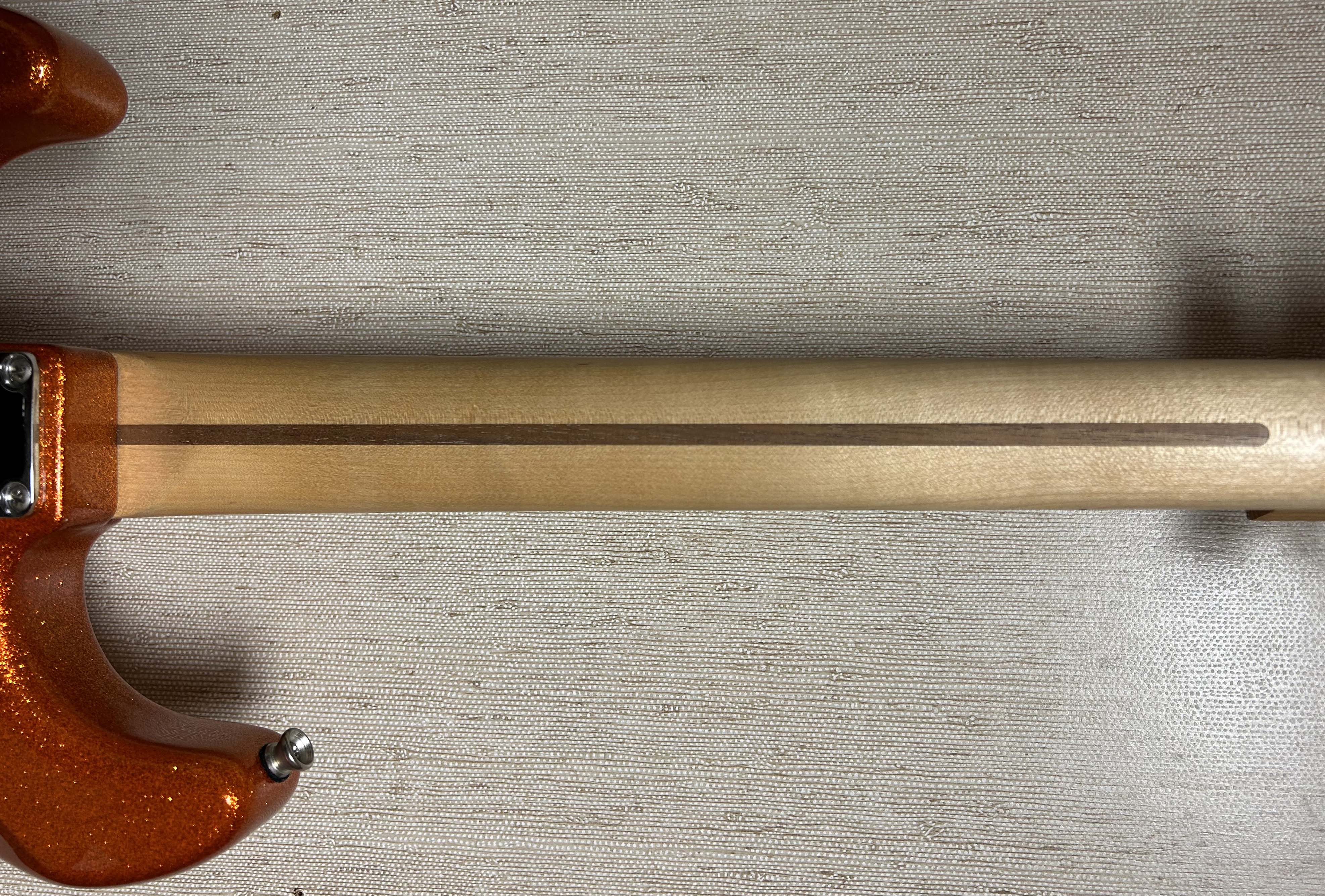 This is an excellent+ condition, 2014 Charvel Super Stock SD1 guitar in the limited edition Sunset Orange Metal Flake finish. Only 125 made worldwide. Gorgeous and sparkly, a real head turner. This guitar has been played very little and is in absolute collector condition with no detractions at all. If you're a condition freak like me I assure that you won't be disappointed. Comes with after market Road Runner hard shell case, trem bar, and allen key. I don't believe they came with any case candy but if they did I don't have it. Know it may seem like a lot for MIM Charvel but if you read more about the model it's a popular and difficult to find issue. $SOLD + actual shipping.
