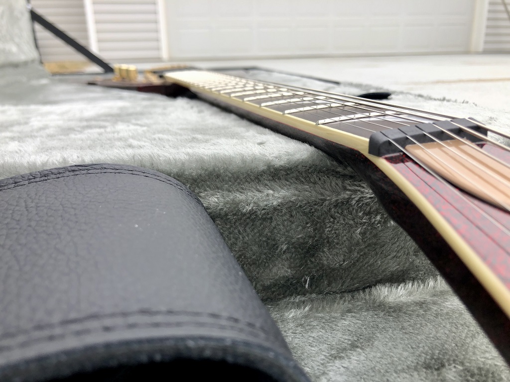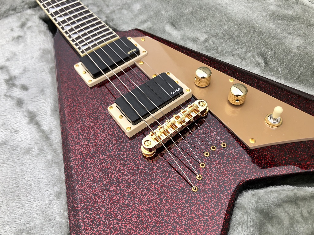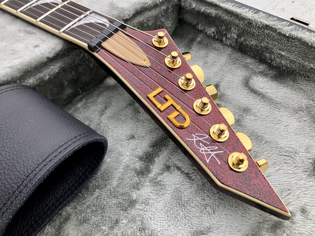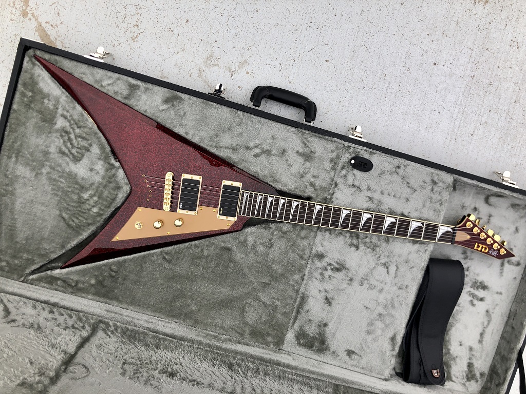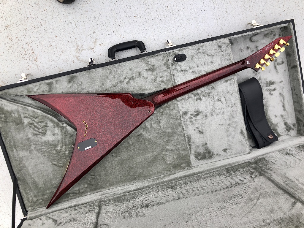 *SOLD* is a 2023 ESP LTD KH-V Kirk Hammett guitar in red sparkle. Showroom new condition. The strap buttons have been upgraded to Schallers, and the (soft & weak) Bone Breakers have been upgraded to a proper 81/85 pair. The fretboard has been cleaned & oiled, a new set of NYXL strings installed, the action set up & intonated. Comes with OHSC and case candy, and will ship detuned in the original box. Optional new Perri's Leather 3" padded strap available as well. Asking $1250 shipped for everything, and $1200 if I keep (just) the strap.