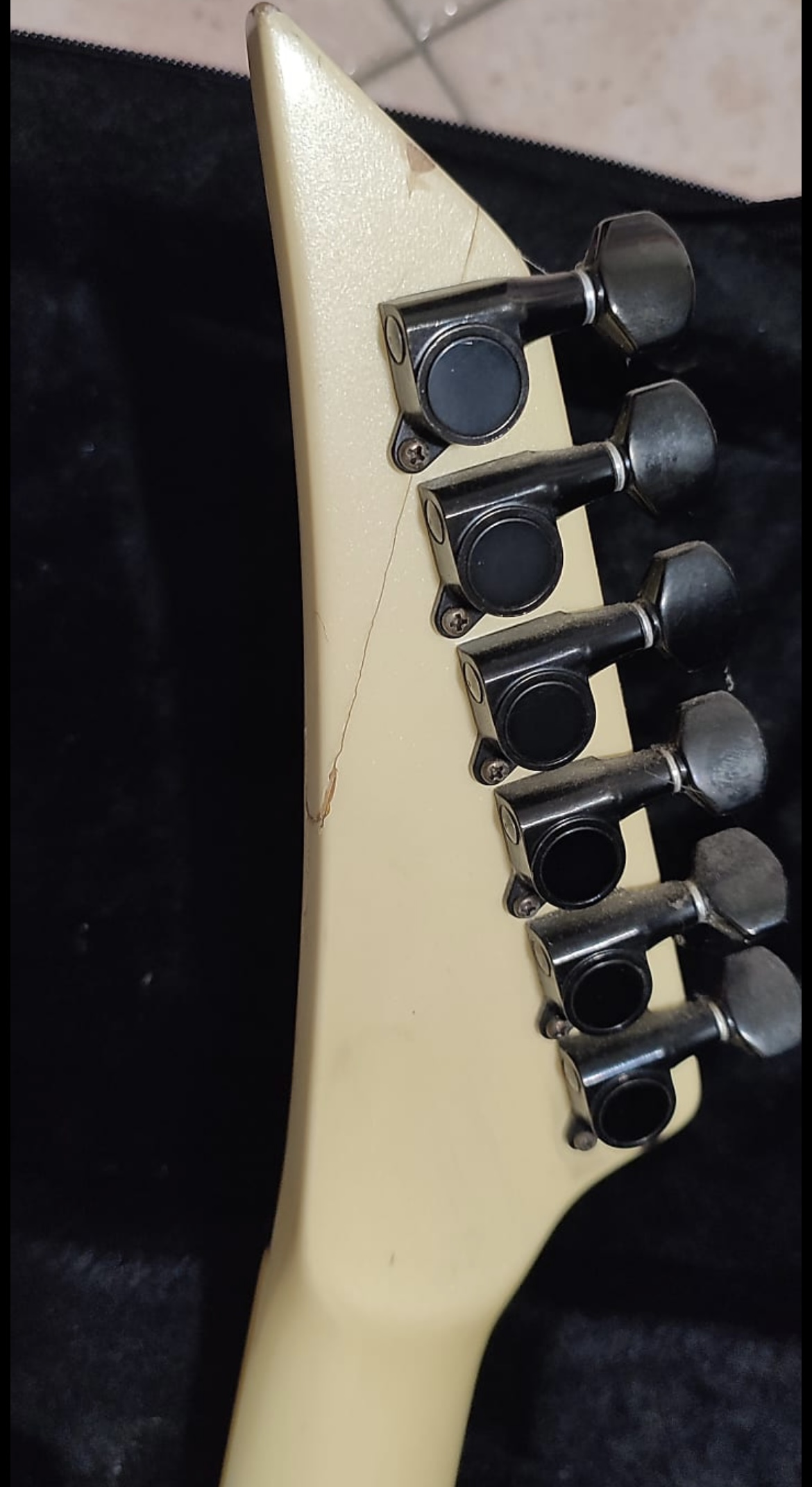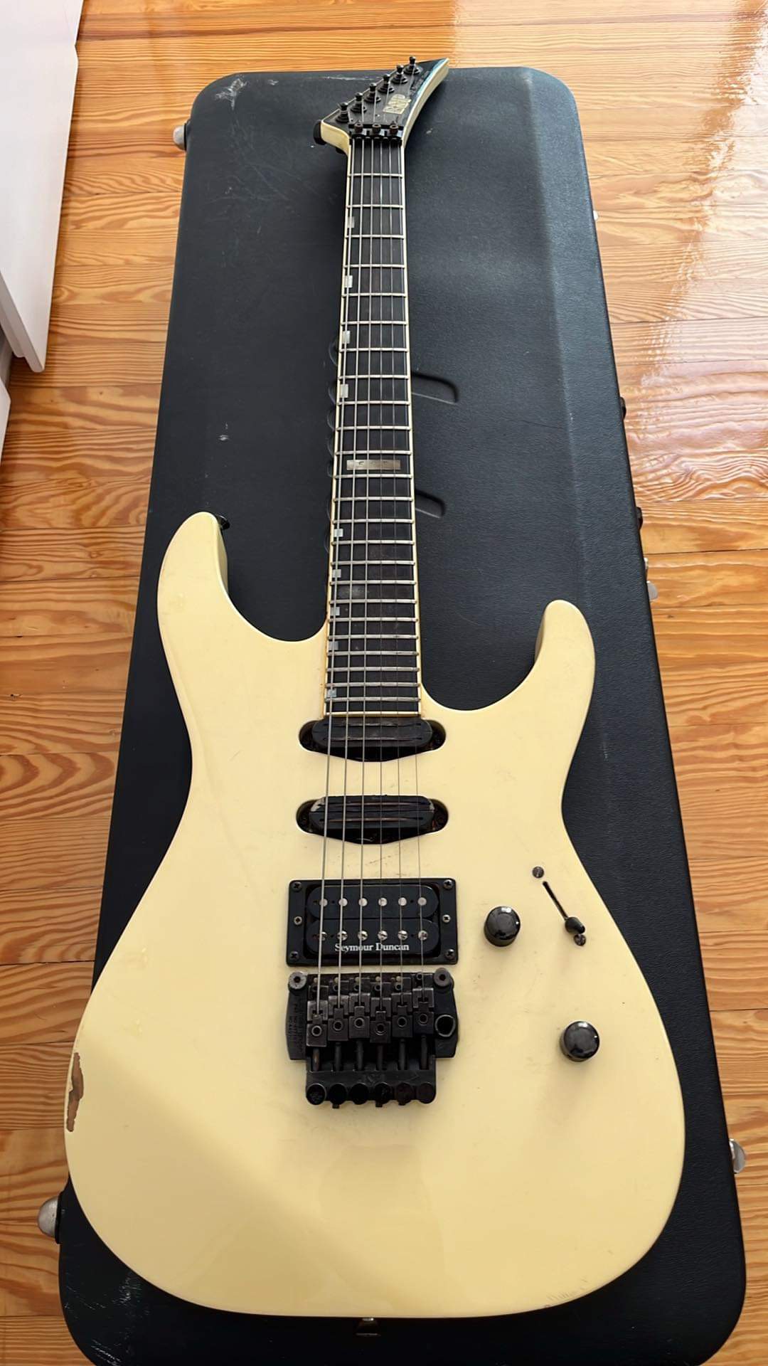 It's the pre serial number and pre ESP branded Sinclair / neck thru model with ebony fretboard. Esp believes this one was made in 1987. The guitar has seen better days but it's fully functional. There is a headstock repair which doesn't affect playability and has been like this for many years. Seymour Duncan JB in the bridge / stock pickups middle / neck.