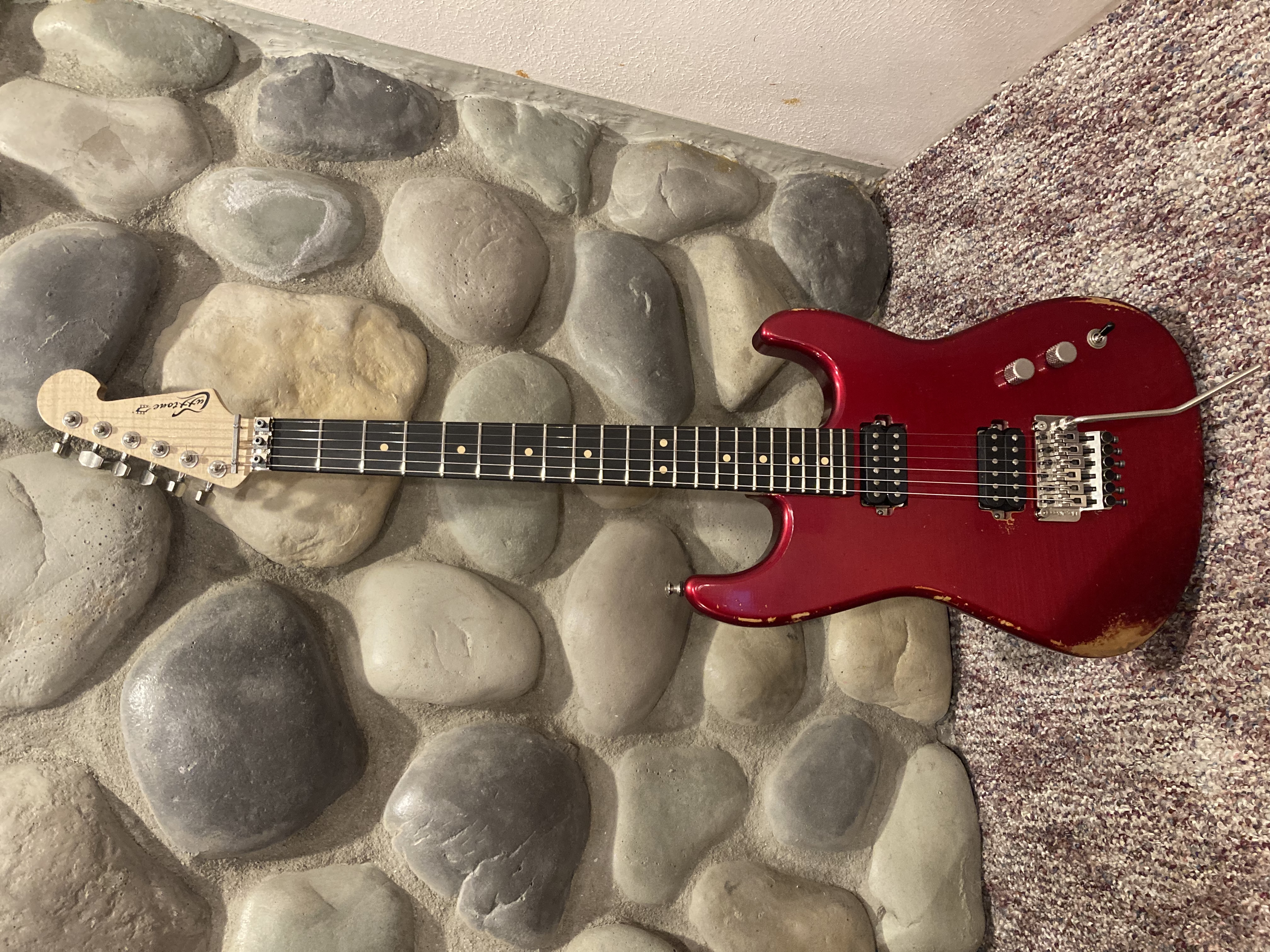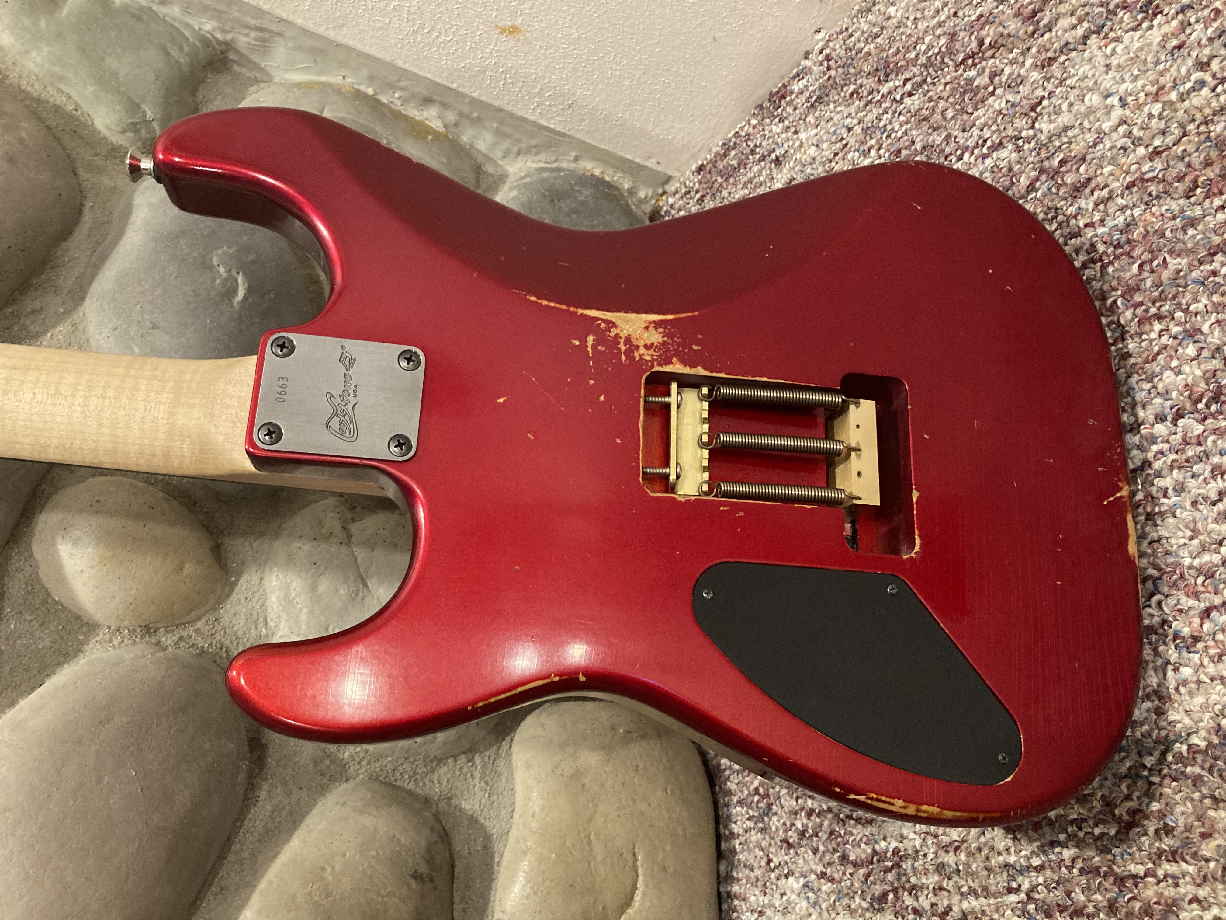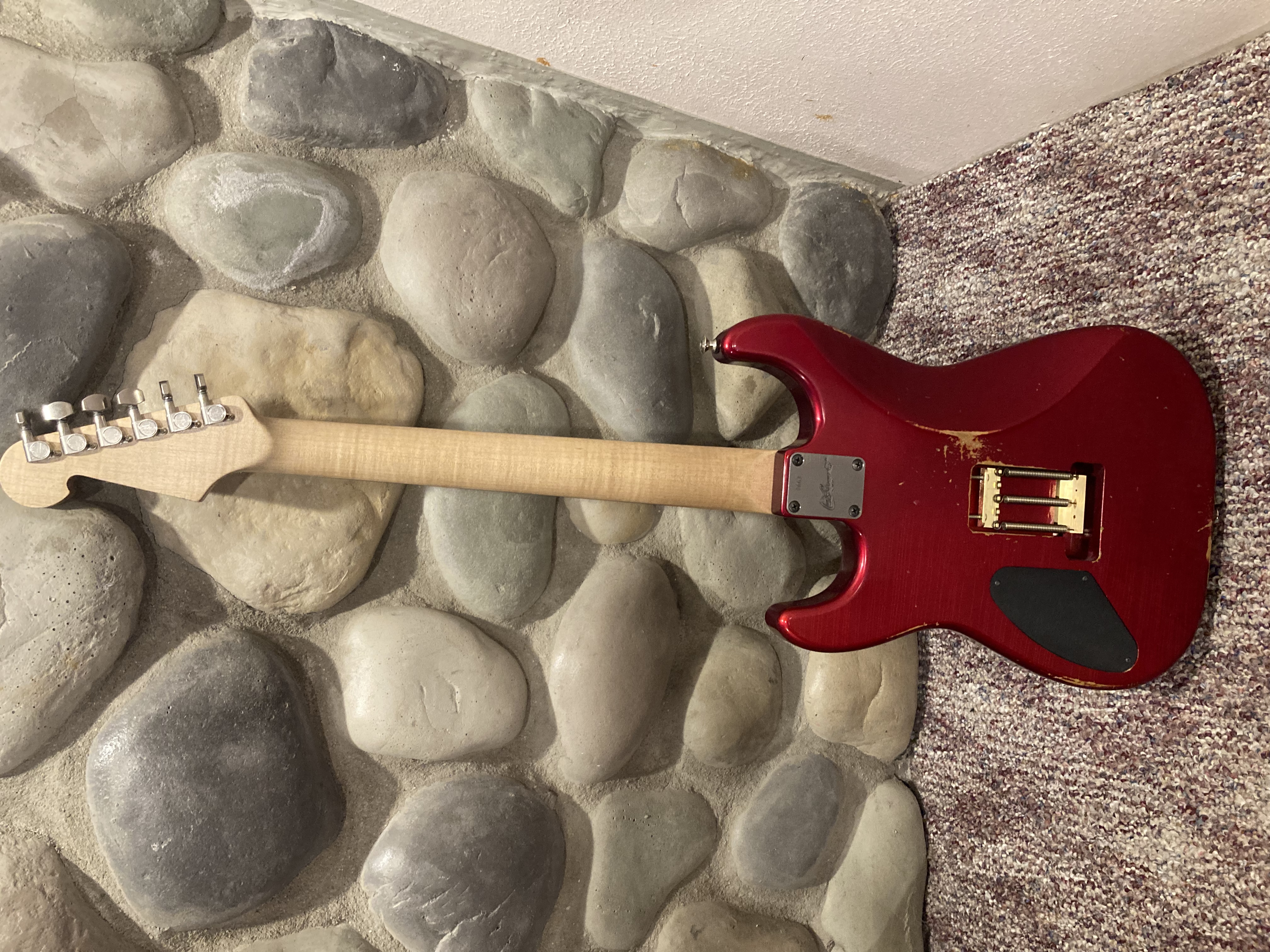 Aged Candy Apple Red Nitro finish painted over metallic gold