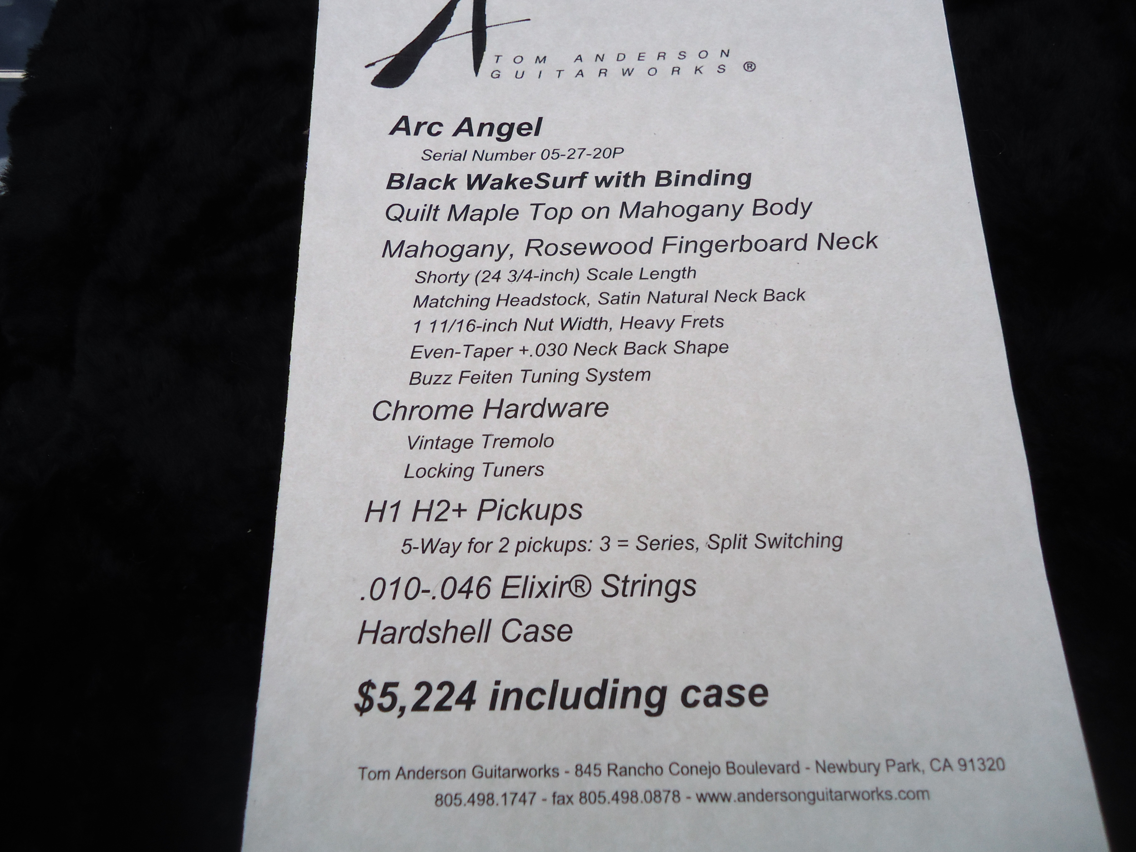 Absolutely mint 2020 Tom Anderson Arc Angel In black Wakesurf with binding . This guitar is stunning , sounds great , plays great and looks great. These are 24 fret short scale guitars and rarely come up for sale used. The full specs are on the spec sheet shown and it comes with OHSC and strap and case candy . 3700.00 or reasonable offers.