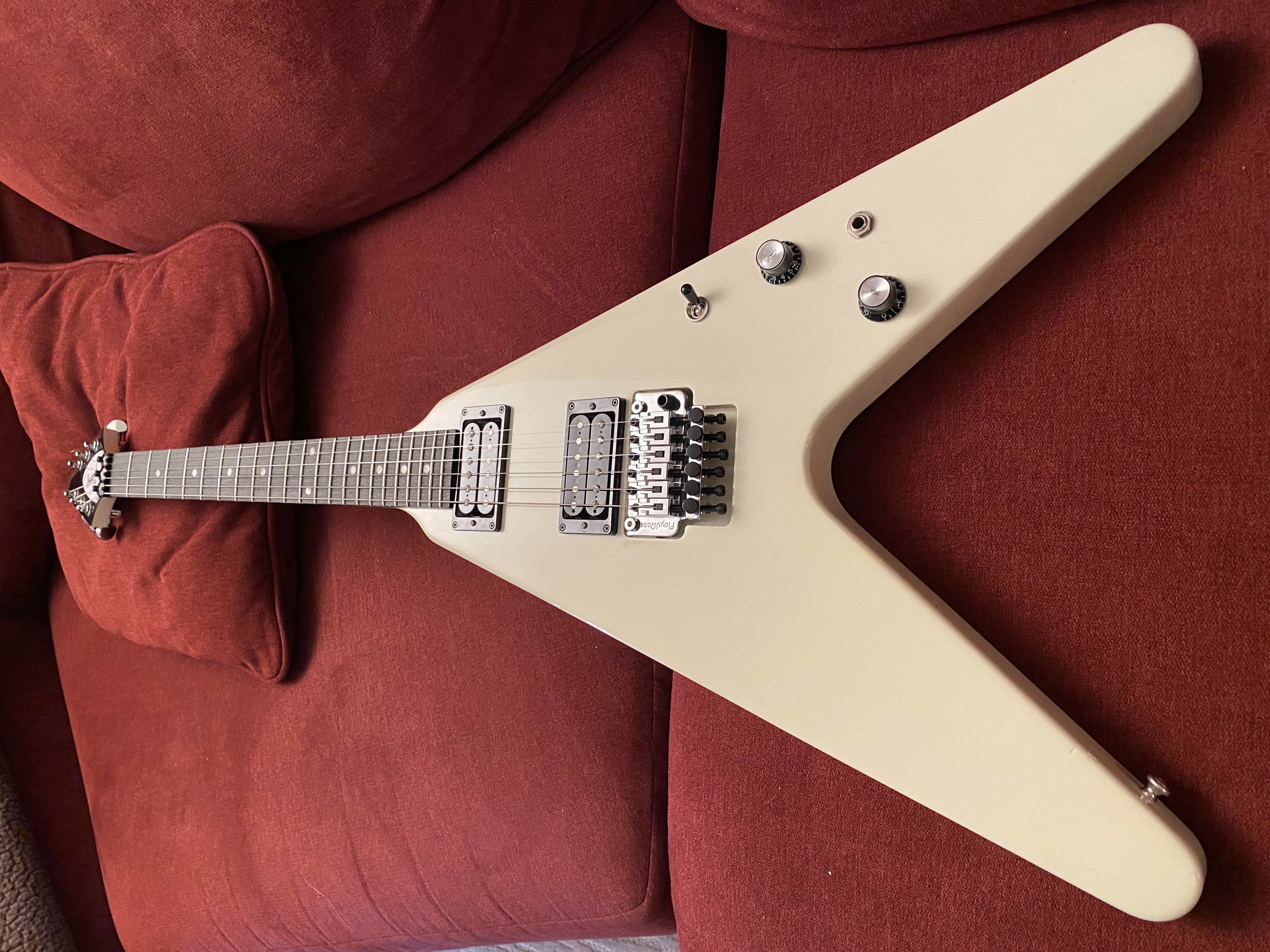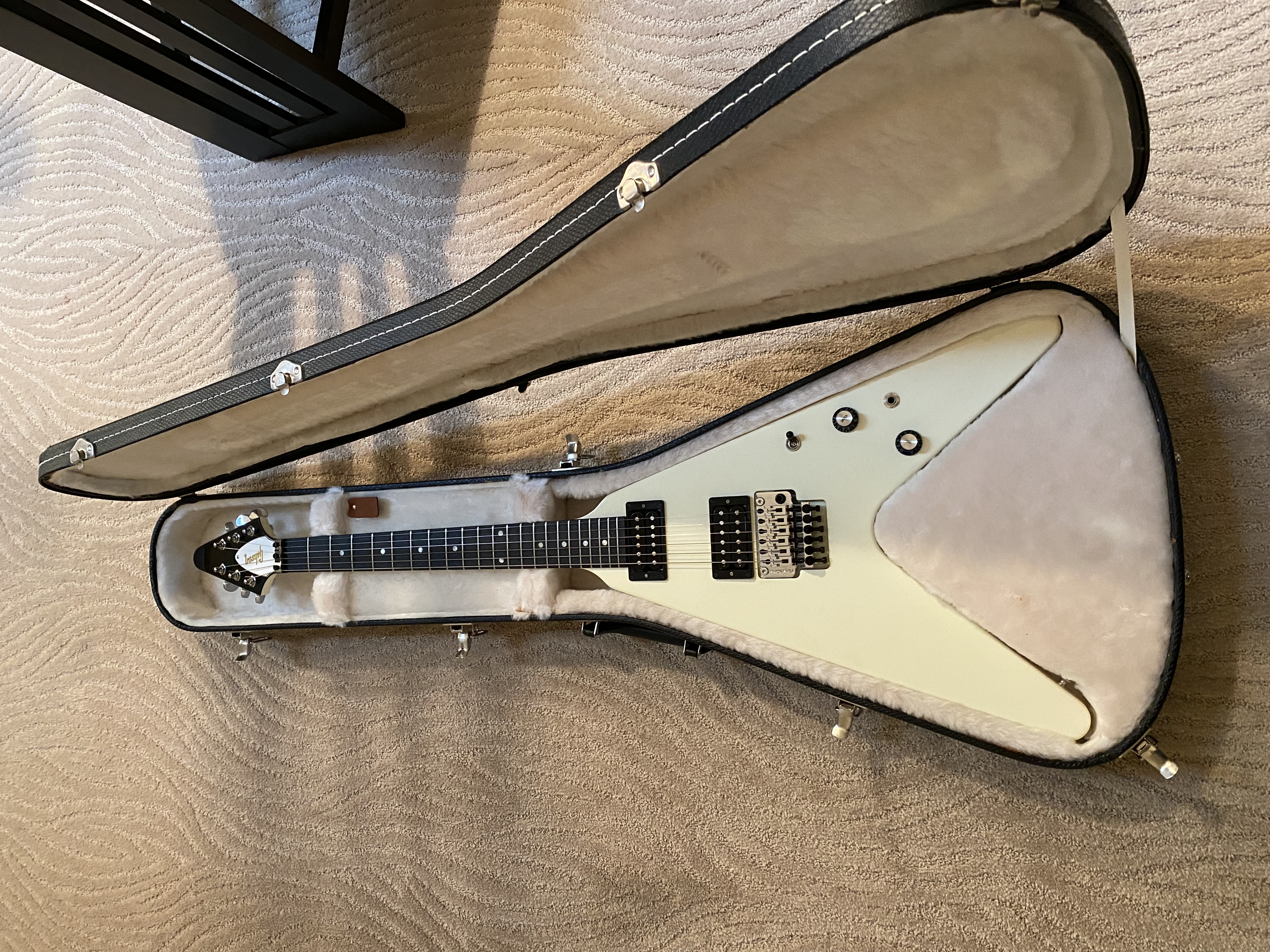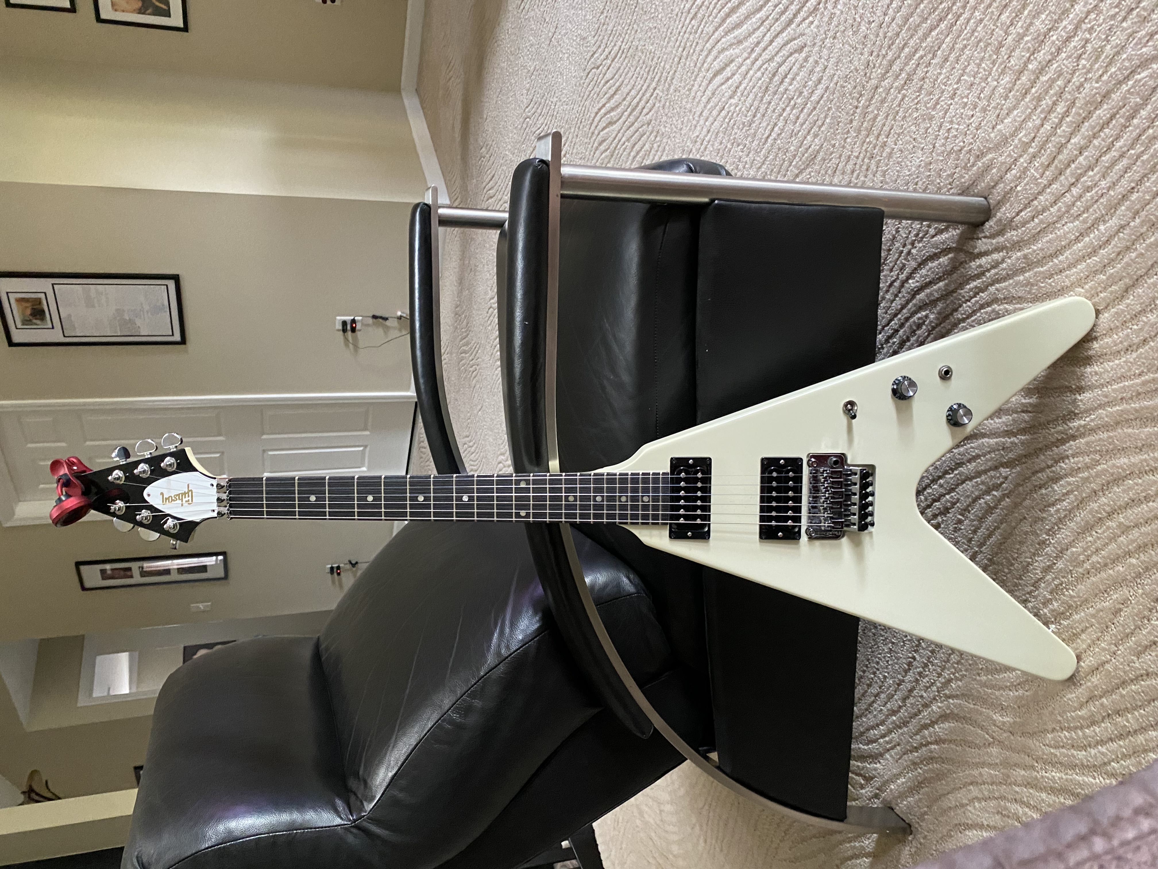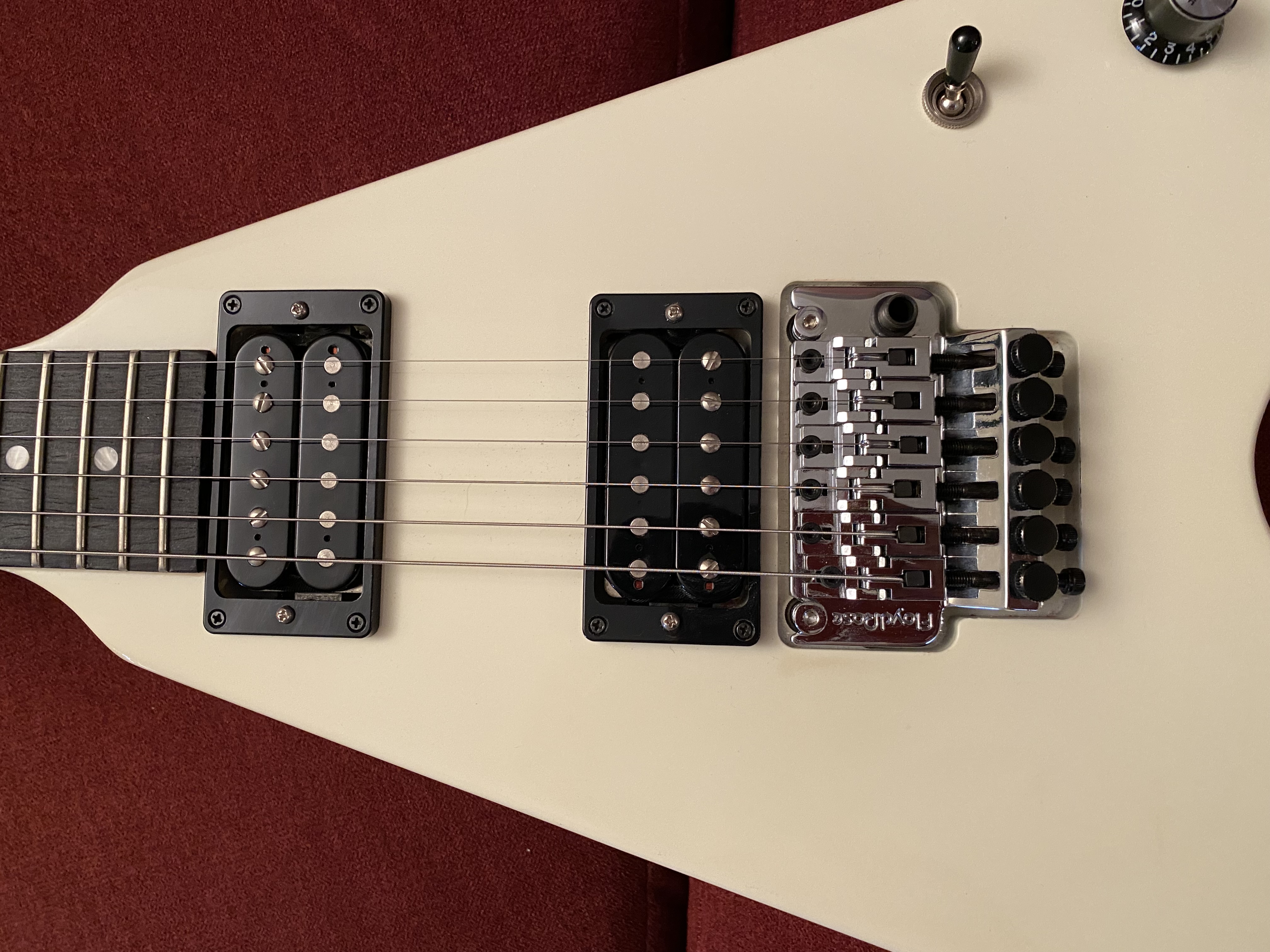 As it says. Has tremel no in stop position. Never used Floyd would need to set up . Only blemish other than faint scratches from pick is in picture. Slight checking in nitro on back of headstock. Nut shimmed lightly looks like from factory. Only made a hundred or so of these. Has 496 and 500 pickups. Not my faves but original. Original Floyd rose. 2400.00 ppf shipped. No trades