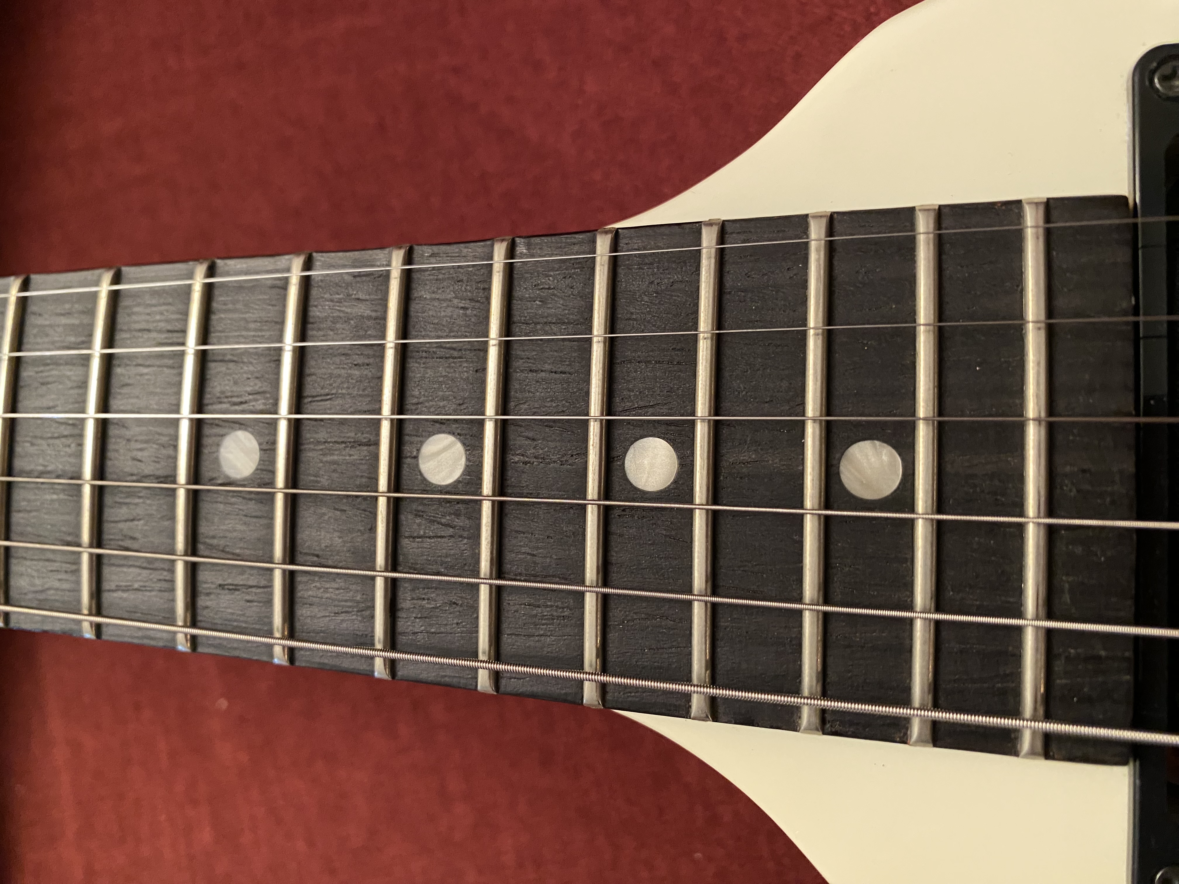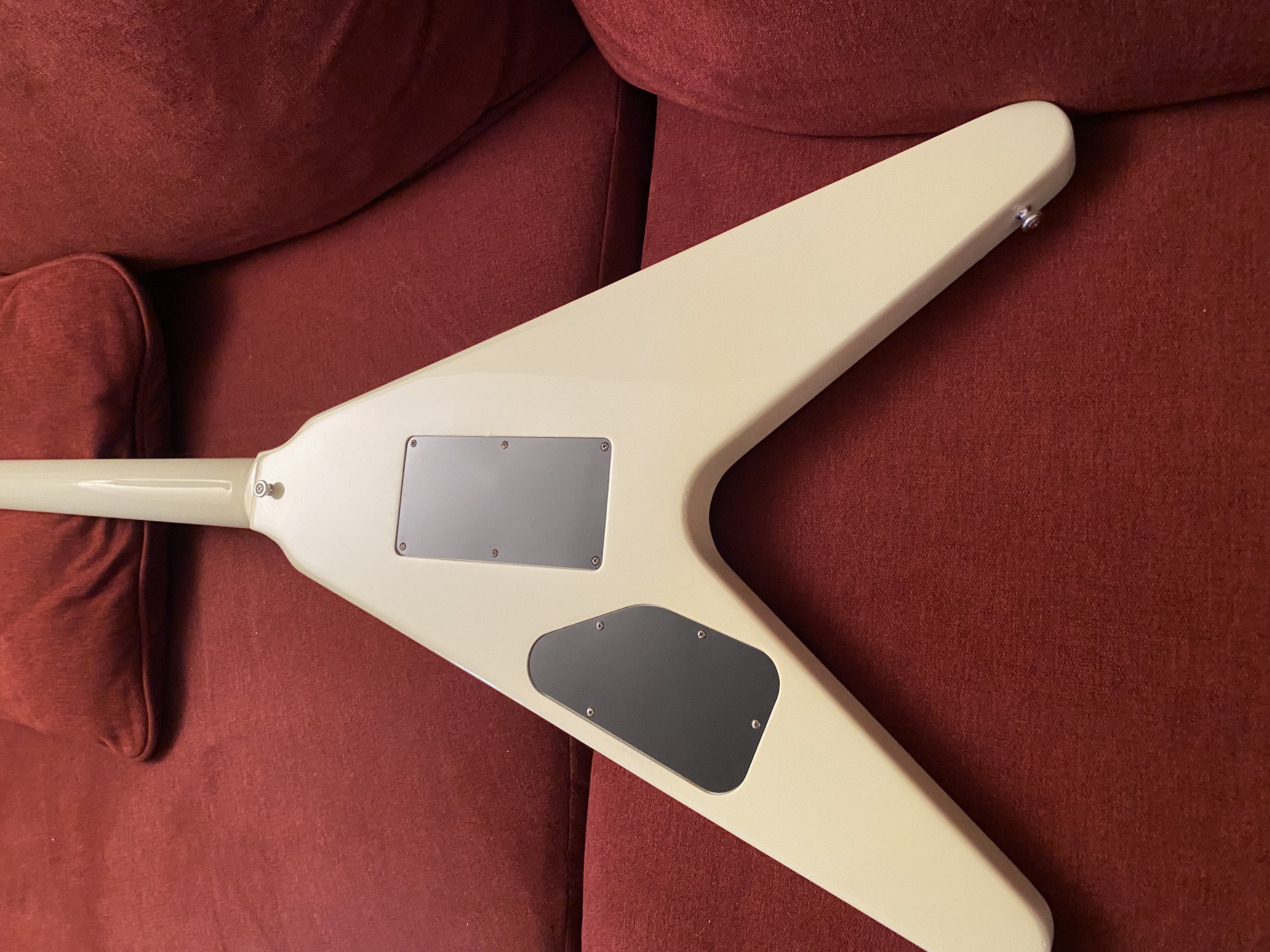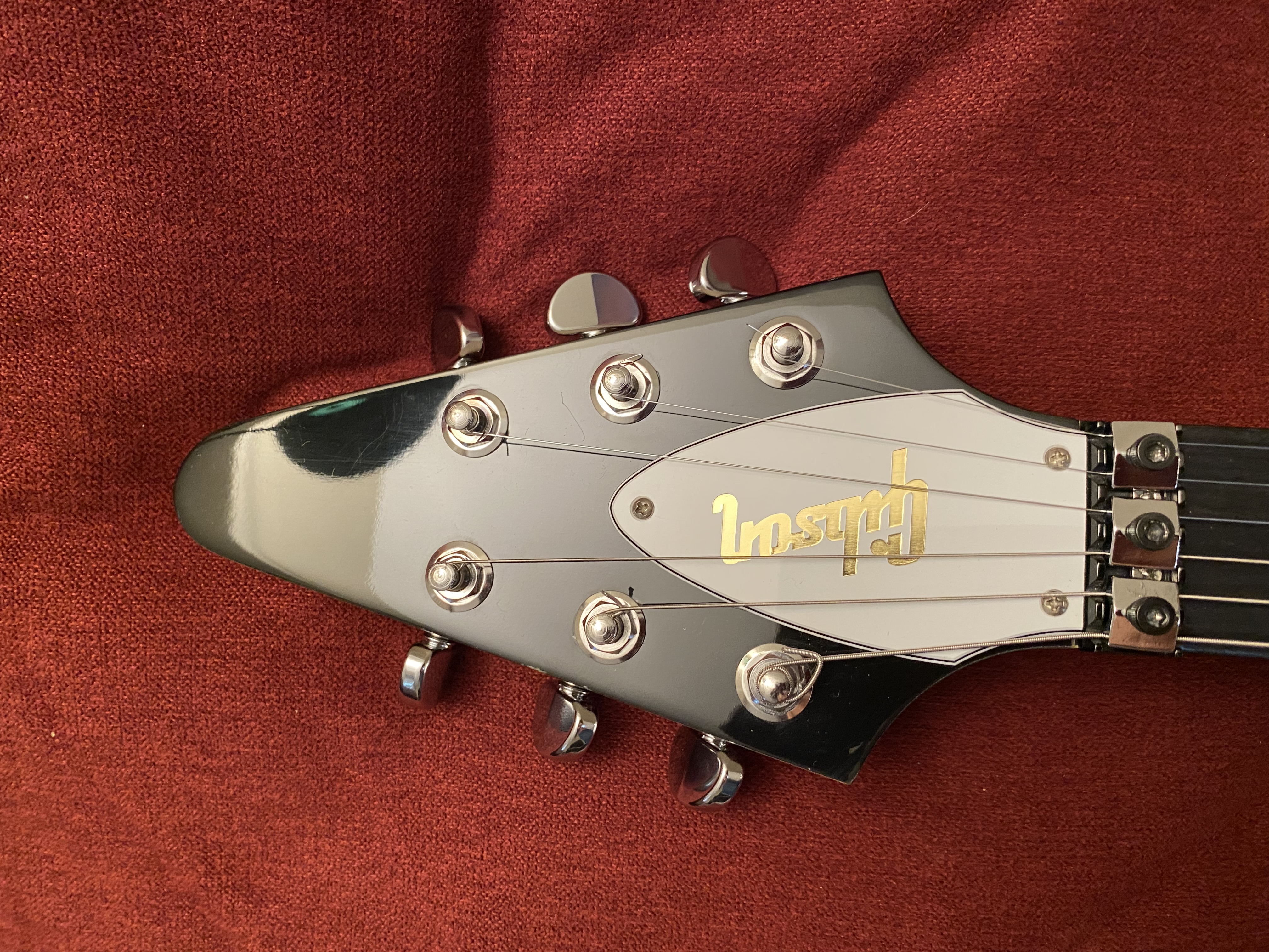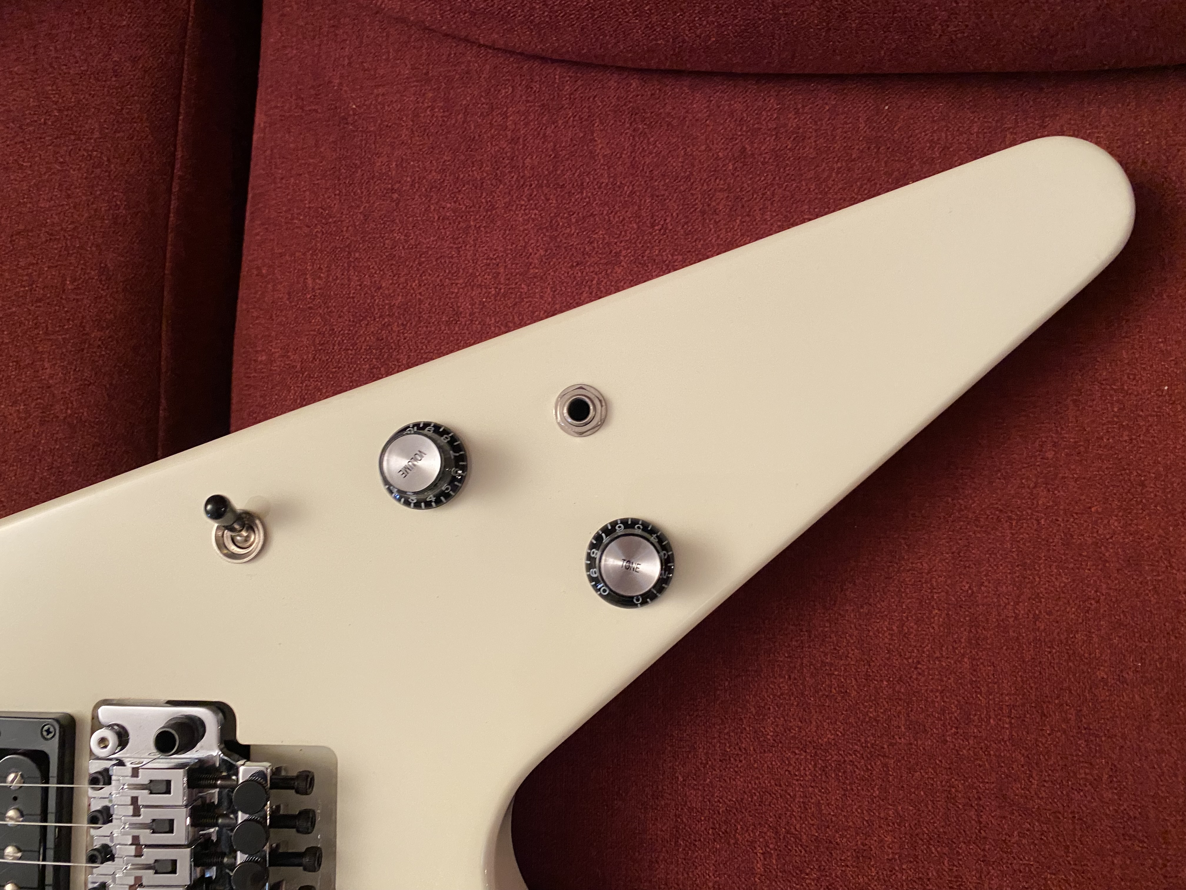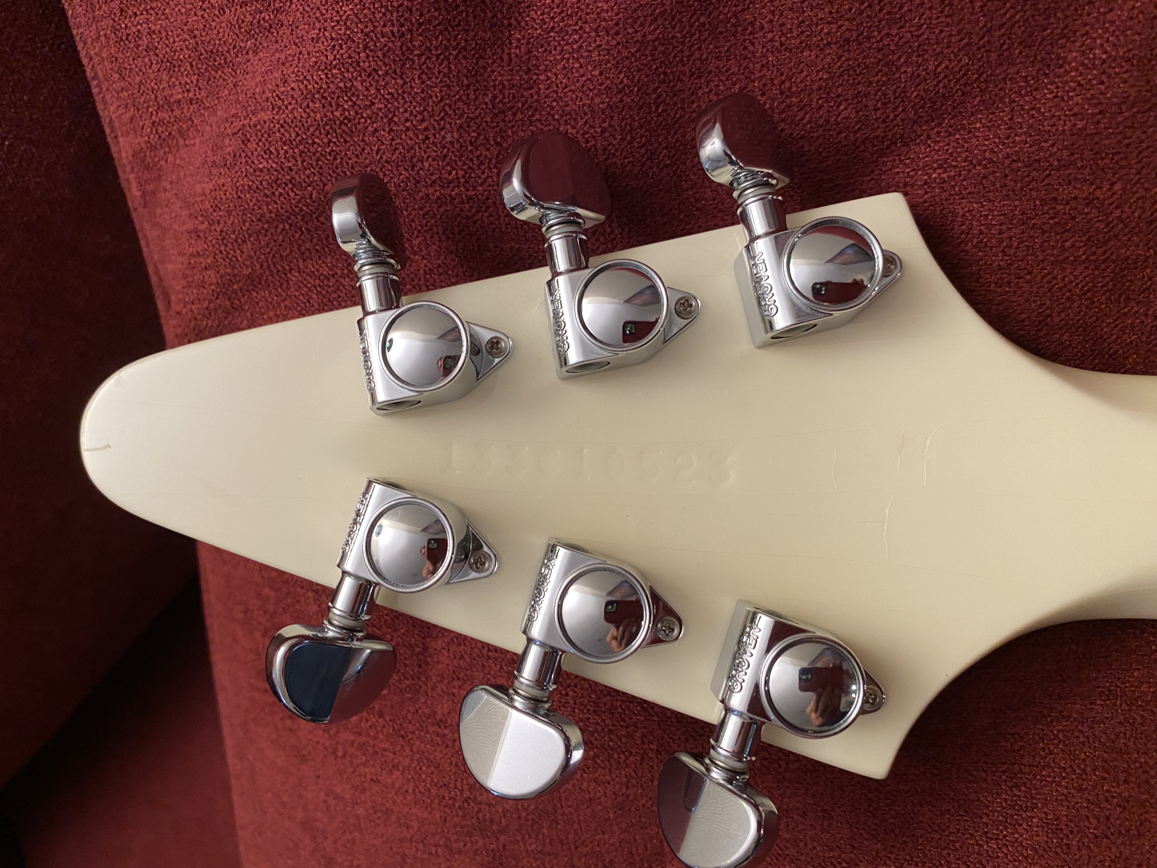 As it says. Has tremel no in stop position. Never used Floyd would need to set up . Only blemish other than faint scratches from pick is in picture. Slight checking in nitro on back of headstock. Nut shimmed lightly looks like from factory. Only made a hundred or so of these. Has 496 and 500 pickups. Not my faves but original. Original Floyd rose. 2400.00 ppf shipped. No trades