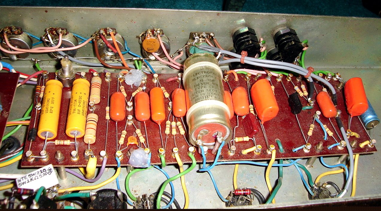 With the exception of EL34s and the 1202-119, this amp is identical to its immediate predecessor. However, the Vox vents are no longer used; all headcabs use a long narrow went, although its thickness varies. It is uncertain whether all amps used 16uf filtering in the preamp or whether dual preamp filtering was introduced. Although a few pictures, reports, and recordings exist, this amp is very rare and has not been reissued or recreated (except by the present author). Serial numbers seem to be confined to the 7200 range"