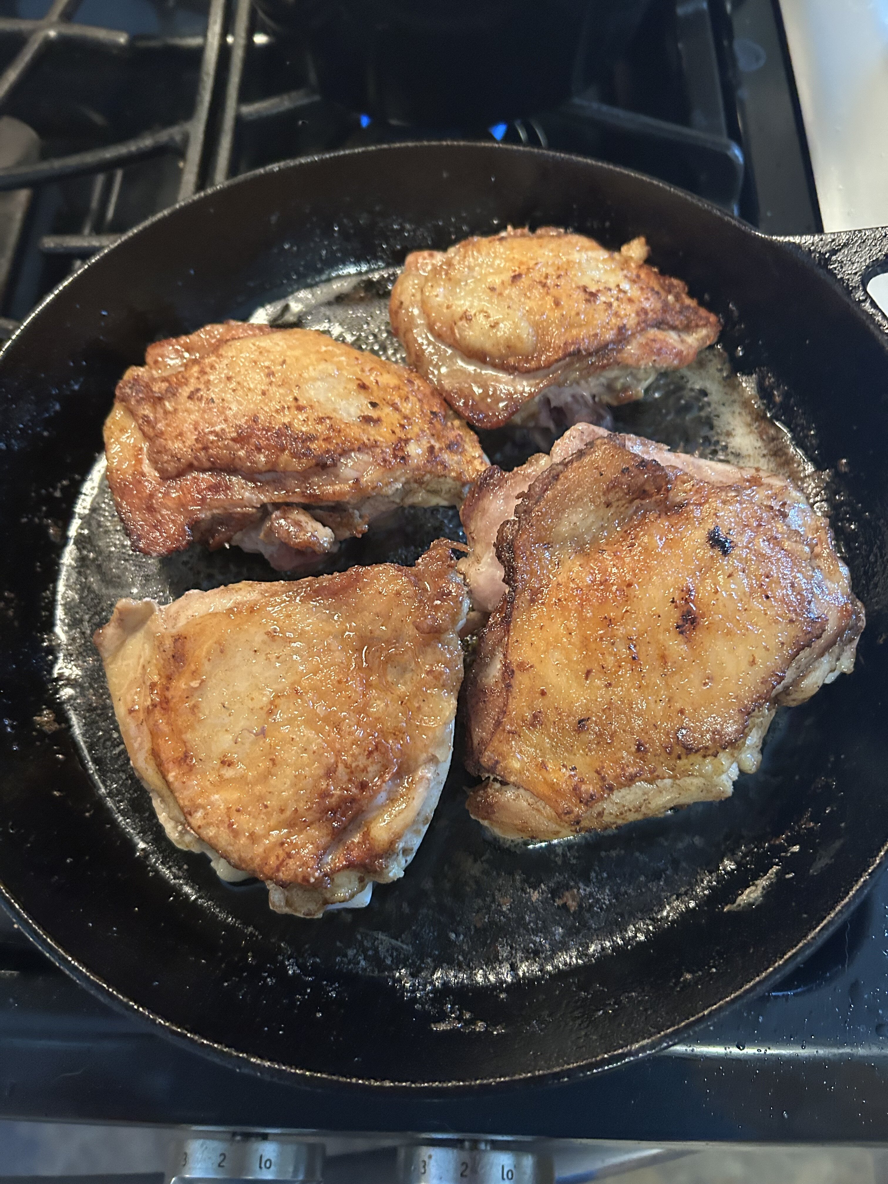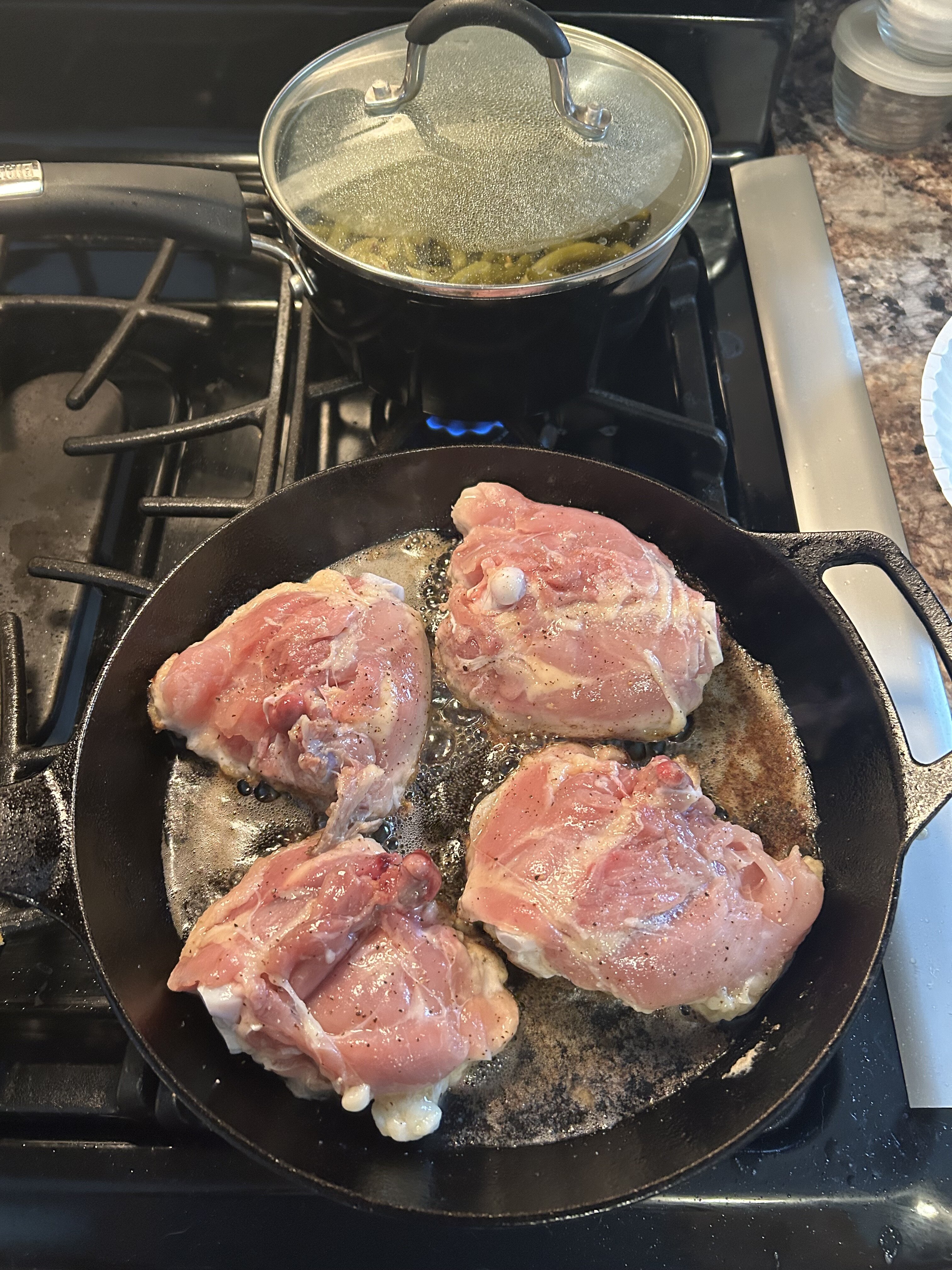 Steps 1and 2… Today's menu? Crispy chicken thighs with homegrown green beans and (manipulated) Stove Stop stuffing…