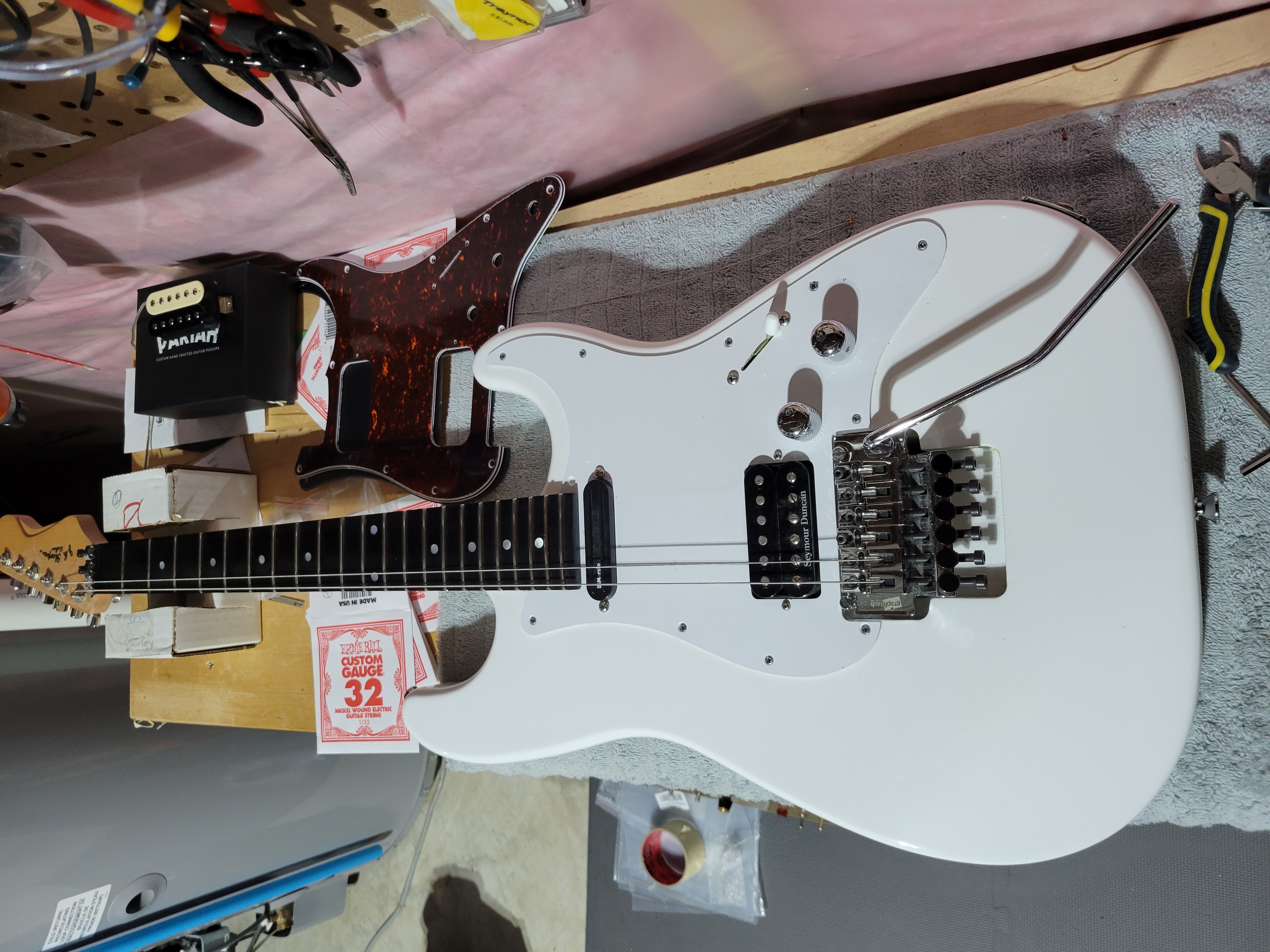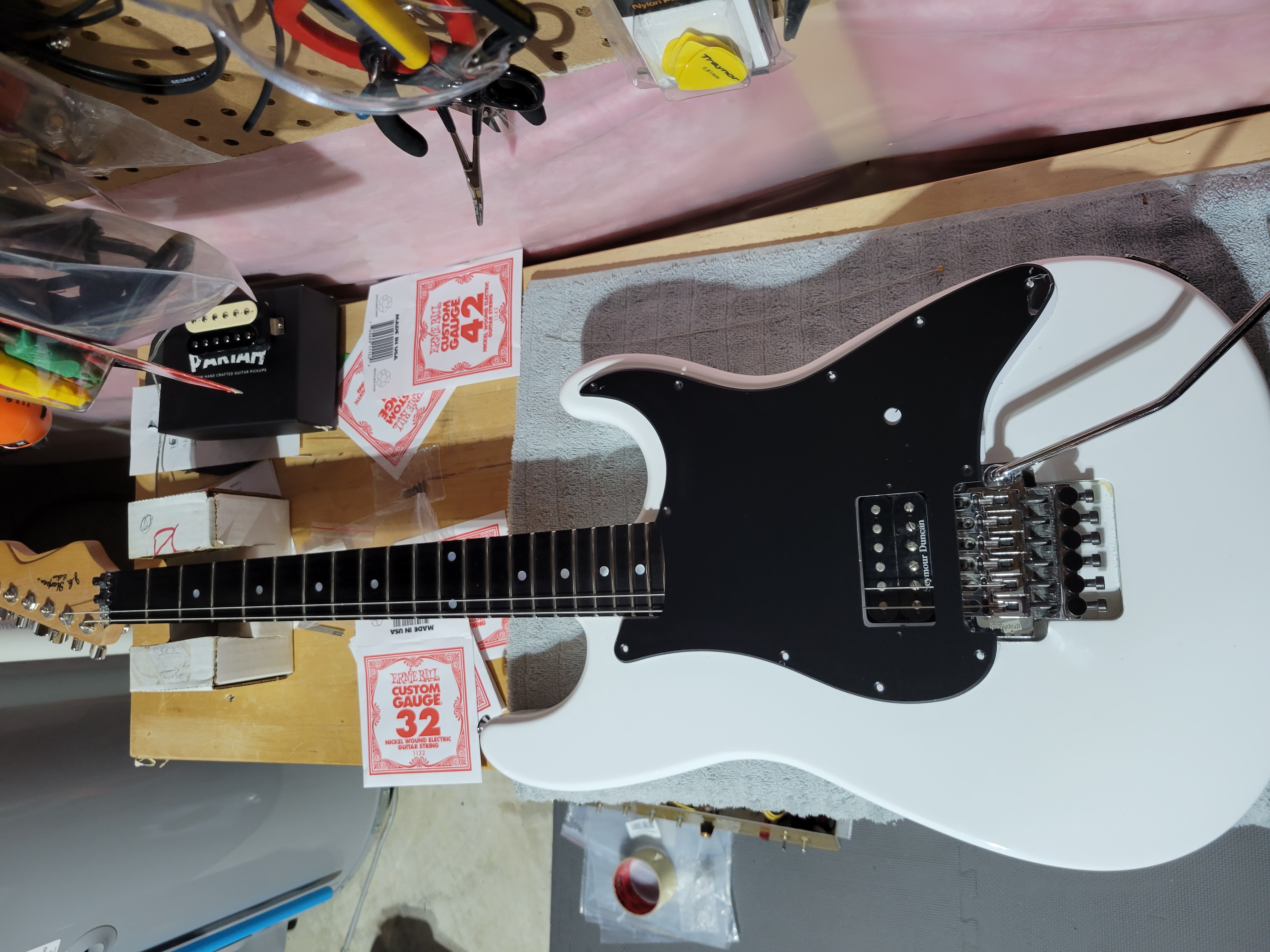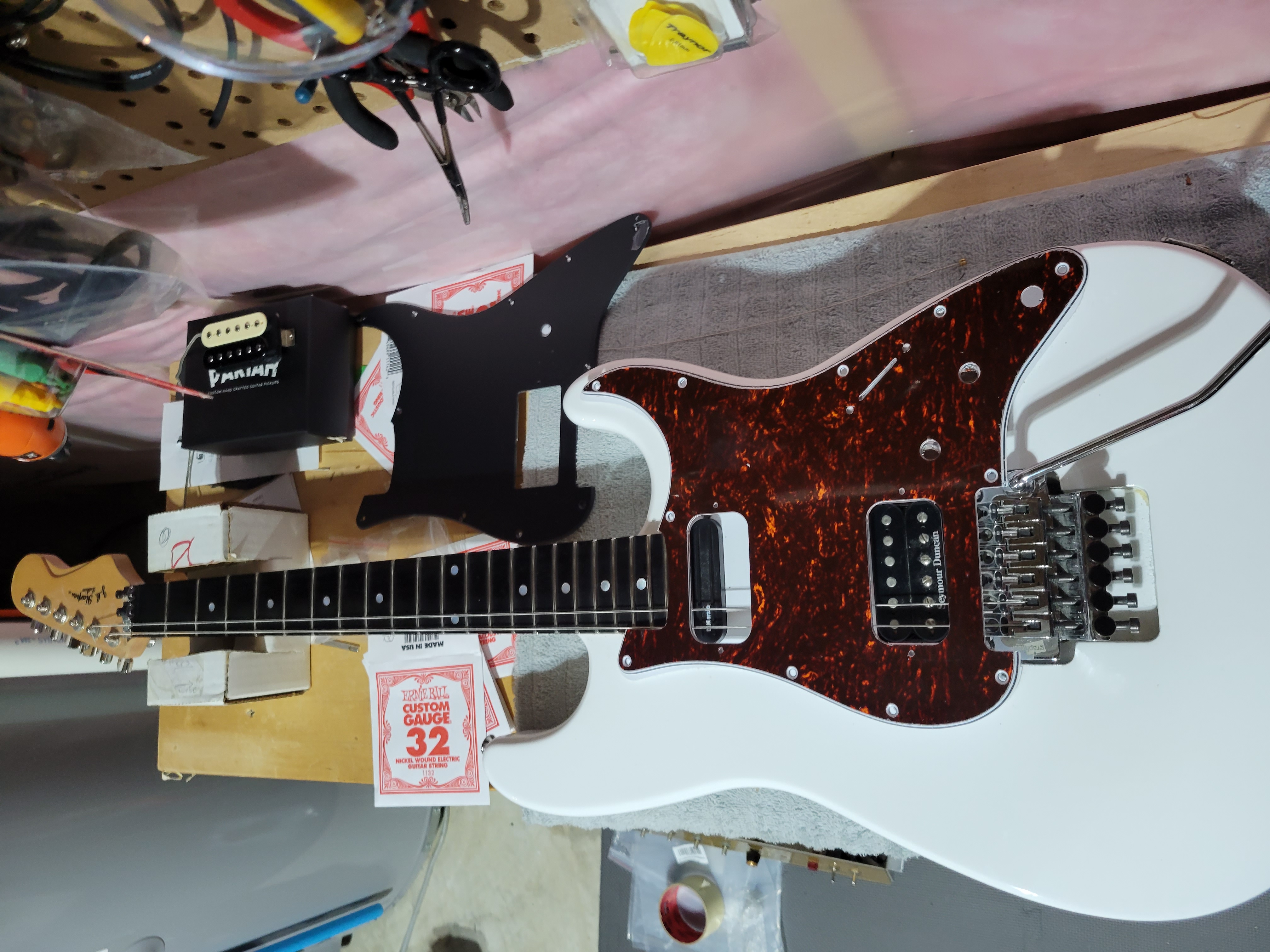 What do you guys think? Pictured below is probably my best playing superstrat. The Neck is so smooth and the JB2 just works so well. This one is amazing to play. I'm bored of the storm trooper look though, think it is time to switch it up. Black pickguard looks mean , but the red gives off Mick Mars vibes. Leaning towards that with a 36 anni neck humbucker. ( my fave neck humbucker currently) Will probably add a D tuna but wondering about knob colour. Stay the chrome or go the fender yellow/aged look like Mick's?