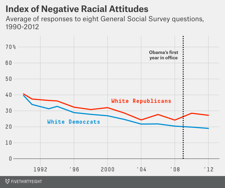 The chart says that if you've got white people who are racist, more of them will be Republicans.