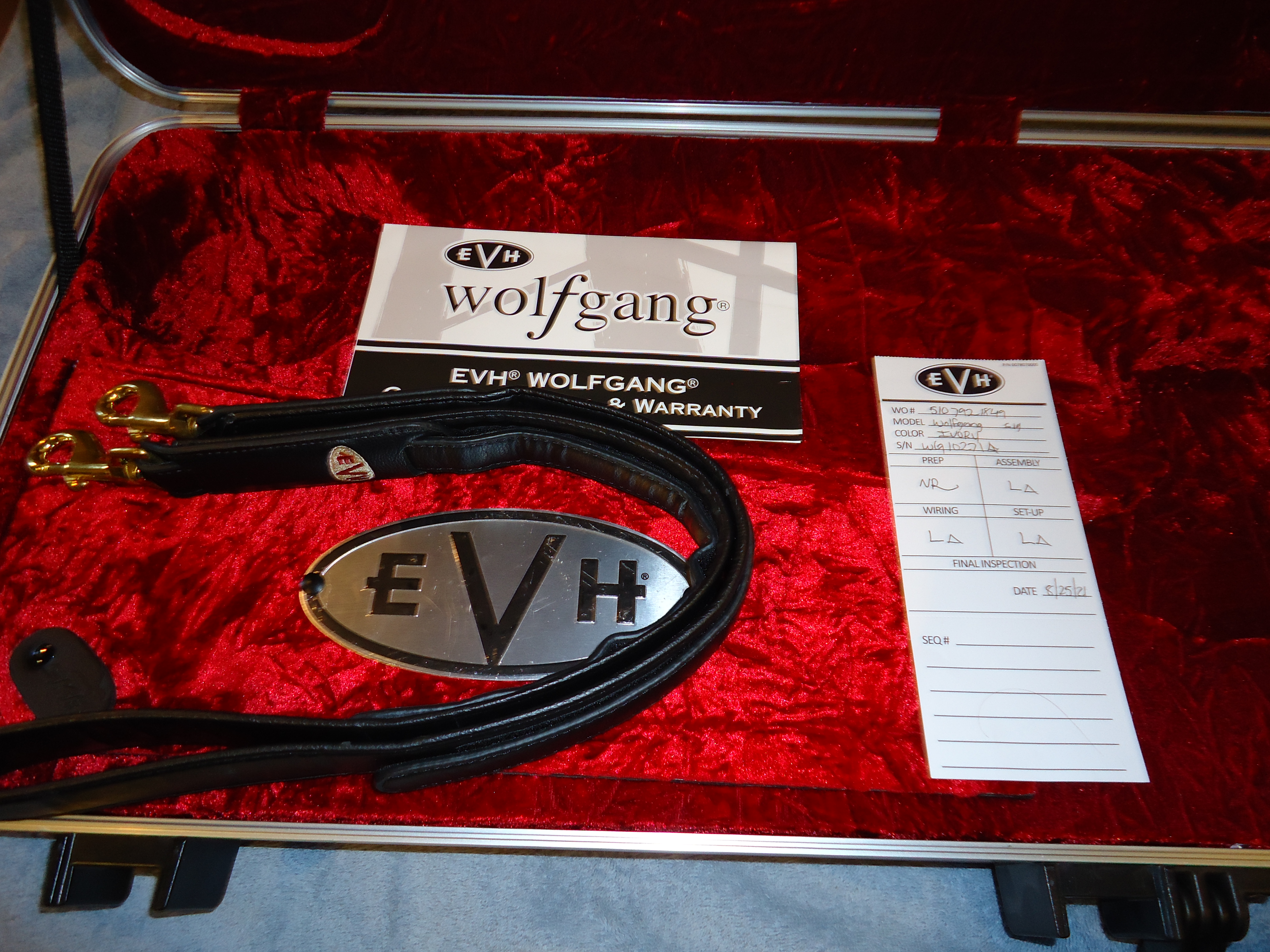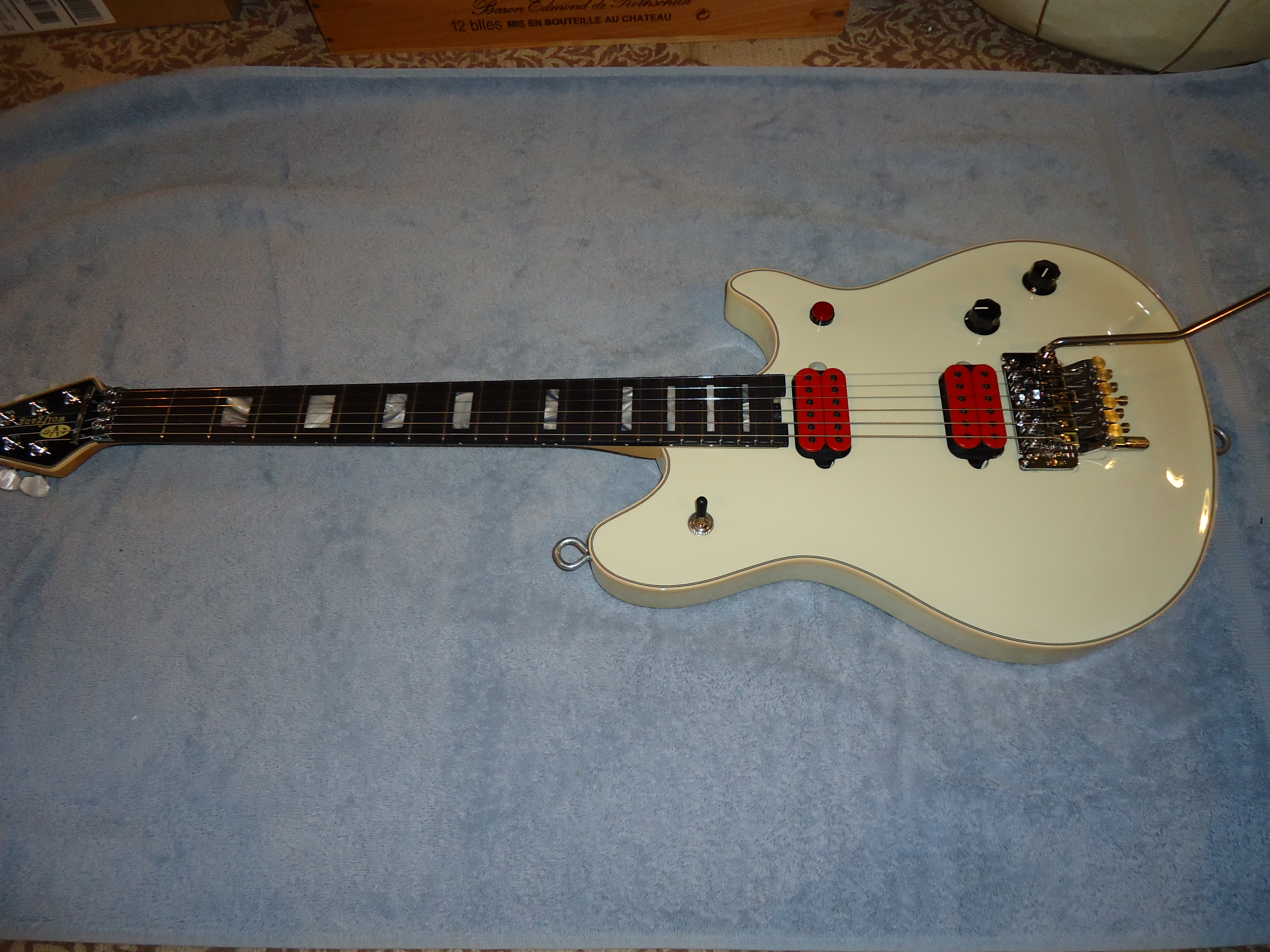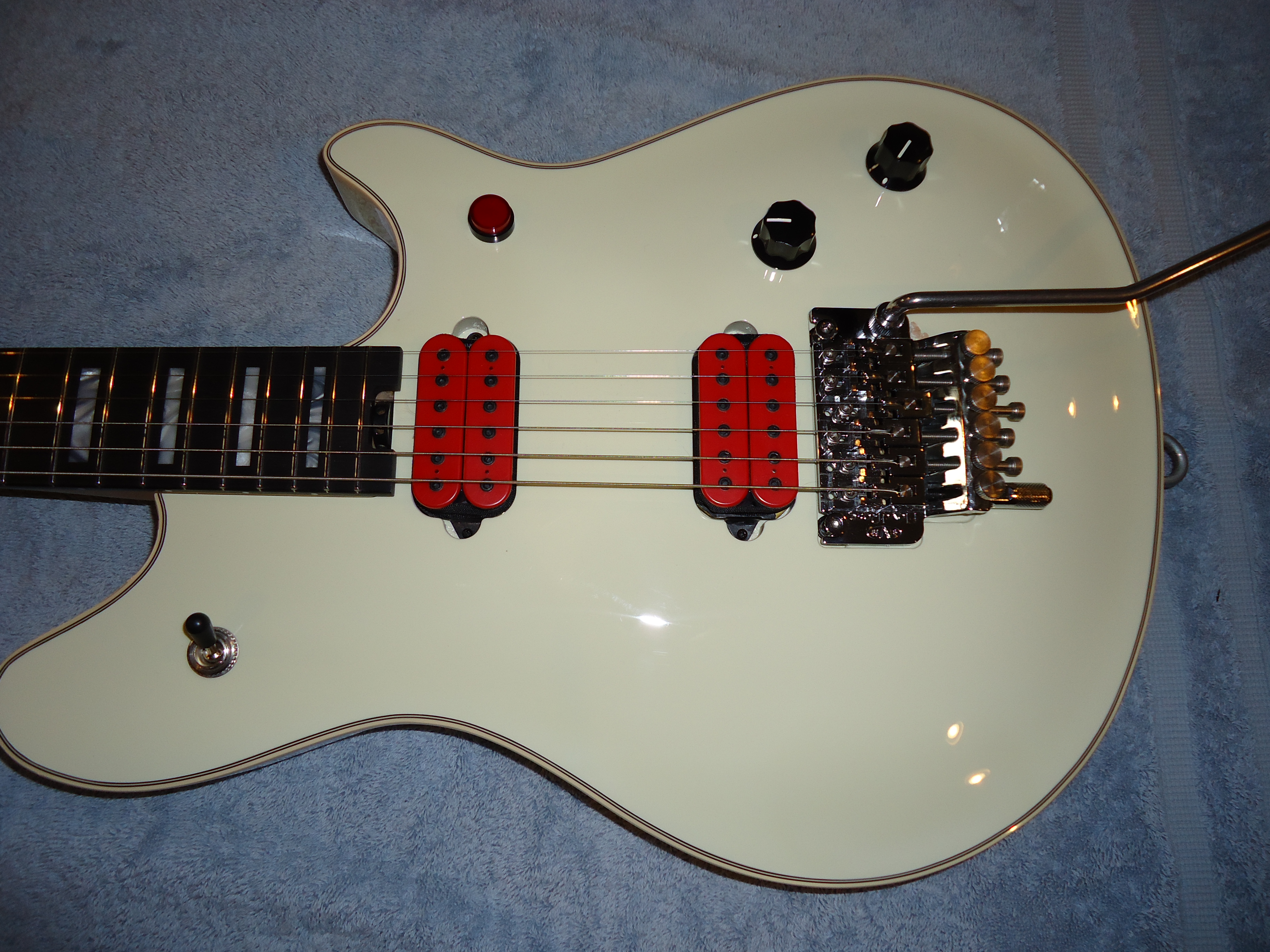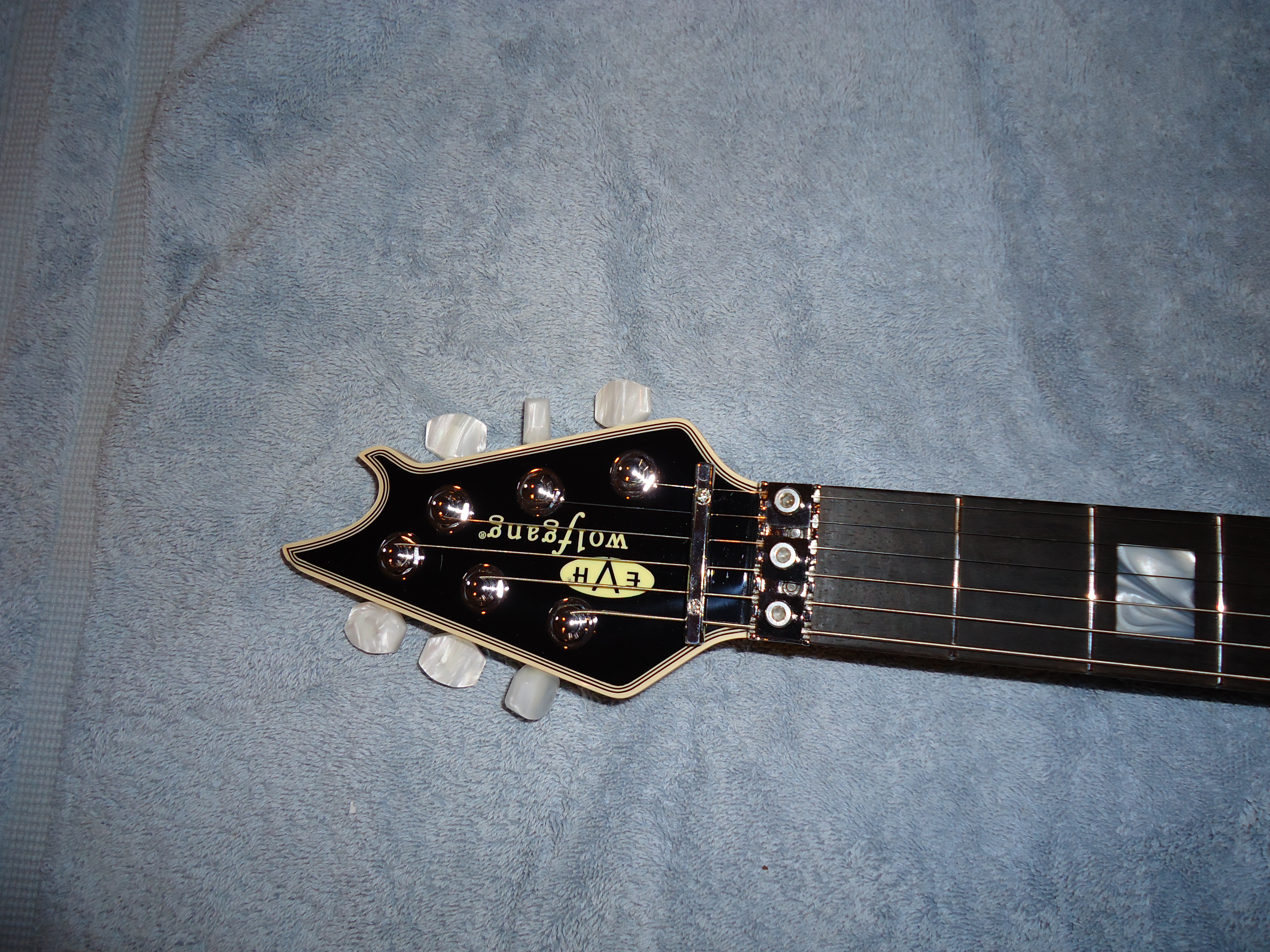 Up for sale is my EVH signature series Wolfgang axe. If you're looking at this I'm sure you're familiar with the guitar .To start out I'm the second owner . The first one changed out the pickups to suit his musical needs . The neck is a Dimarzio John Petrucci liquifire and the bridge is a Dimarzio Jake Bowen titan . They both sound fine but they are not stock and I don't have the stock pickups . If you like red these are for you OR if you have your favorite pickups to put in it this will be a great deal !!! This guitar plays and sounds great but the reason I'm selling it this cheap is the nut width on the Wolfgangs are narrow 1.625 I think , and they hard for me to play . For some reason I didn't check that when I bought it . I've owned it for the last year and haven't played it much . I was going to change the pickups but by the time I had that done I would still have the same nut width which is really the problem and alot more money in the guitar. There's a small chip in the paint by the Floyd that may or may not show up in the pic other than that everything is good. This guitar has great wood resonance unplugged and the ebony fretboard is awesome ! It comes with the case and case candy Looking for 2950 shipped to you . NO TRADES at this time .