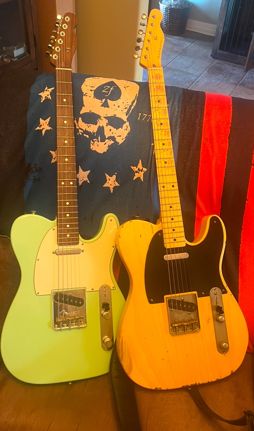 Decided to show my teles which I love dearly. When i’m not in my 80’s rock/metal mood, I love a good tele and play mostly clean stuff. My Fender is alder body with an all rosewood neck with Lollar ‘52 pickups. My Nash is ash body with Lollar Vintage neck and Lollar Special bridge. Teles are just great in my opinion.