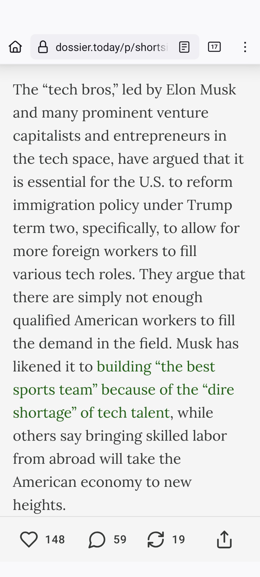 I guess now we see why Elon and WEF Vivek wormed their way into the Trump campaign....they had to make sure Trump really didn't enforce strict immigration laws otherwise American talent would cost them more money and benefits.Musk is now banning people on Twitter that are critical of this position. What an absolute bag of shit.