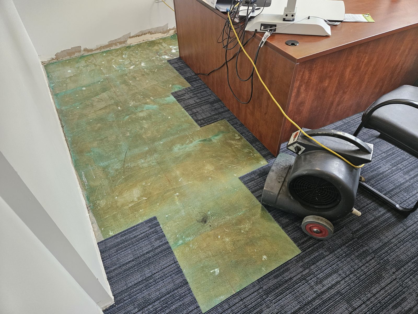 “Under this desk, directly under the computer is where the most water is. Point the fans at this wet spot on the floor and towards the wall where the leak is coming from”