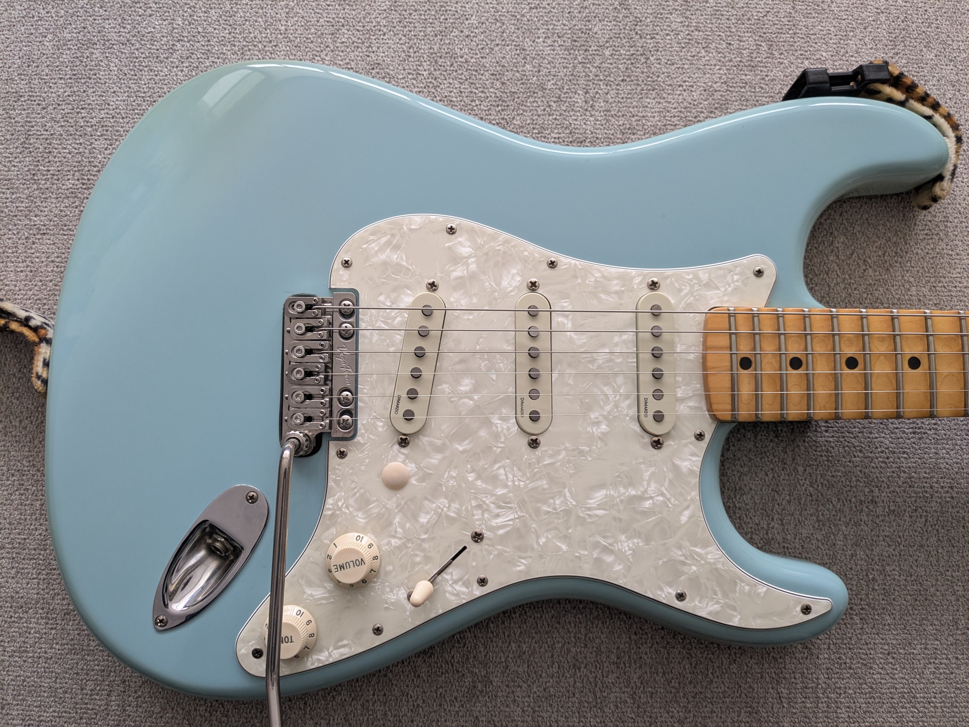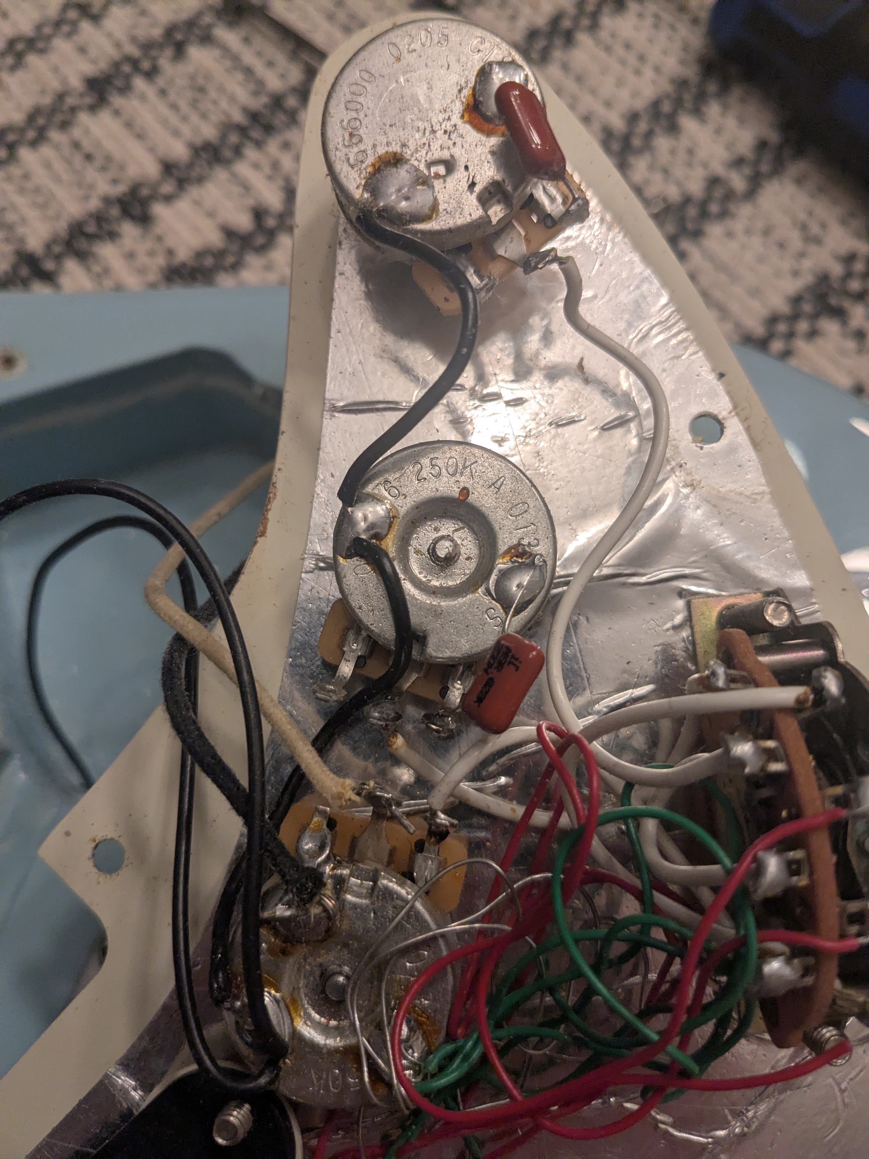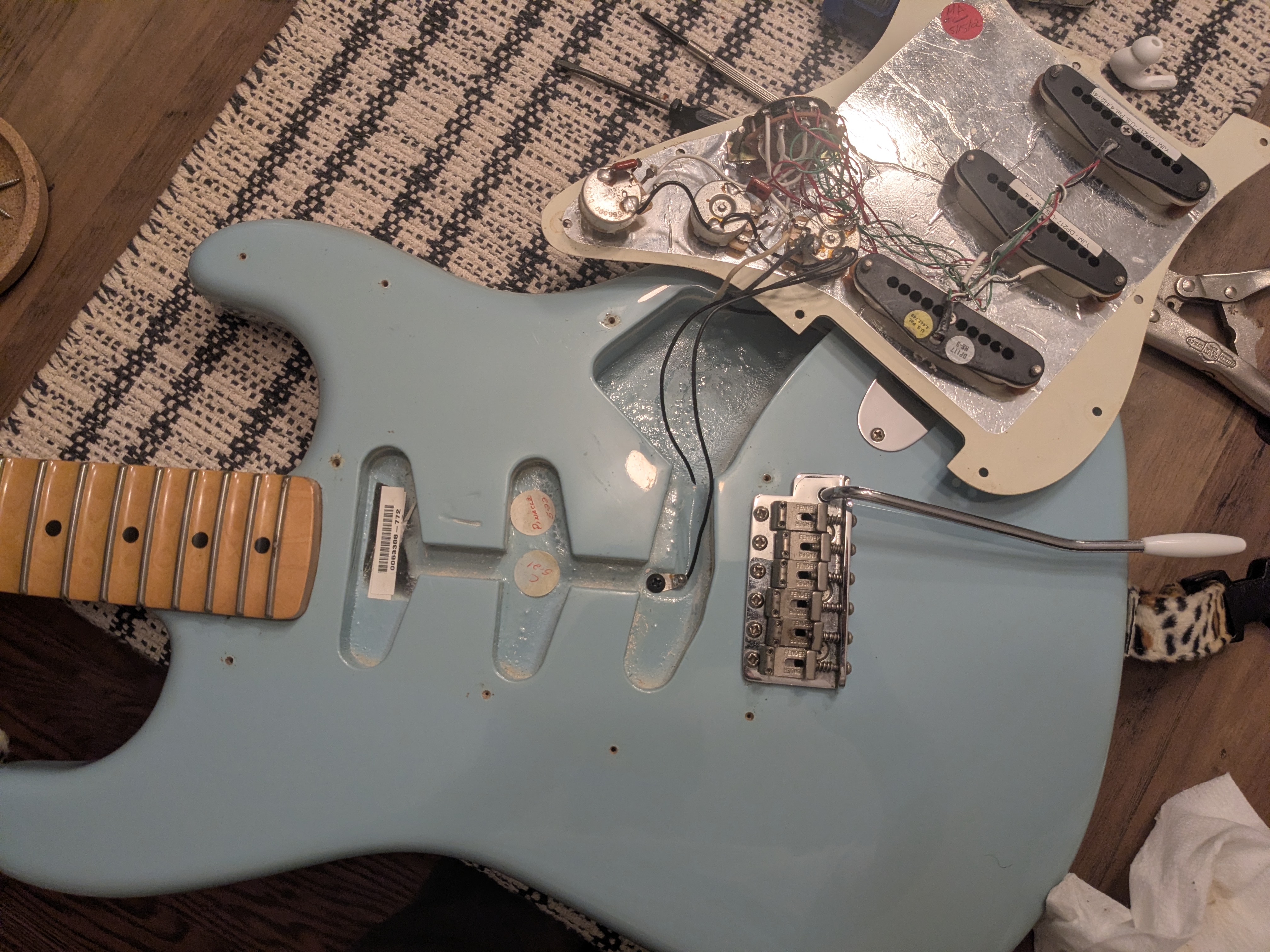 Pickguard - Swapped out the Mint for a Vintage Pearl pickguard. I knew from previous Strat ownership I wanted to rewire it to have a single tone and move the volume back, but you can imagine my horror when I popped the guard off to reveal this nightmare of a wiring job. I decided to leave that for a rainy day (possibly a biblical flood) and for the time being, have the middle tone pot stuffed back into the cavity under the guard. The hole was plugged with a cheap plug from the hardware store that matched the colour of the knobs close enough.