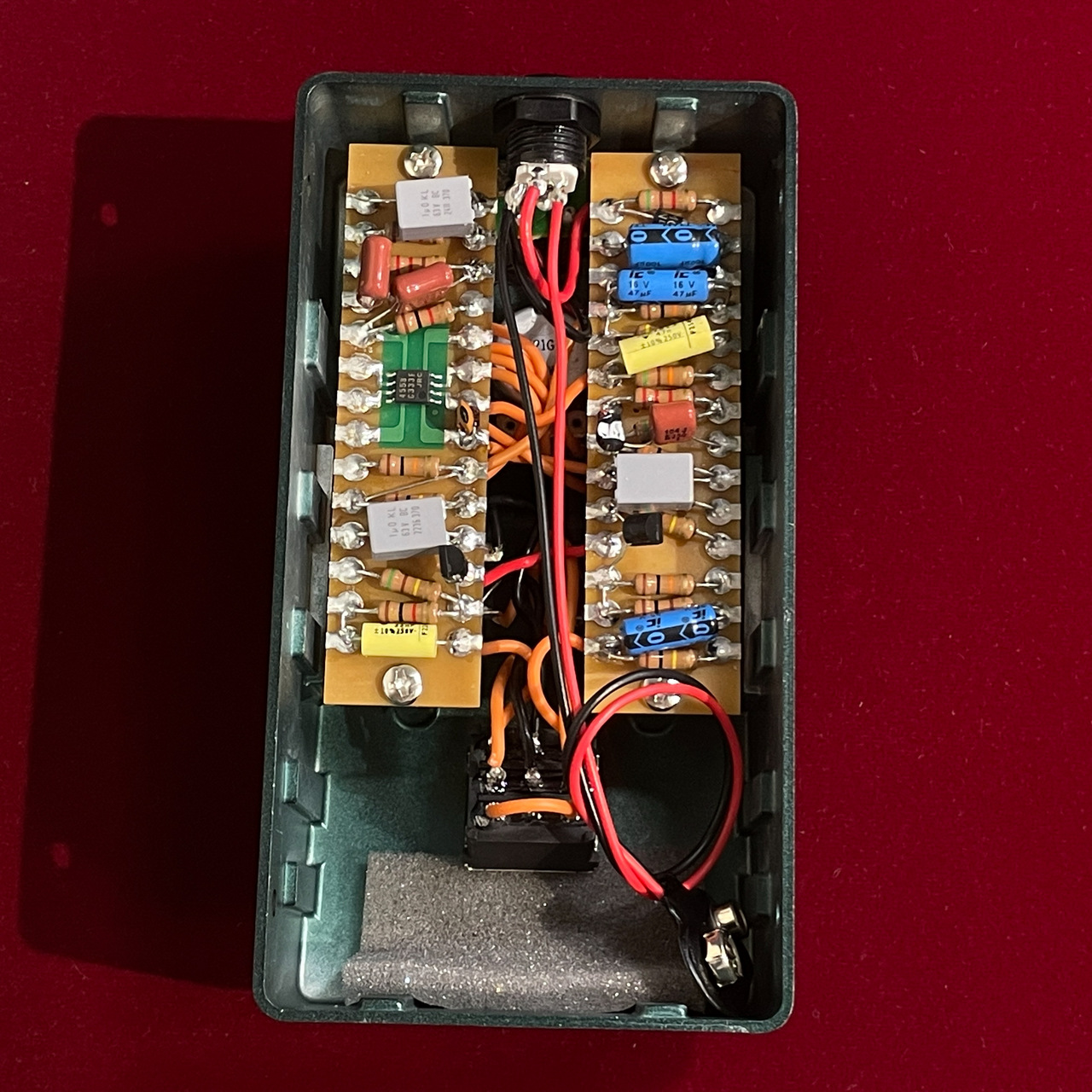 Makes sense.To me it looks like they just made PCBs that are basically eyelet boards but with pads instead of actual eyelets, and then hand-wired everything from there. Hence how they were able to have that little patch of traditional looking PCB for the op-amp. The rest of the board just doesn't have the green solder-mask.