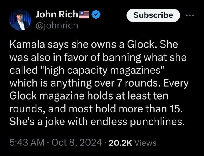Haha...Harris with a 7 round glock and walz with a pump shotgun he can't pump, in charge of national security.
