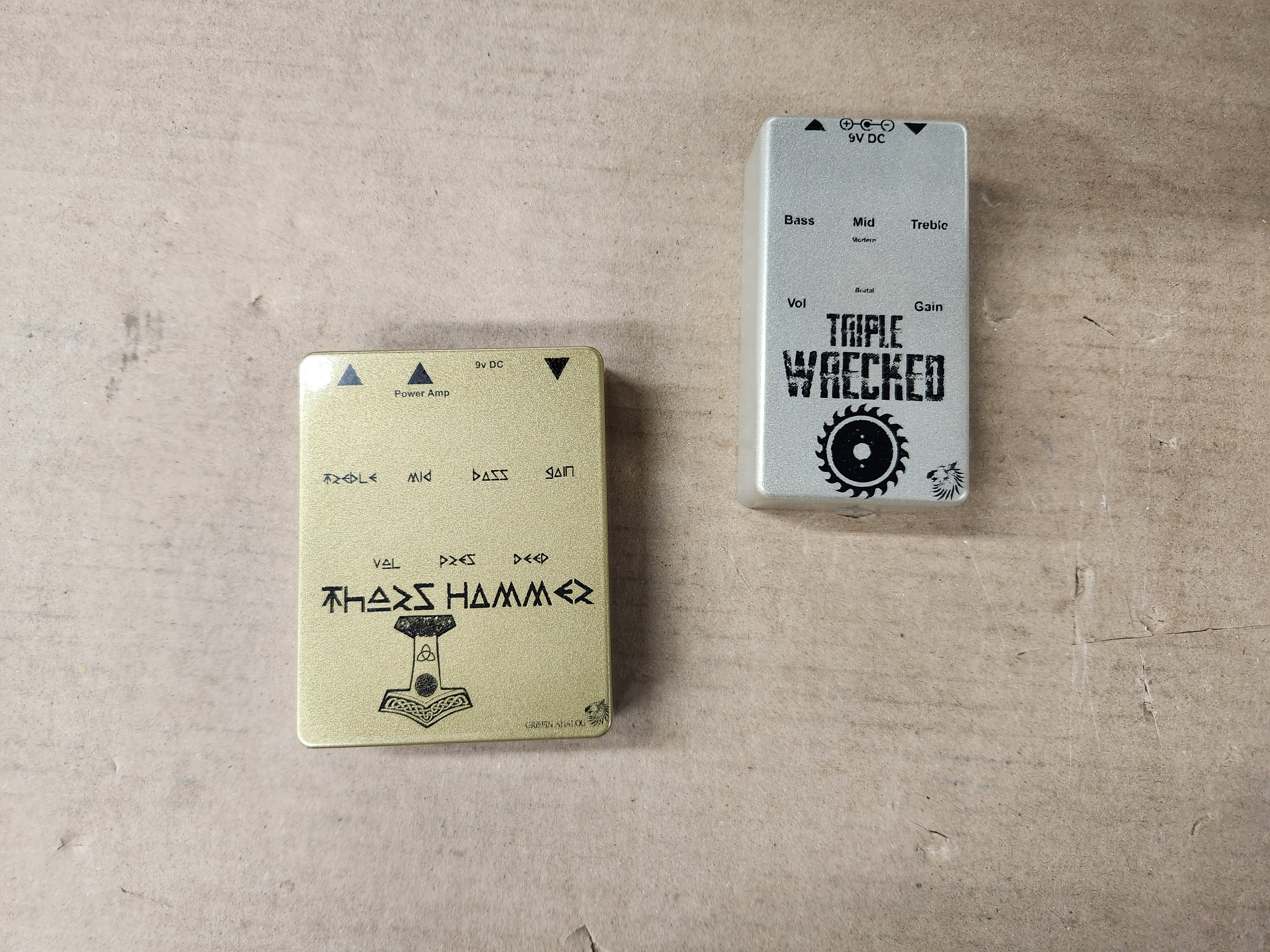 Finished up applying some more graphics ..... a VH4 clone for JackBootedThug that he decided to name " Thor's Hammer " and a Wampler Triple Wreck clone ....going to someone in the future .