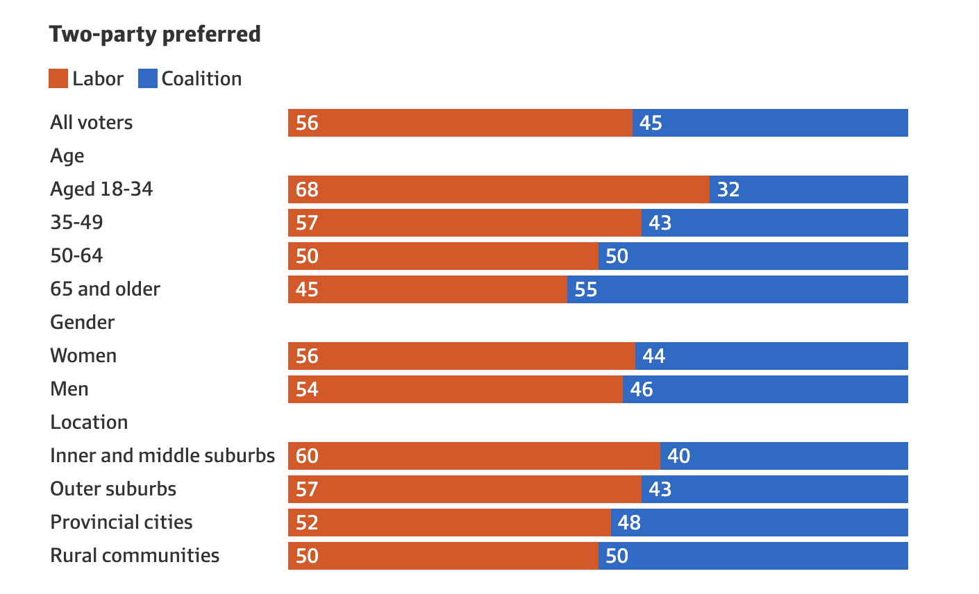 There's a saying here...This is voting in Australia by age showing how the young are indoctrinated and wise up as they get older. Red is leftwing in this case. Blue is Conservative. Either way it was a very bad result for conservatives in the last election. You can still see the city country divide just like in the USA. The Country is more likely to be conservative.