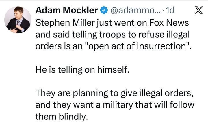 Military is well aware, politicians talking down to them is not a good look.No one said there was an unlawful order, although that may be the case. Their video was simply information reminding the brave men and women in the military that they must not follow an unlawful order. You should watch it. All the lawmakers in the video are ex-military or intelligence, so they know the rules.